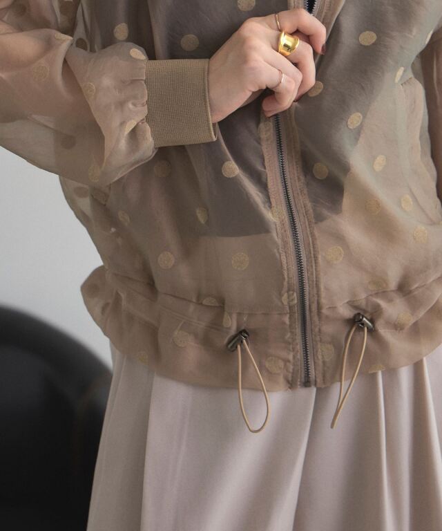 | 商品説明 | : | 軽い素材感で様々なシーンの羽織にぴったり!シアードットブルゾン シアー素材で軽く羽織れるから、肌寒い日や冷房対策にも使えるシアードットブルゾン。 ドットデザインがあることで、シンプルな羽織りとは差をつける、1枚で洒落感も作れるアイテムです◎ ノースリーブアイテムの羽織りもよし、インナーを入れてトップスのように着ても可愛い! |