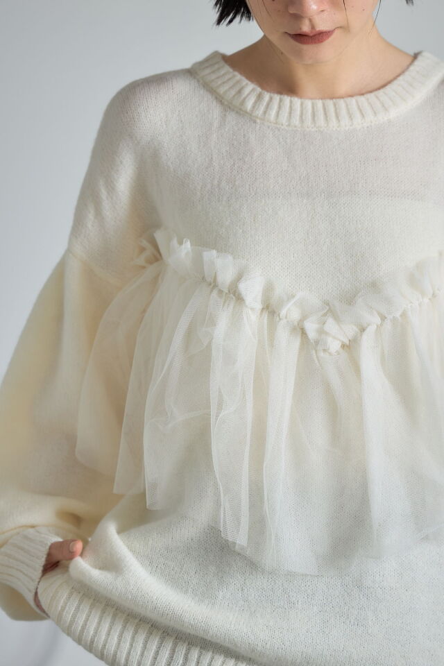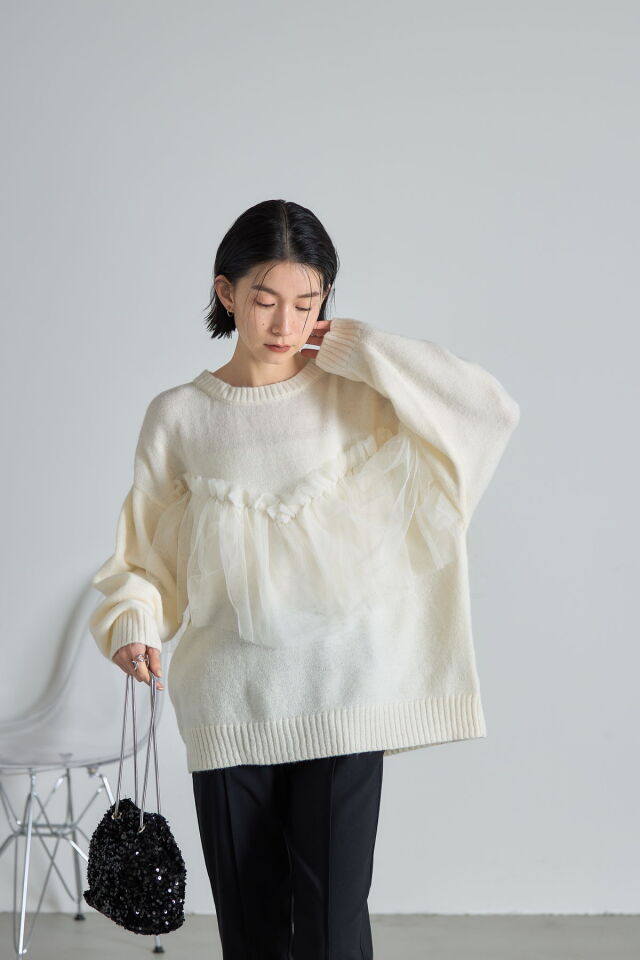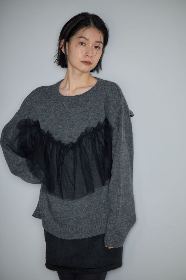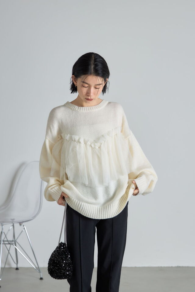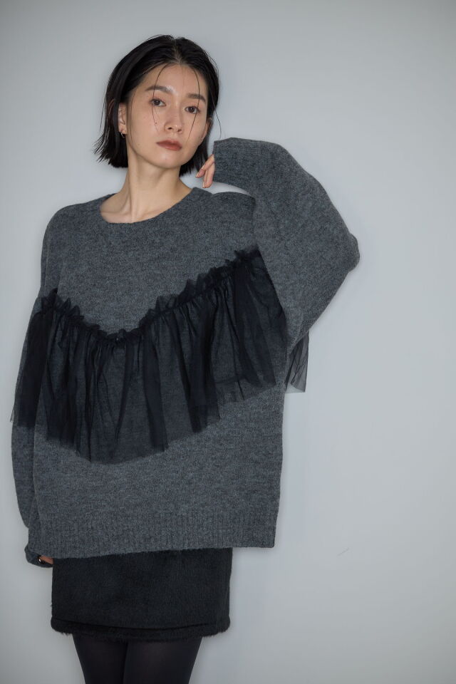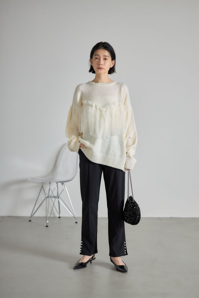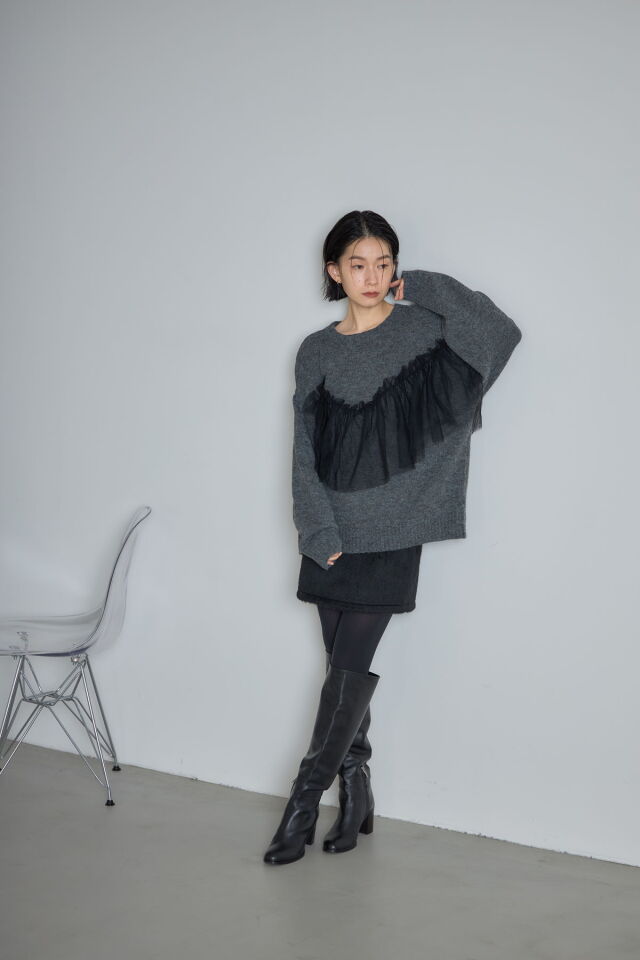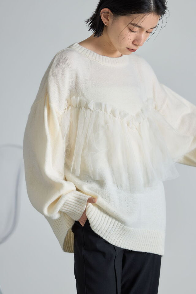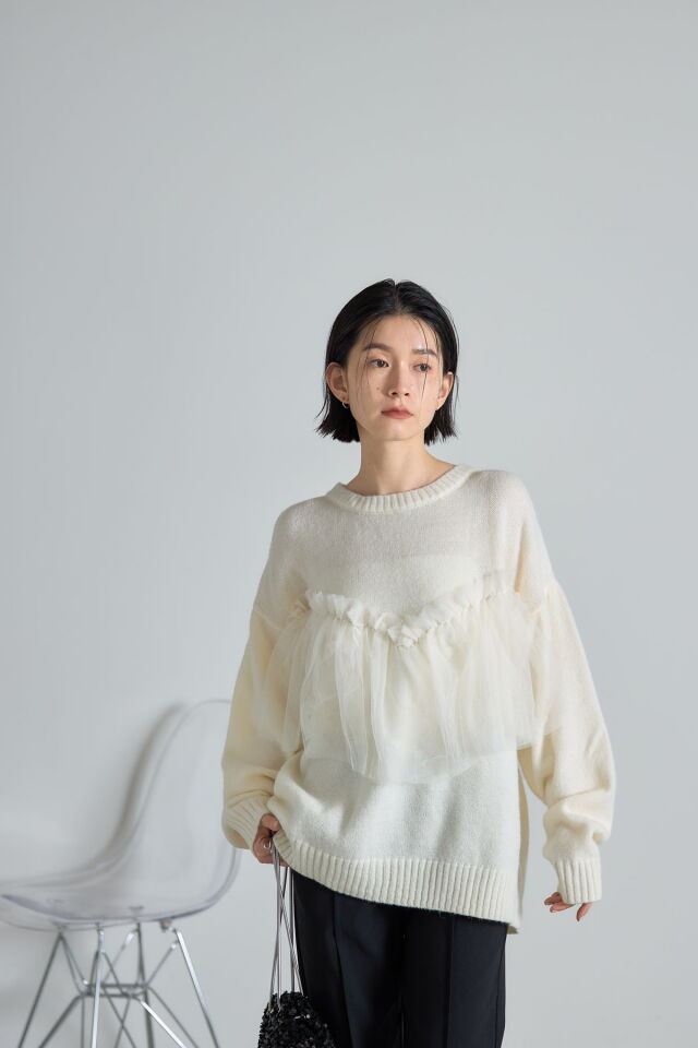 | 素材 | : | 本体/アクリル45% ポリエステル30% ナイロン25% チュール/ポリエステル100% (中国製・伸縮性あり・透け感なし・裏地なし) |
