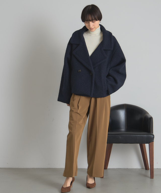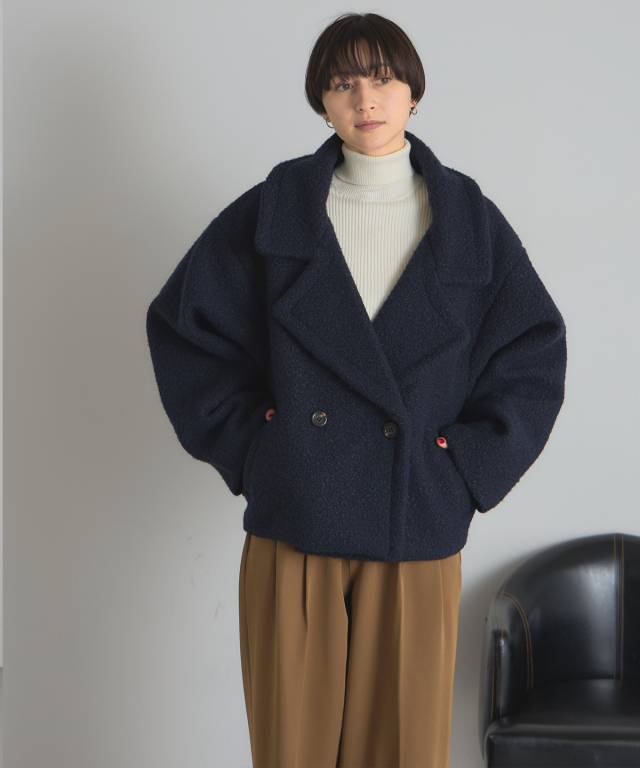 | 商品説明 | : | ボリューム感と軽やかさを両立した、旬のショート丈コート。 柔らかなブークレ素材で仕立てたショート丈のコート。 ボリューム感のあるシルエットながらも、軽やかな着心地で、寒い季節でも快適に過ごせます。 大きめのラペルとダブルボタンが上品なアクセントに。 カジュアルなデニムとも相性抜群で、デイリーコーデに程よい華やかさをプラスしてくれる一枚です。 インナー次第でロングシーズン活躍する万能アウター。 |
