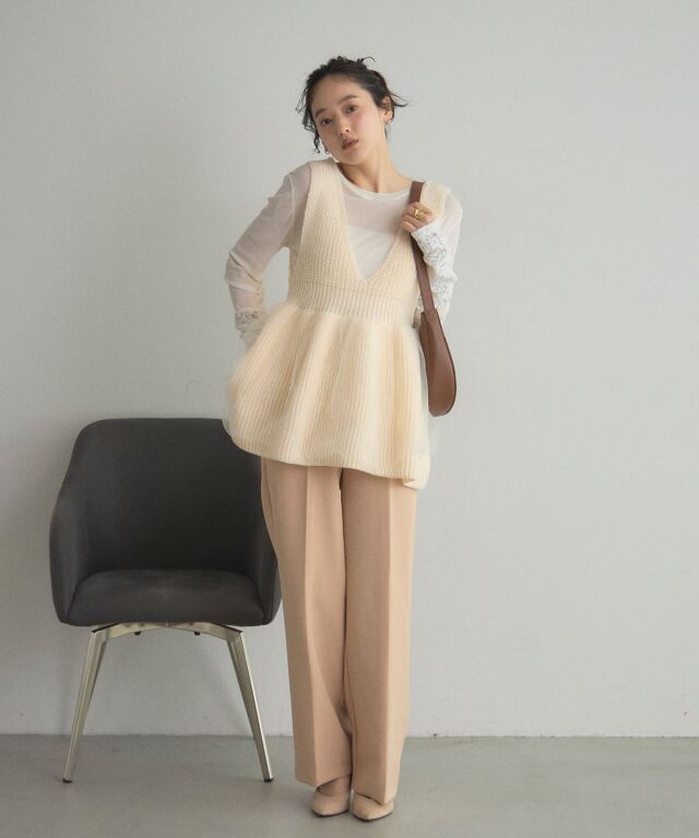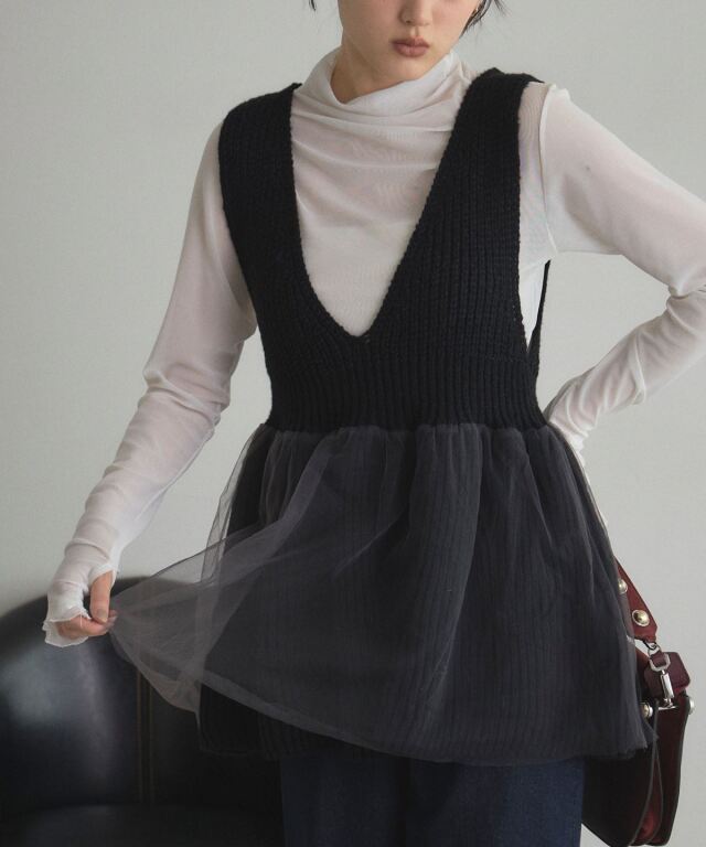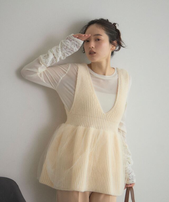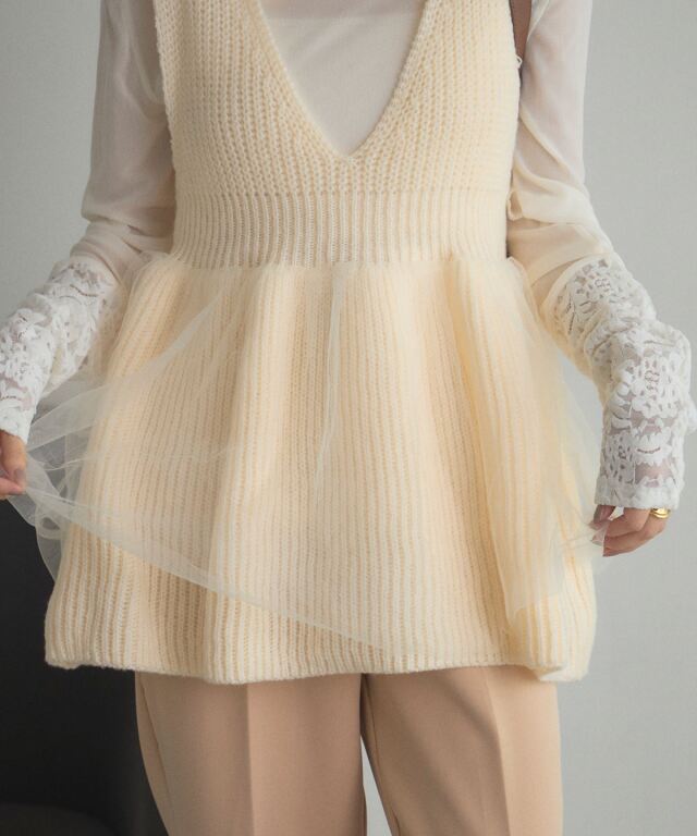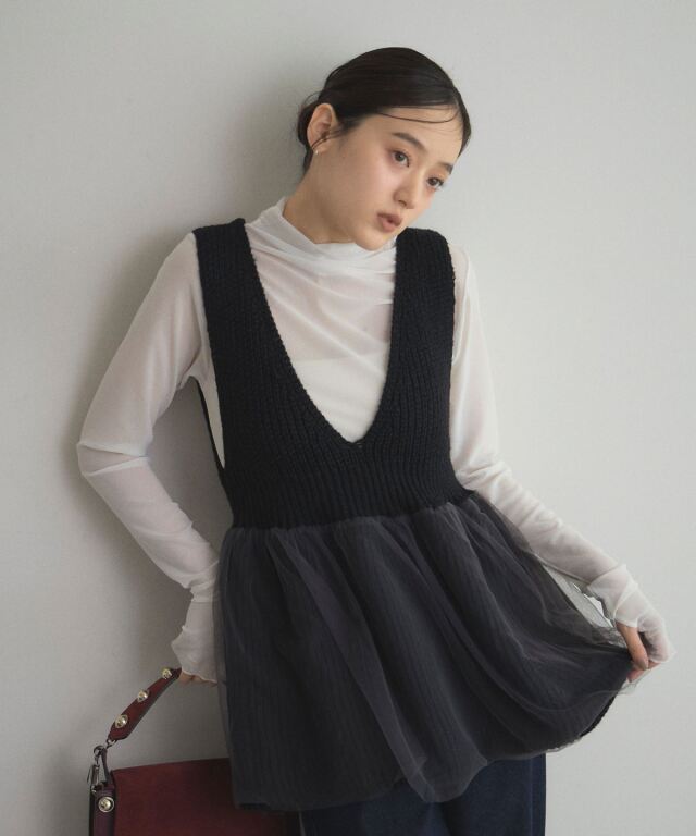 | 商品説明 | : | チュールの揺らめきで叶える、華やかフェミニンレイヤード ふんわりチュールを重ねたペプラムデザインが魅力のニットベスト。 立体感のあるシルエットが女性らしさを引き立てます。 ニットの柔らかさとチュールの軽やかさが絶妙にマッチ。 ブラウスやカットソーに重ねるだけで、スタイリングが完成。 1枚で旬のレイヤードスタイルを楽しめる主役級アイテムです。 |