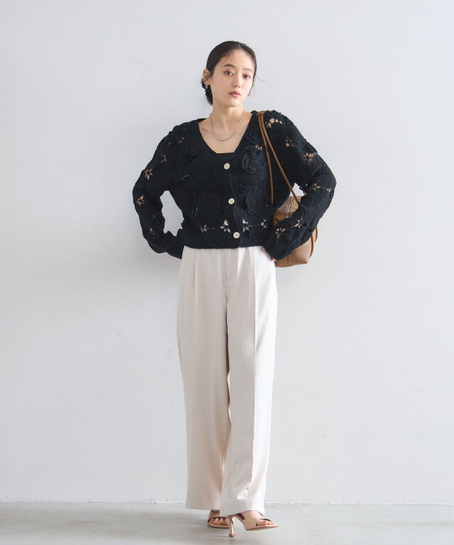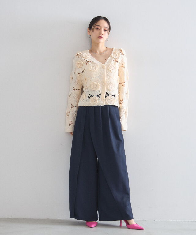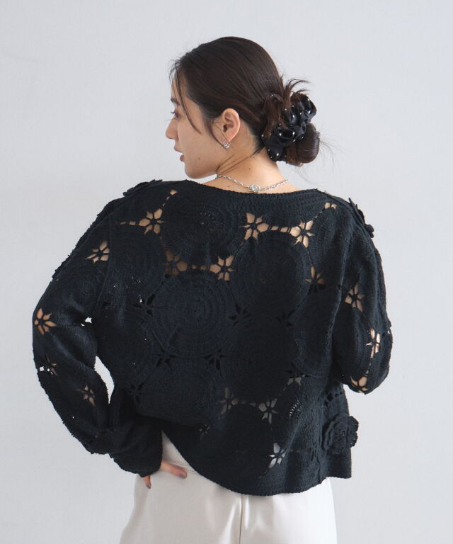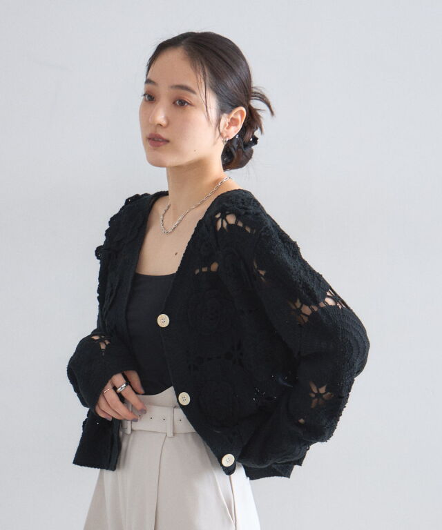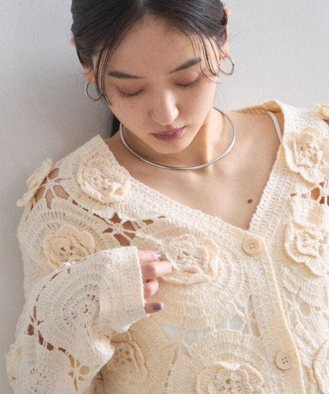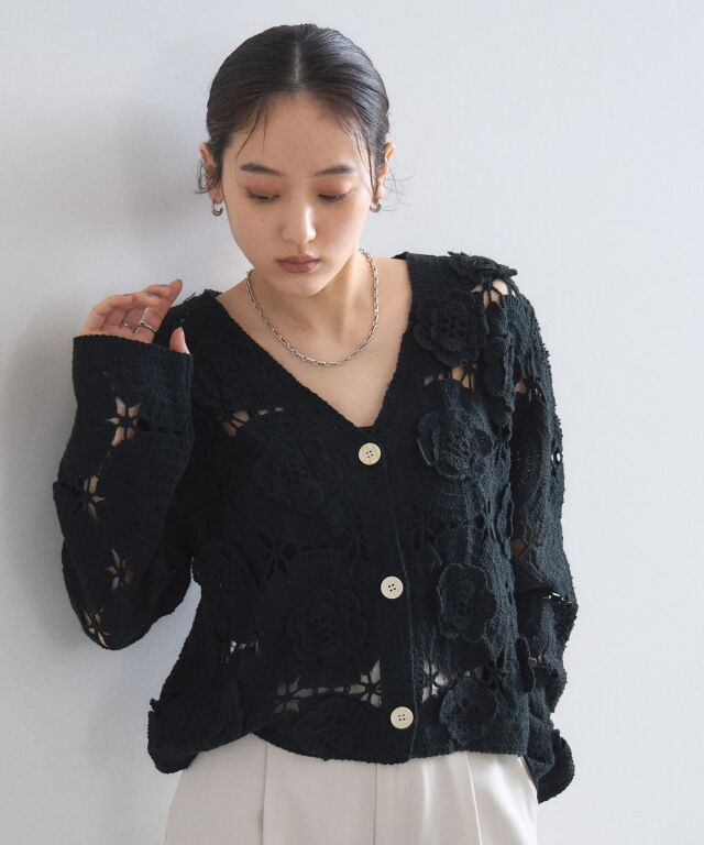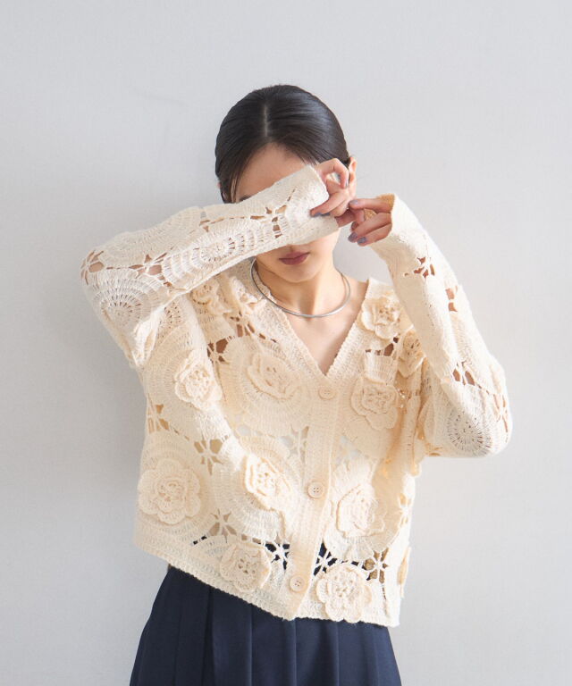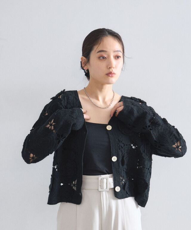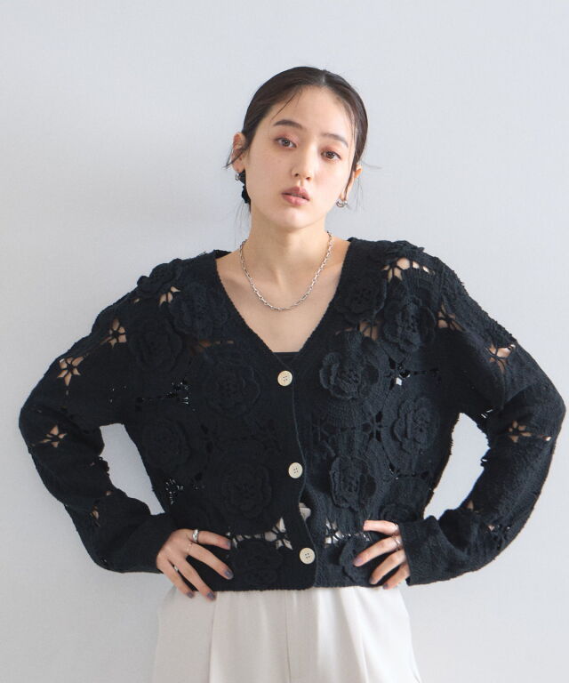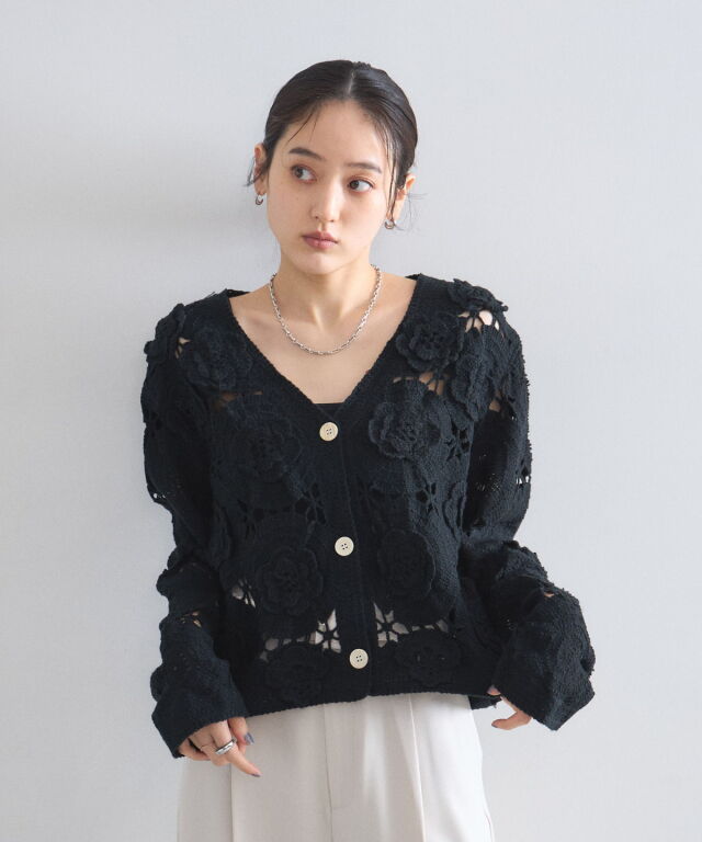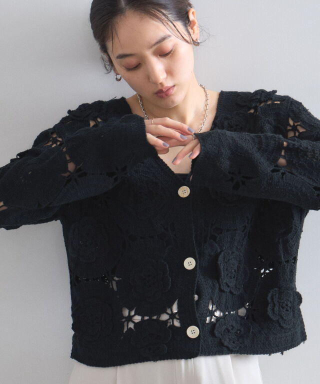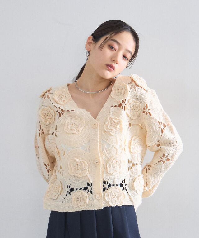 | 商品説明 | : | 立体的なフラワーモチーフが視線を奪う、主役級のクロシェ編みカーディガン。 全面に施された大ぶりの花柄編みが、ヴィンテージライクで華やかな印象を与えます。 ほどよい透け感が軽やかさを演出し、顔周りをすっきり見せるVネックデザインもポイント。 デニムでカジュアルに、スラックスで綺麗めにと、羽織るだけでトレンド感のあるスタイリングが完成します。 |