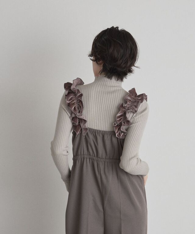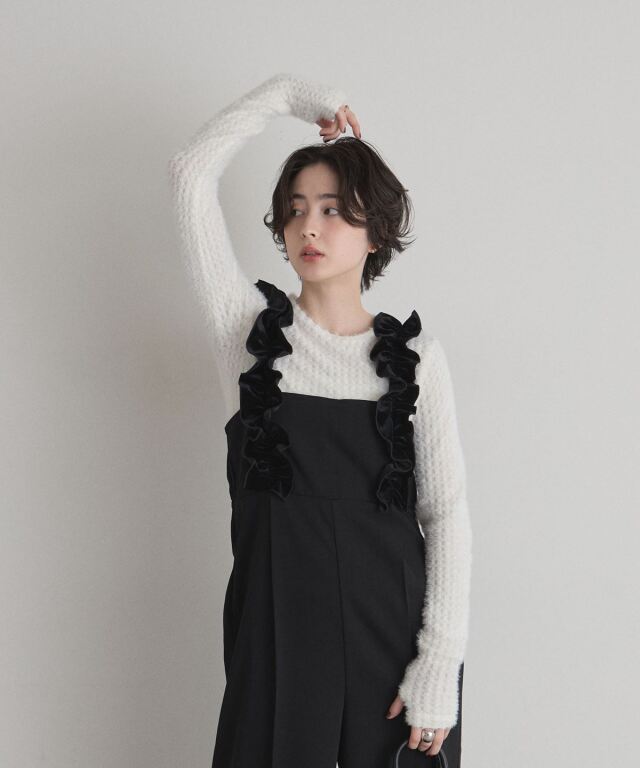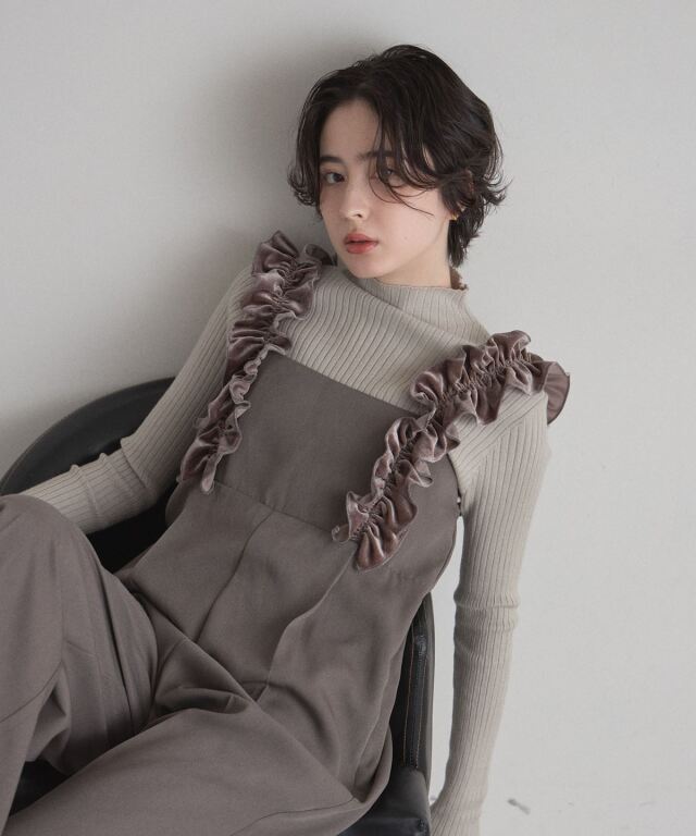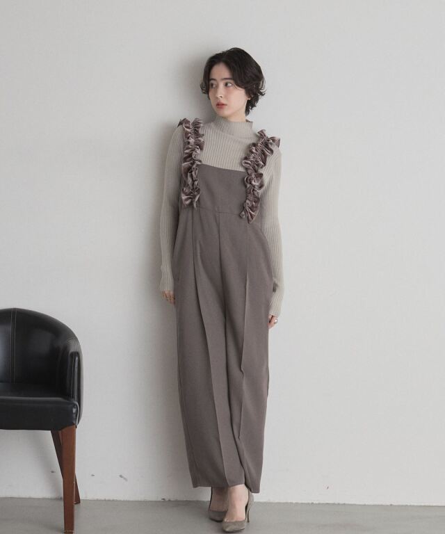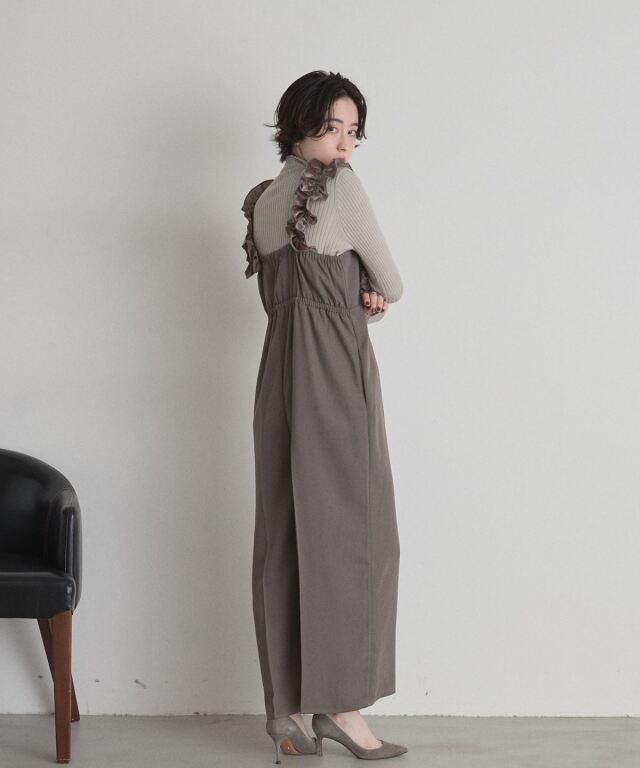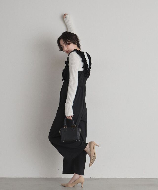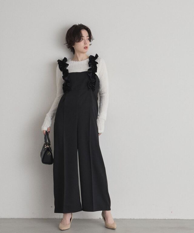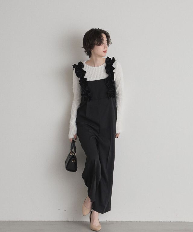 | 商品説明 | : | 甘さと上品さをひとさじ。日常を華やぐフリルサロペット。 肩まわりにあしらった立体的なフリルが、着るだけで気分を上げてくれるサロペット。 華やかなディテールながら、落ち着いたトーンとすとんと落ちるワイドストレートシルエットで、 大人が取り入れやすいバランスに仕上げています。 胸下の切り替えがスタイルアップを演出し、インナー次第で季節を問わず着回せるのも魅力。 ニットやブラウスを合わせるだけで、メリハリのあるフェミニンスタイルが完成する一着です。 |