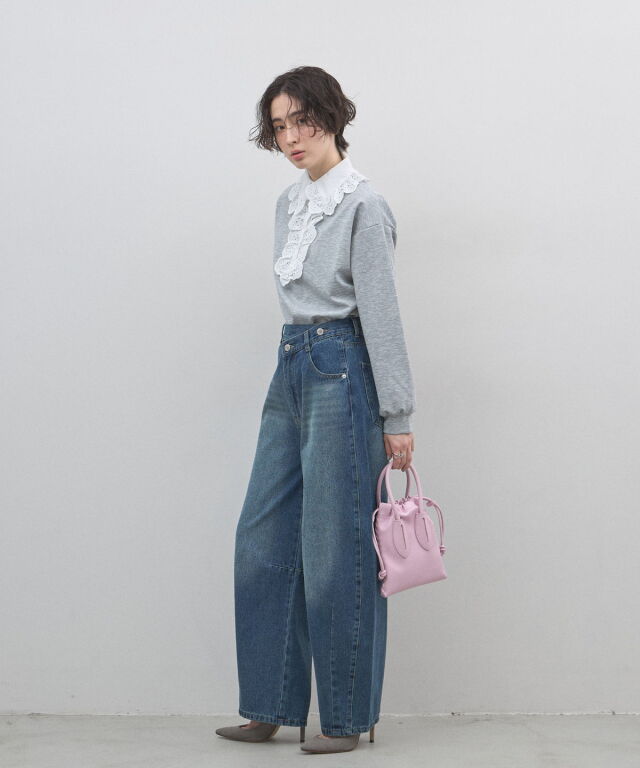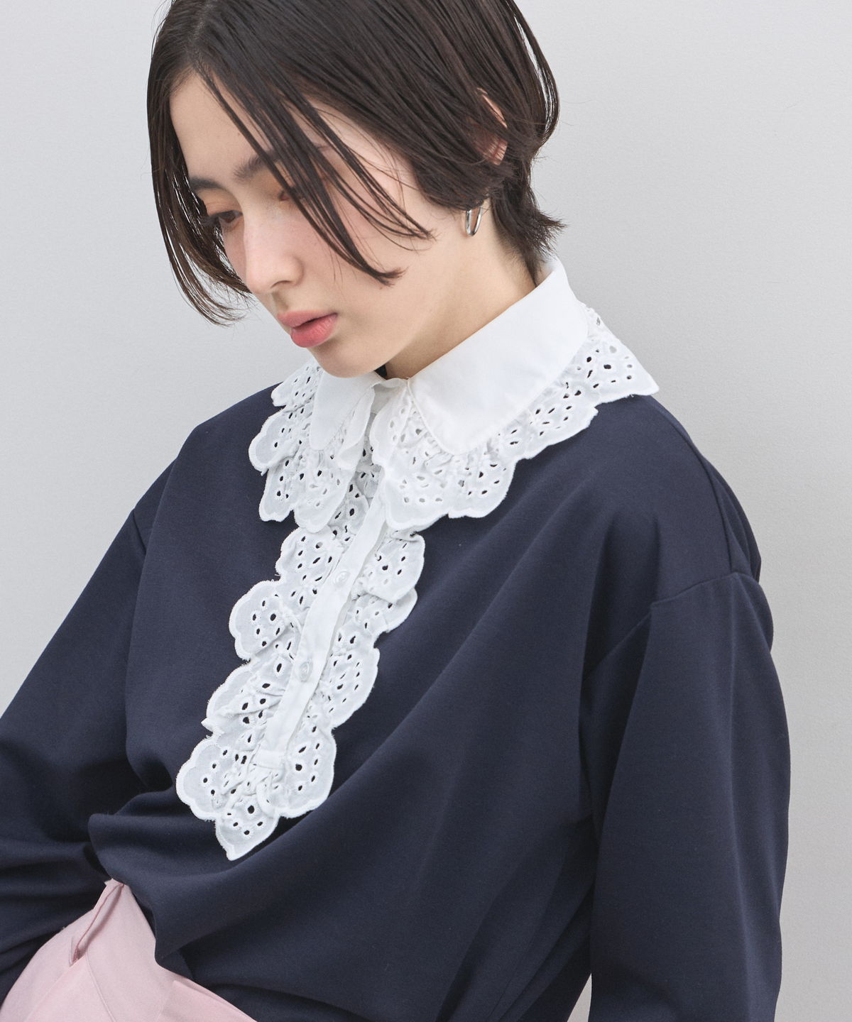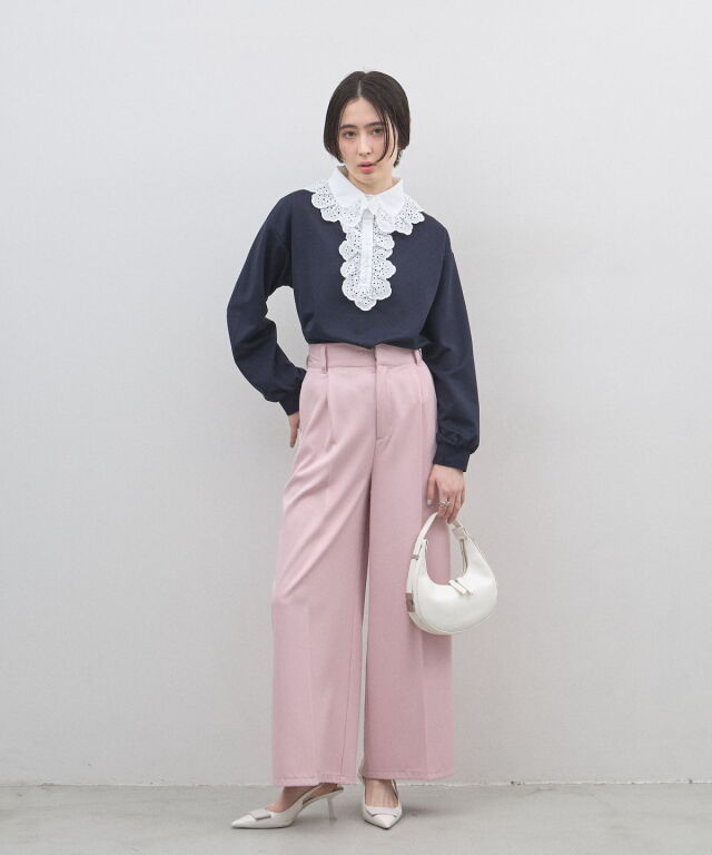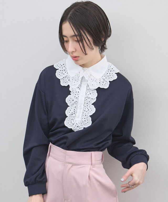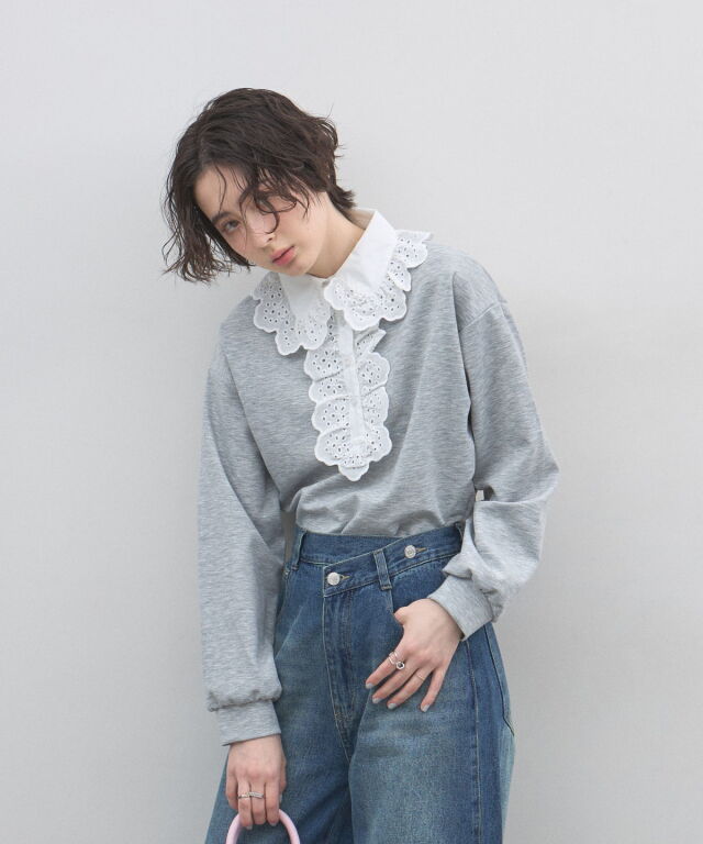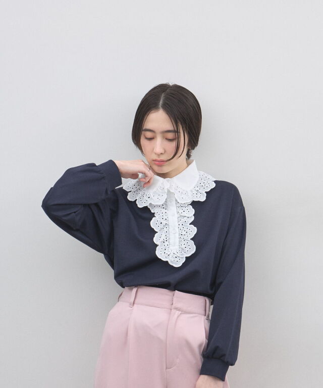 | 商品説明 | : | カジュアルを可憐にアップデート。贅沢な刺繍レースが視線を奪う、主役級プルオーバー。 繊細なアイレット刺繍の襟元が目を惹く、デザインプルオーバー。 顔周りを華やかに彩る大ぶりなフリルレースと、リラクシーなカットソー素材を組み合わせることで、 甘すぎない「大人可愛い」絶妙なバランスを実現しました。 ヴィンテージライクな襟のデザインは、一枚での着用はもちろん、 カーディガンやジャケットから襟を出したレイヤードスタイルにも最適。 身頃は柔らかな風合いで着心地も良く、デニムでカジュアルダウンしても、 スカートできれいめにまとめても様になります。いつもの装いに遊び心を添えてくれる、特別な一枚です。 |