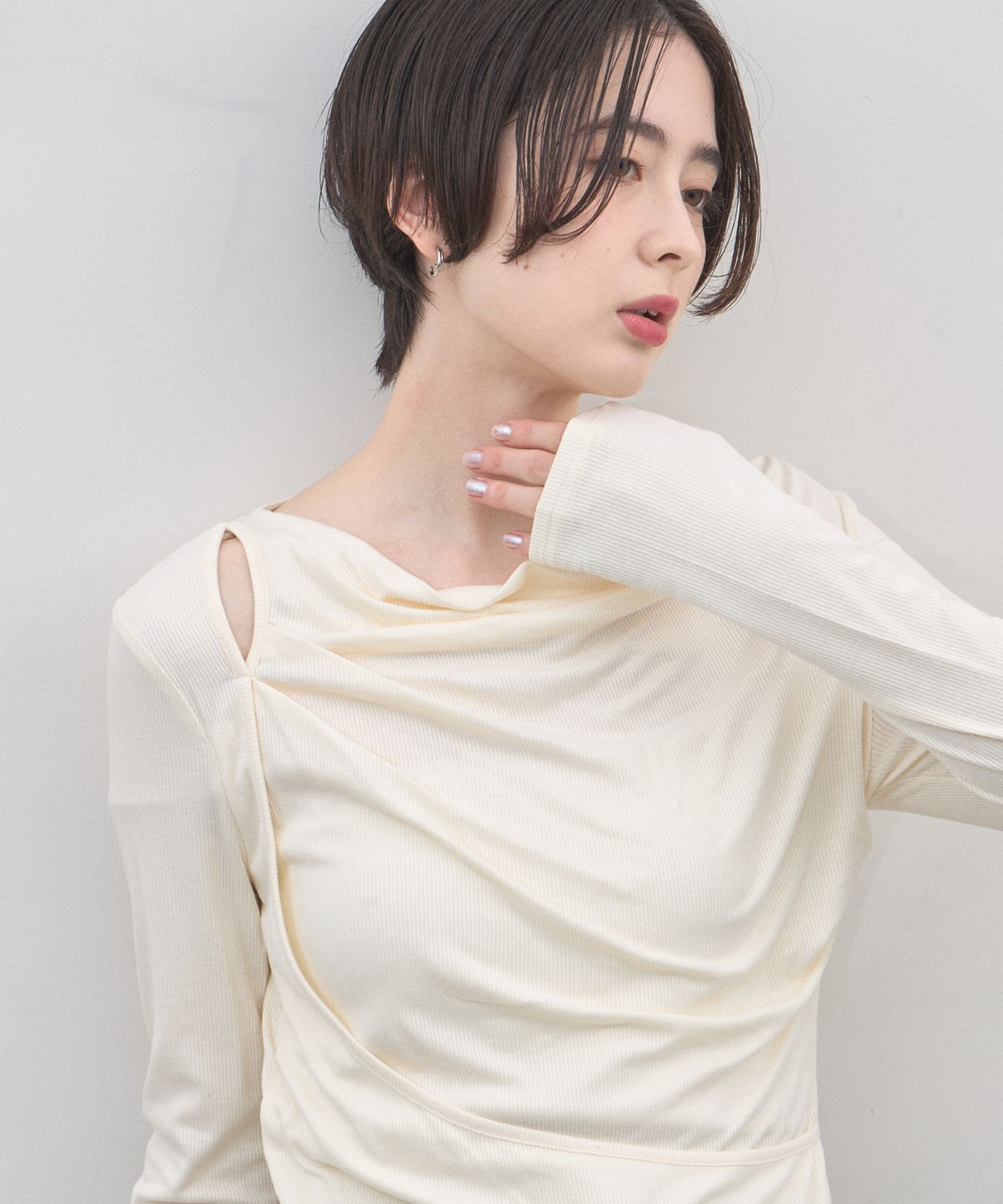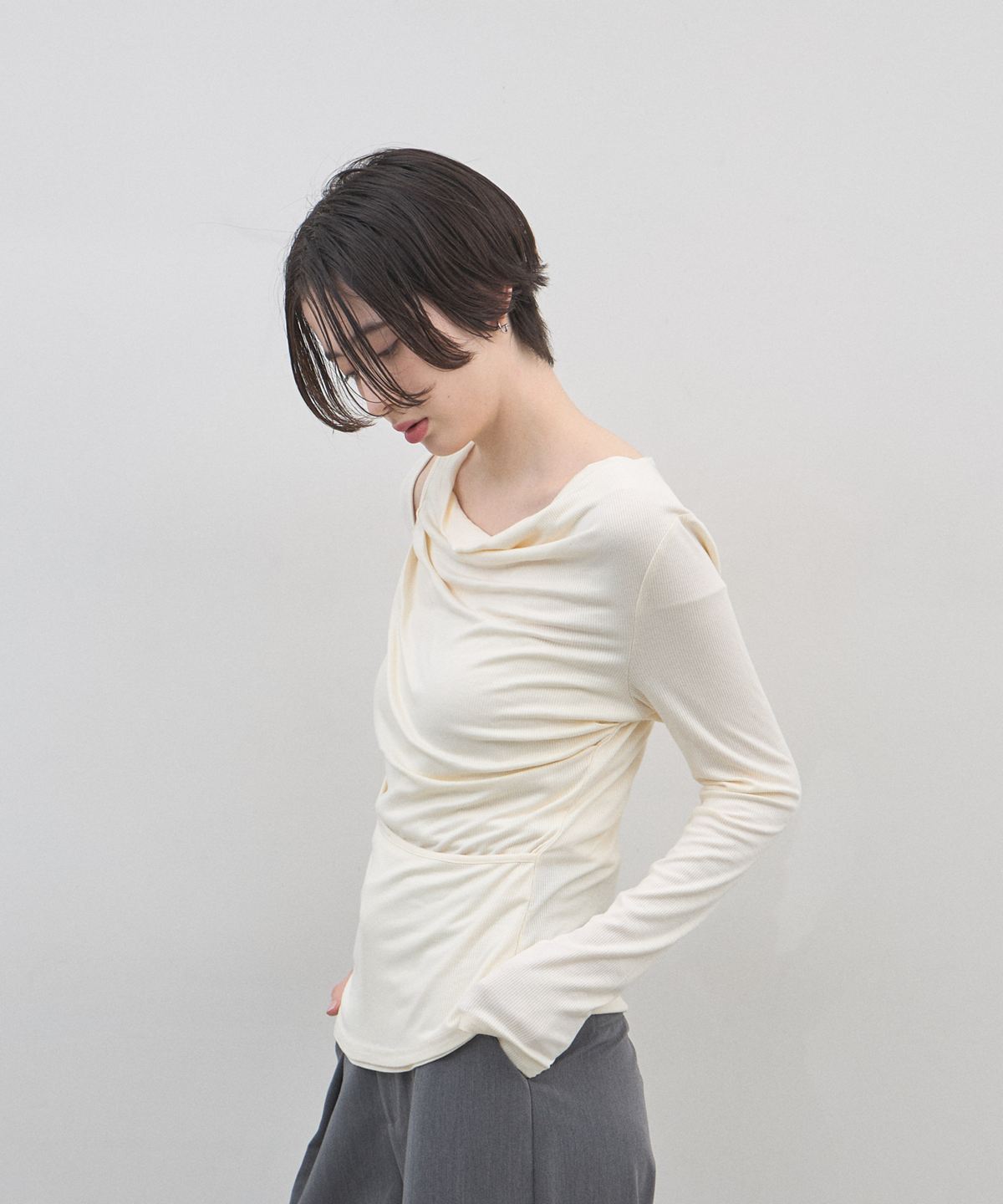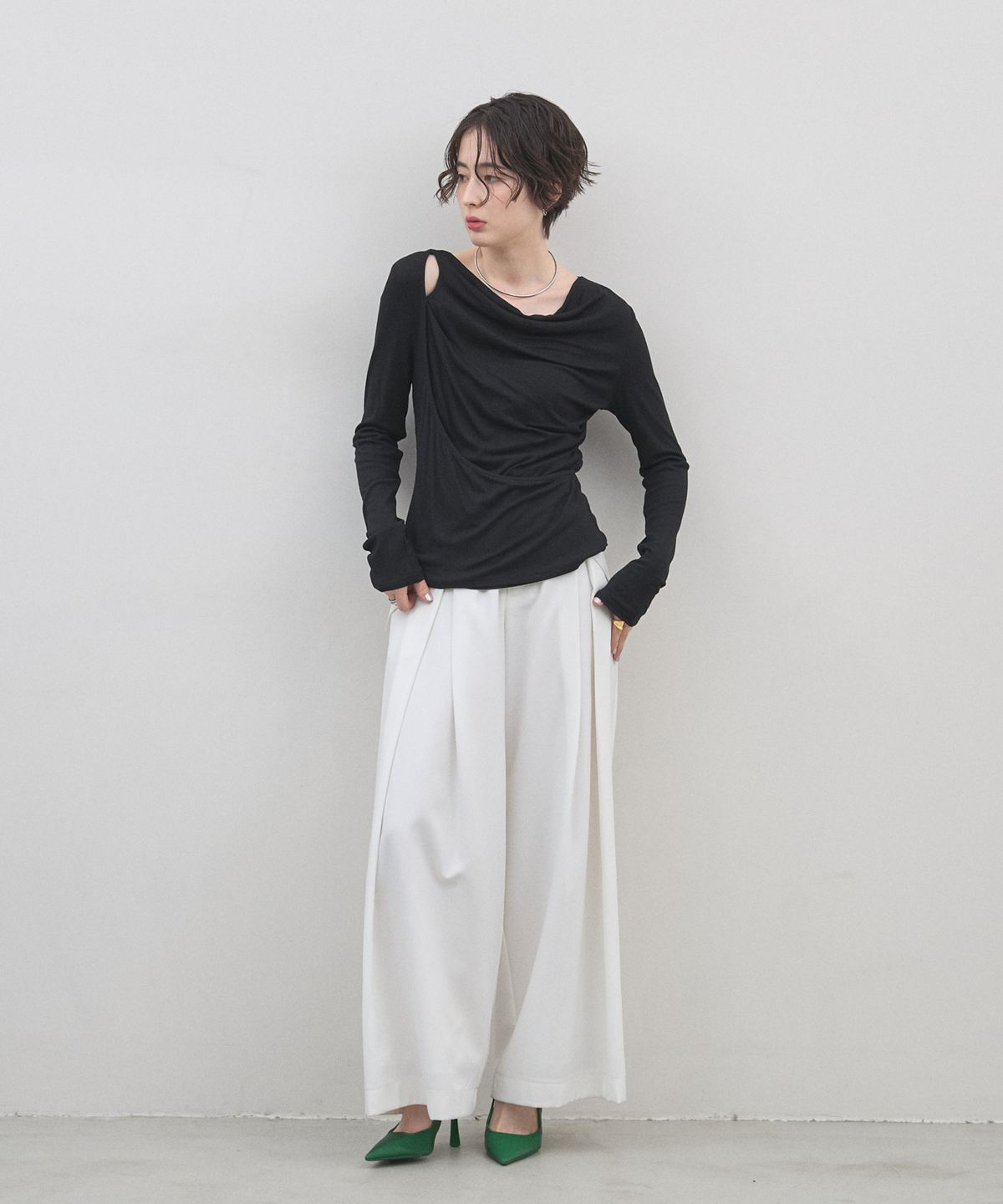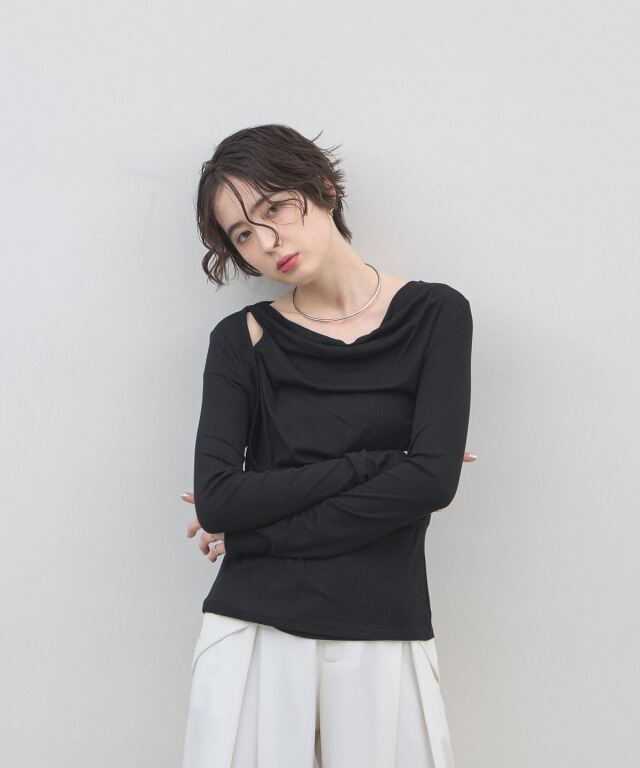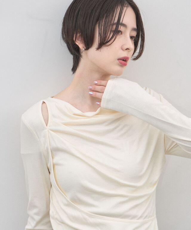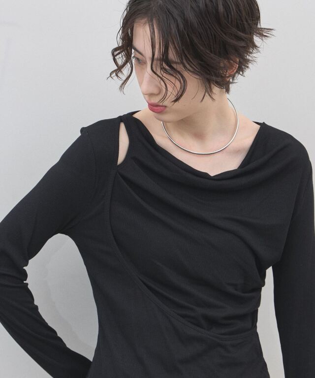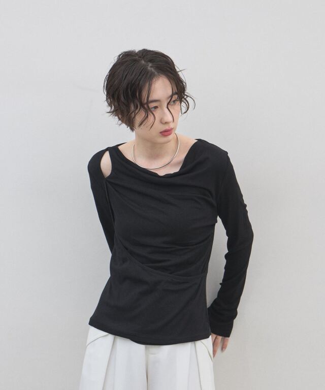 | 商品説明 | : | 静かなる個性を纏う。ドレープが描く、アシンメトリーな美学。 計算されたネックラインの弛みと、複雑に重なり合うレイヤードデザインが目を惹く変形カットソー。 柔らかな素材感が、エッジの効いたアシンメトリーなディテールを優しく引き立て、 モードながらも親しみやすい柔和な表情を演出します。 肩口にさりげなく施されたカットアウトが、ヘルシーな抜け感をプラス。 しっとりと肌に馴染むストレッチ素材を採用し、タイトなシルエットながらもリラクシーな着心地を実現しました。 スラックスと合わせれば、都会的で洗練されたニュアンススタイルが即座に完成します。 |