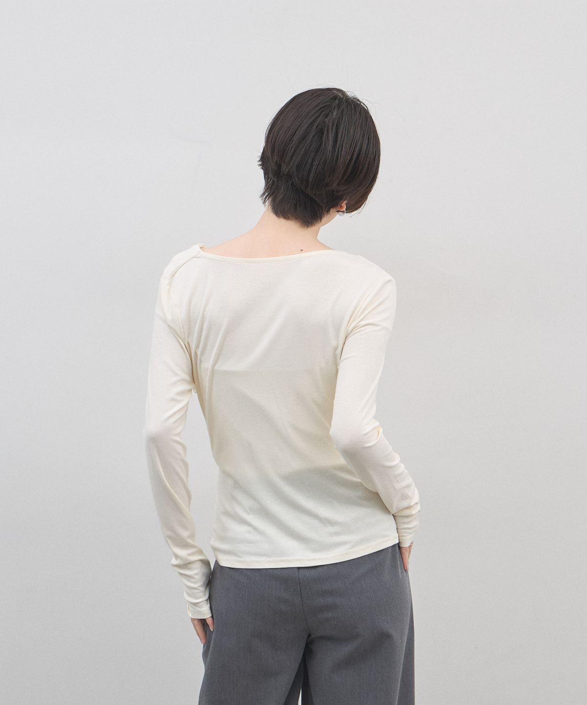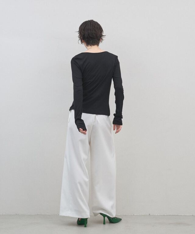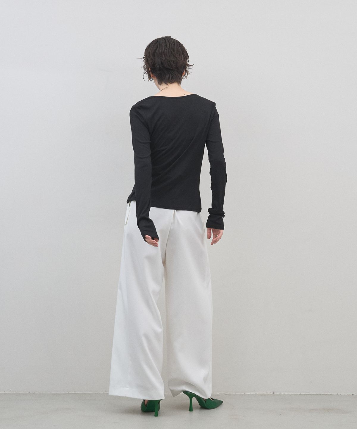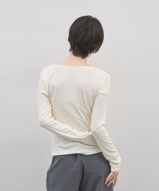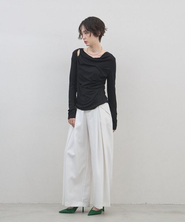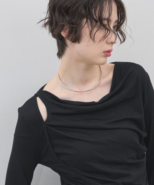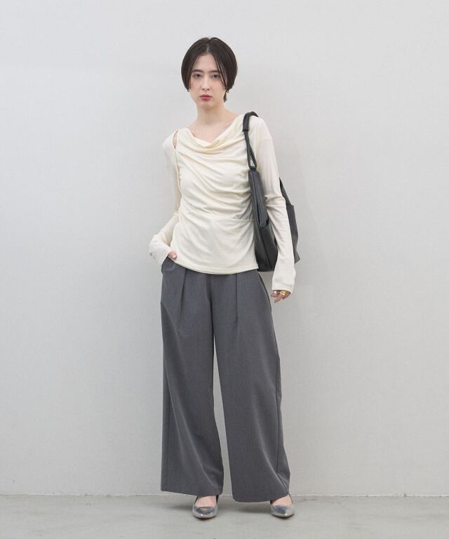 | 商品説明 | : | 静かなる個性を纏う。ドレープが描く、アシンメトリーな美学。 計算されたネックラインの弛みと、複雑に重なり合うレイヤードデザインが目を惹く変形カットソー。 柔らかな素材感が、エッジの効いたアシンメトリーなディテールを優しく引き立て、 モードながらも親しみやすい柔和な表情を演出します。 肩口にさりげなく施されたカットアウトが、ヘルシーな抜け感をプラス。 しっとりと肌に馴染むストレッチ素材を採用し、タイトなシルエットながらもリラクシーな着心地を実現しました。 スラックスと合わせれば、都会的で洗練されたニュアンススタイルが即座に完成します。 |