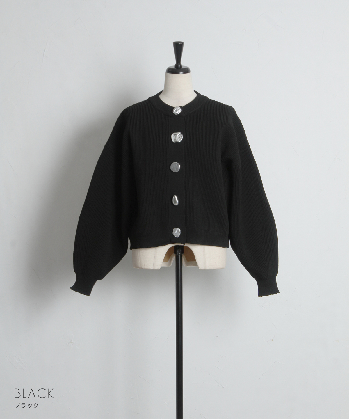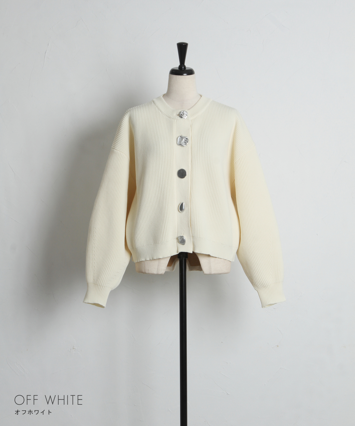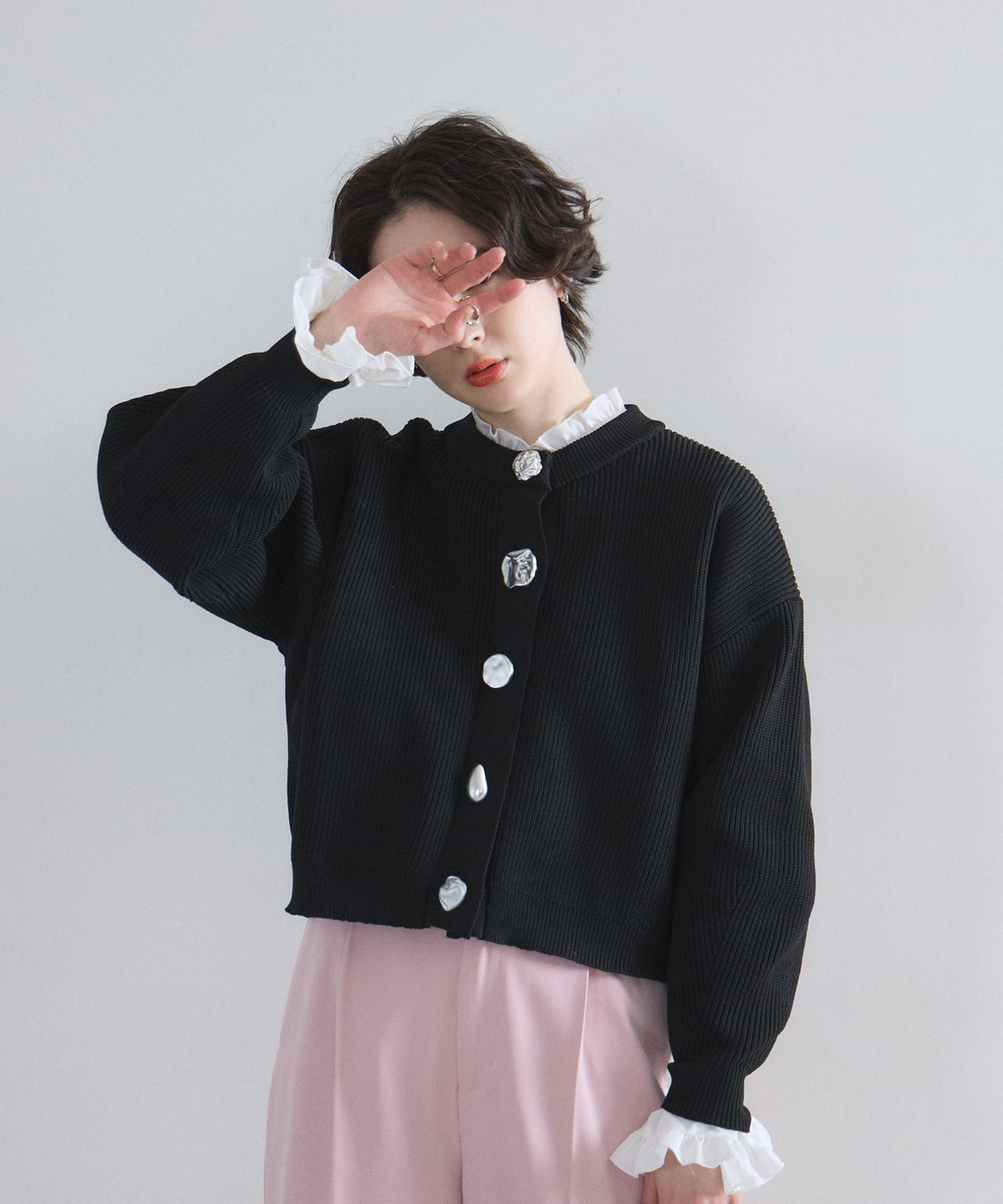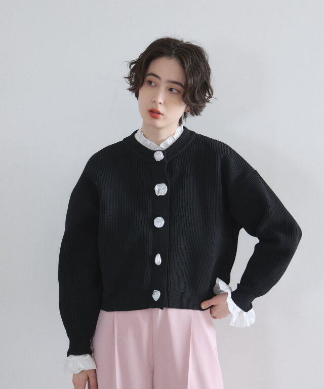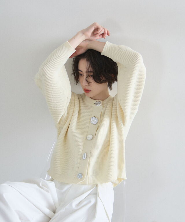 | 商品説明 | : | モードに魅せる主役級カーディガン アンティーク調の変形シルバーボタンが目を惹く、存在感抜群の一着。 ボリューム感のあるパフスリーブと、程よい厚みのリブ編みが、 女性らしい立体的なシルエットを描きます。 コンパクトな着丈はハイウエストのボトムスとも相性が良く、 羽織るだけで洗練されたモードな装いが完成します。 |