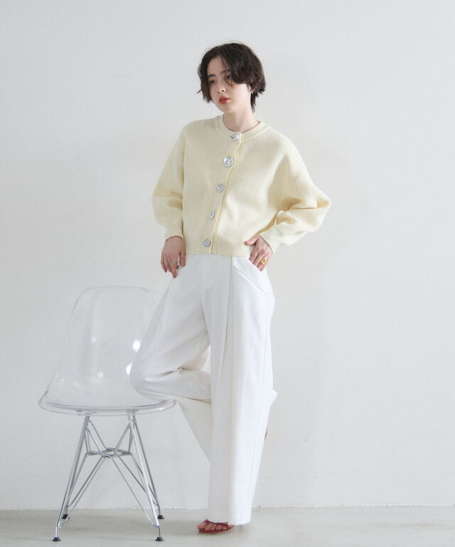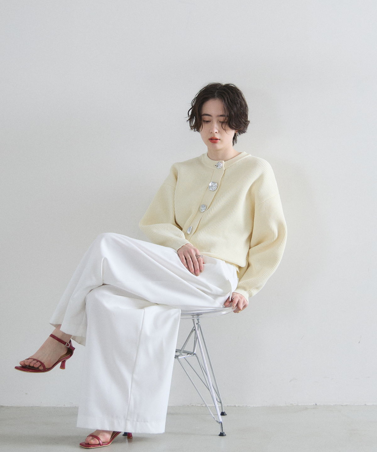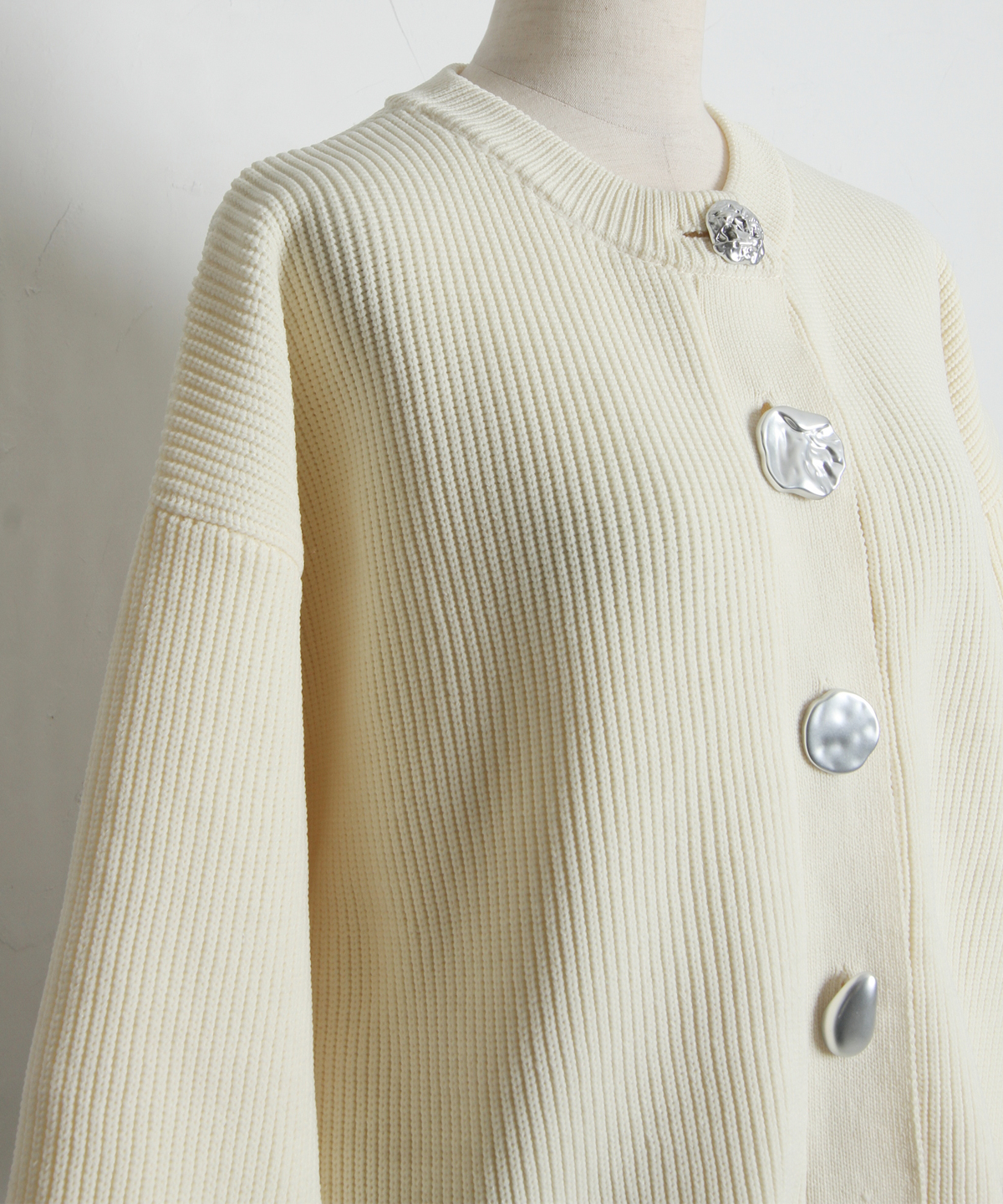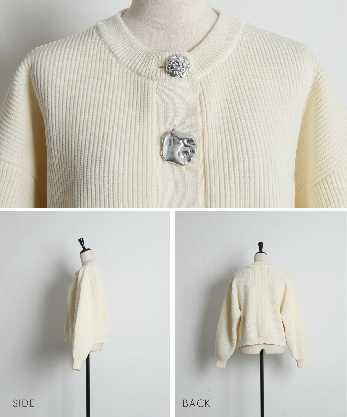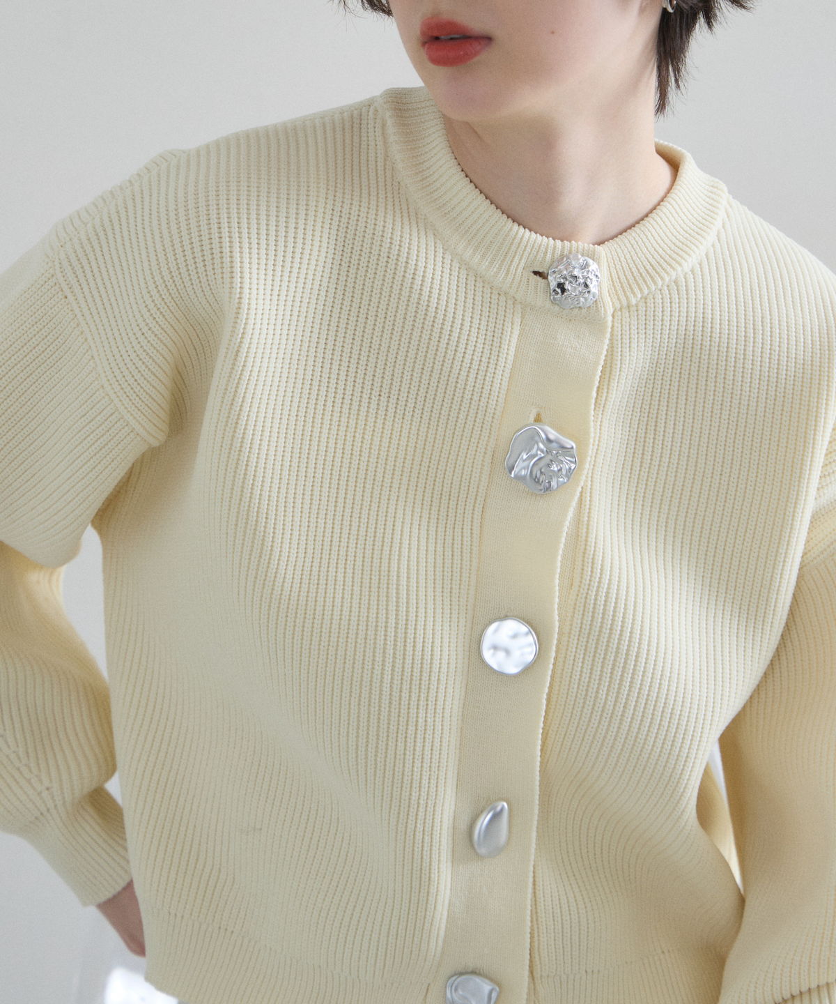 | 商品説明 | : | モードに魅せる主役級カーディガン アンティーク調の変形シルバーボタンが目を惹く、存在感抜群の一着。 ボリューム感のあるパフスリーブと、程よい厚みのリブ編みが、 女性らしい立体的なシルエットを描きます。 コンパクトな着丈はハイウエストのボトムスとも相性が良く、 羽織るだけで洗練されたモードな装いが完成します。 |