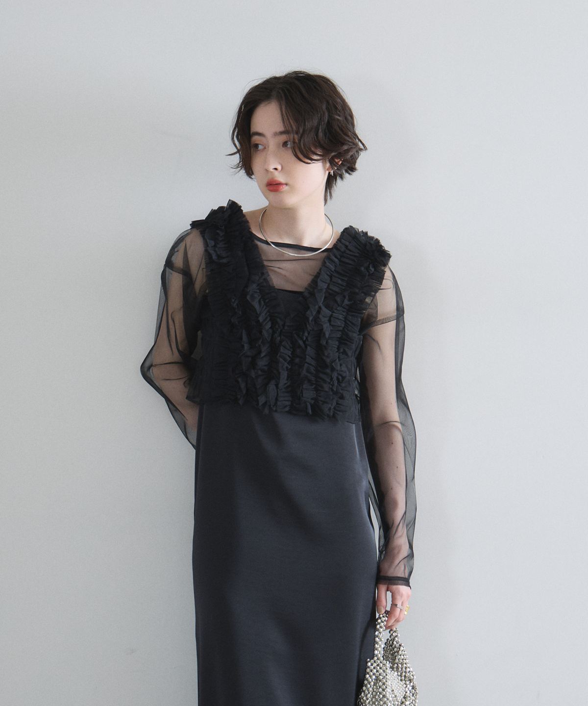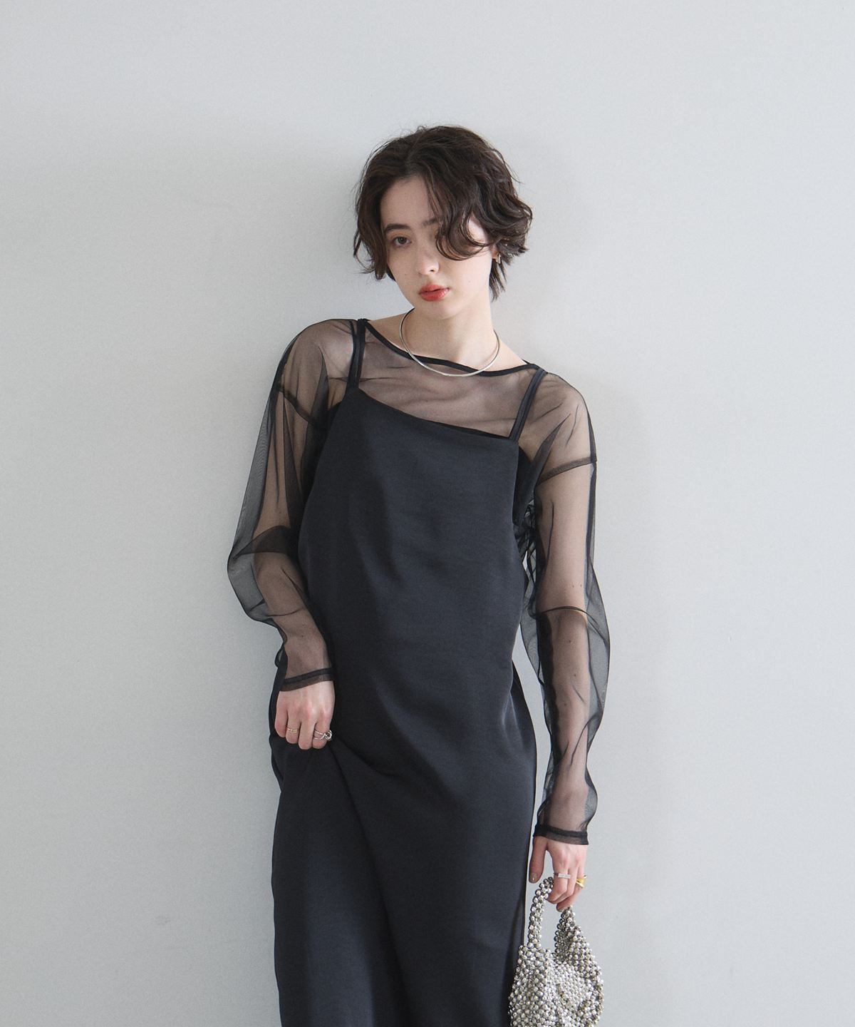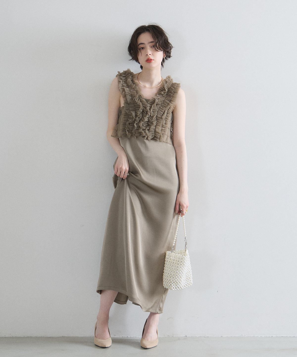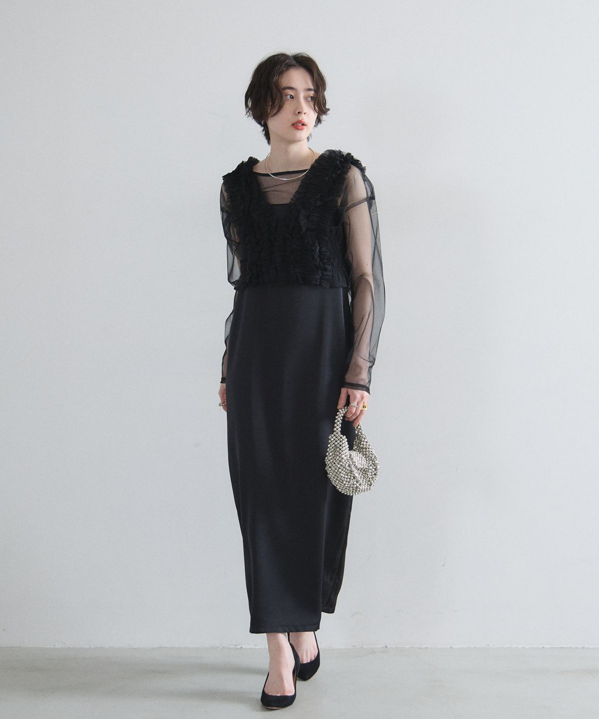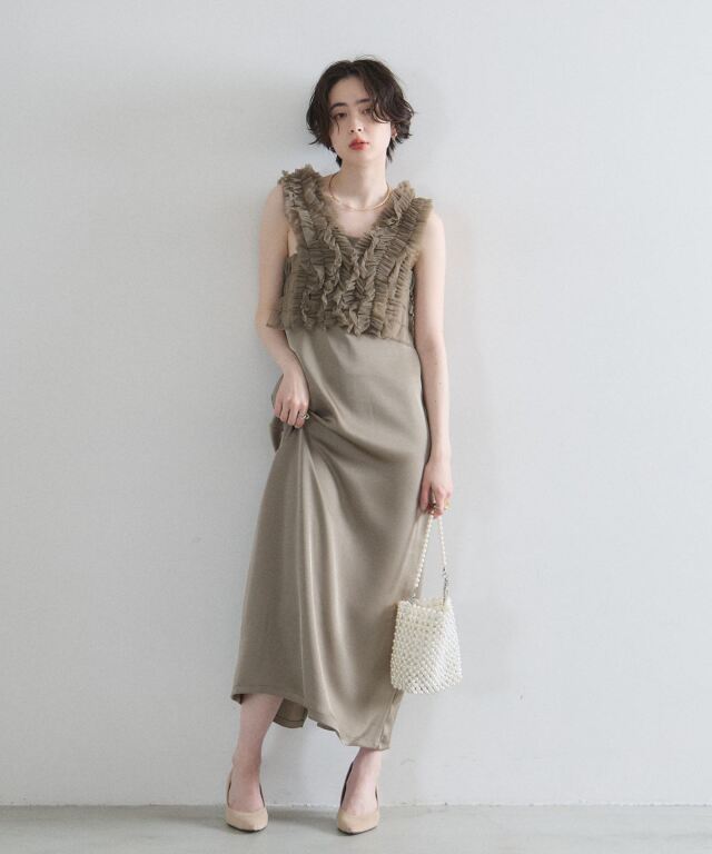 | 商品説明 | : | 繊細なチュールが描く奥行きとモードな抜け感、一着で洗練される主役級ワンピース。 シアー感のあるチュールトップスと、上品な光沢のキャミワンピースを重ねたセットアイテム。 フリル使いが目を惹くトップスは前後2WAYで着用でき、それぞれ単品使いも可能。 結婚式などのオケージョンから、デニムを合わせたデイリーな着こなしまで、日常にドラマチックな彩りを添えてくれます。 |