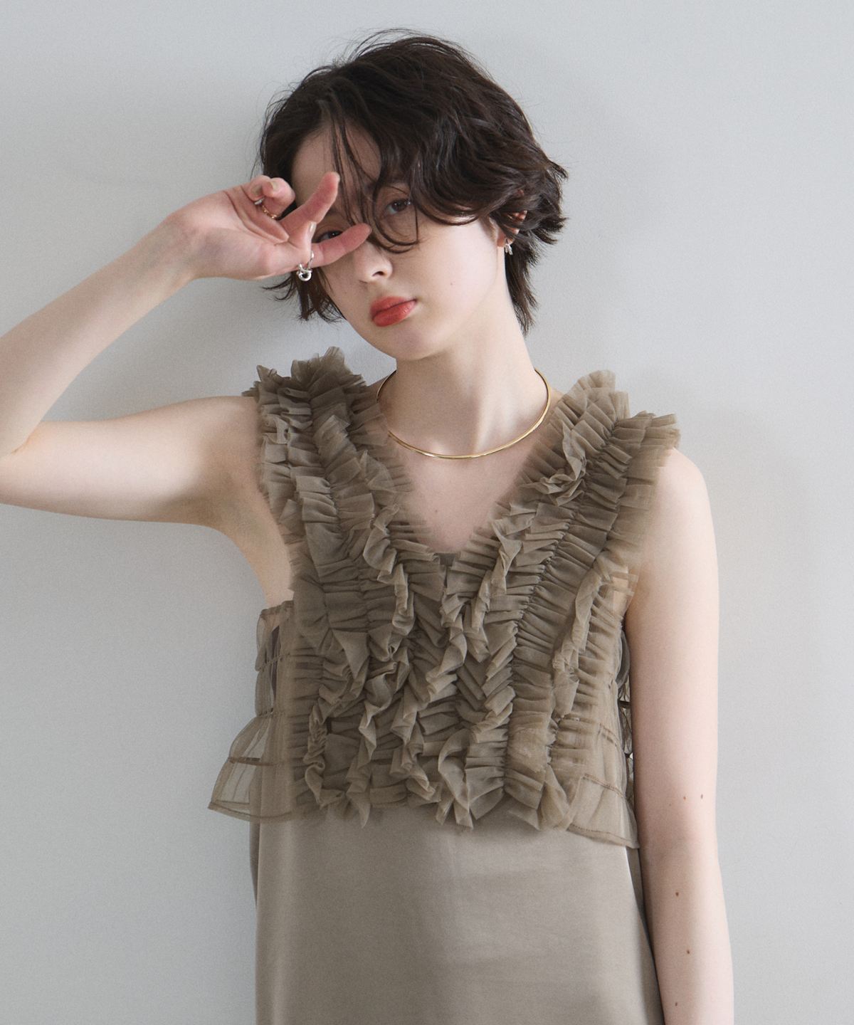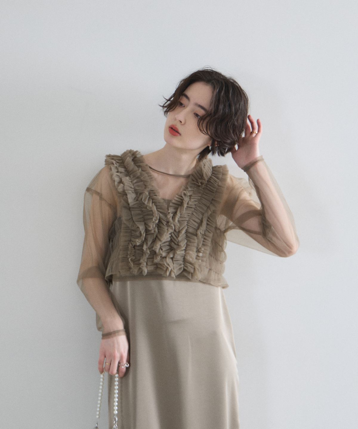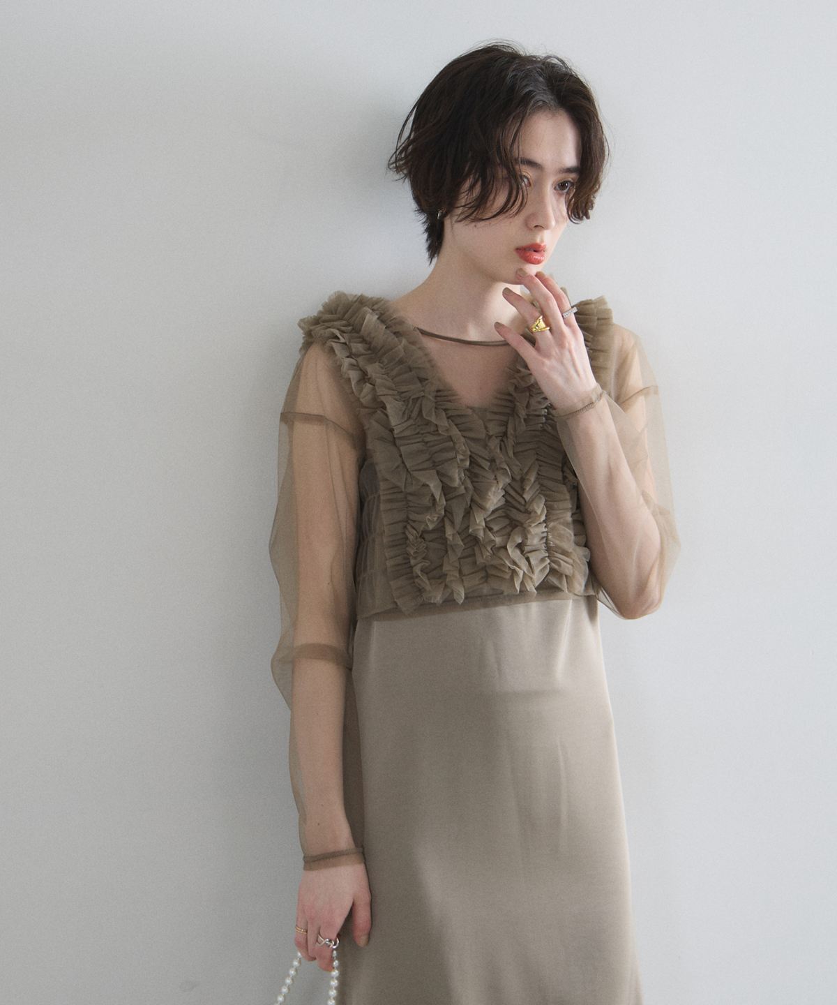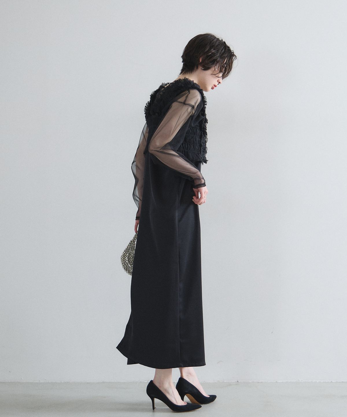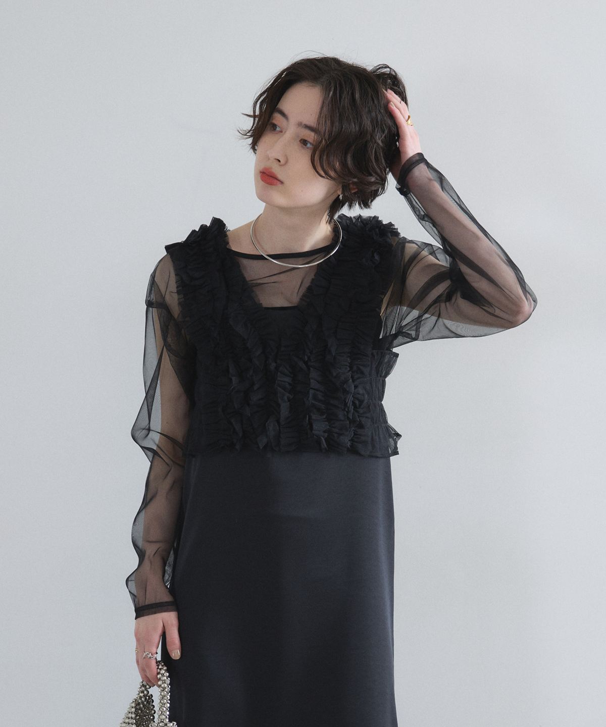 | 商品説明 | : | 繊細なチュールが描く奥行きとモードな抜け感、一着で洗練される主役級ワンピース。 シアー感のあるチュールトップスと、上品な光沢のキャミワンピースを重ねたセットアイテム。 フリル使いが目を惹くトップスは前後2WAYで着用でき、それぞれ単品使いも可能。 結婚式などのオケージョンから、デニムを合わせたデイリーな着こなしまで、日常にドラマチックな彩りを添えてくれます。 |