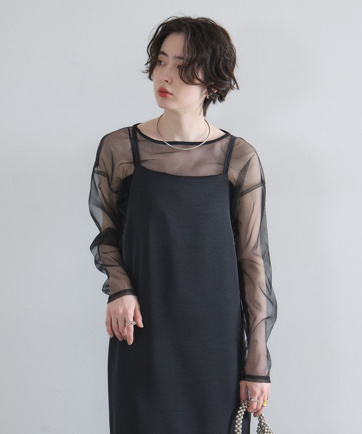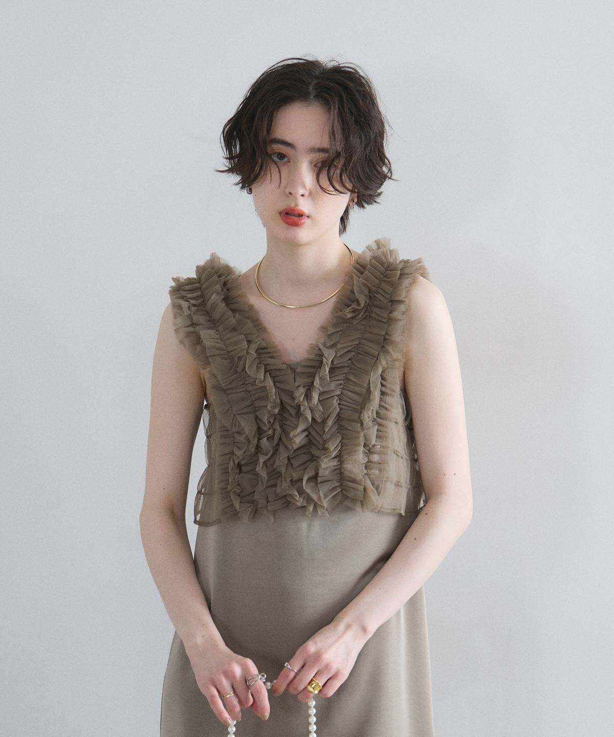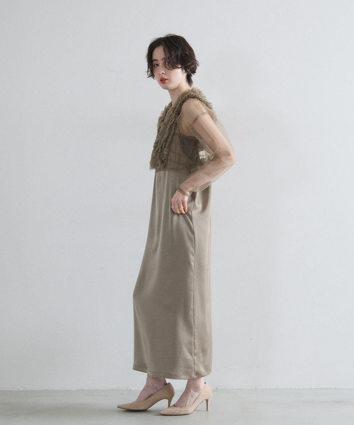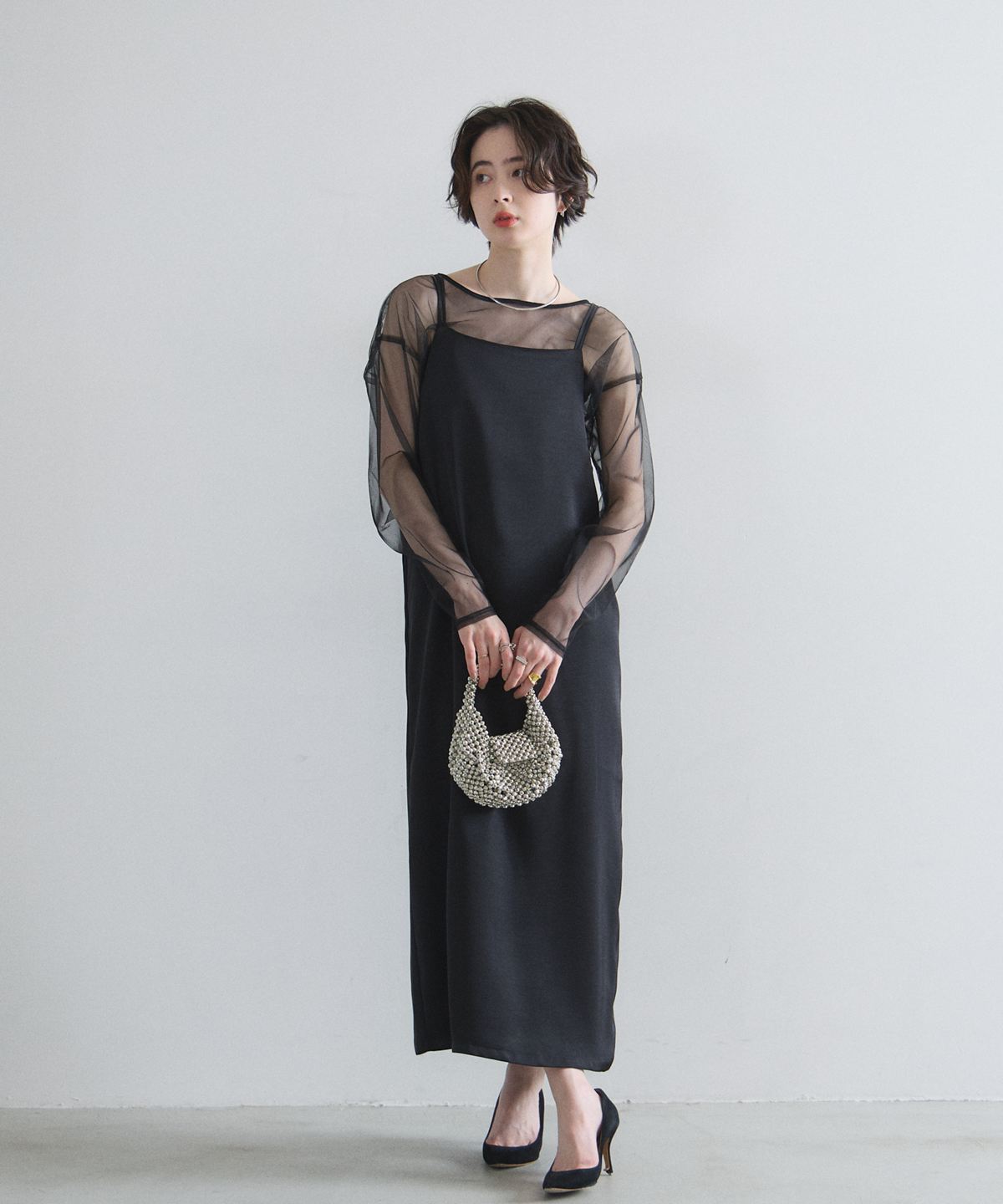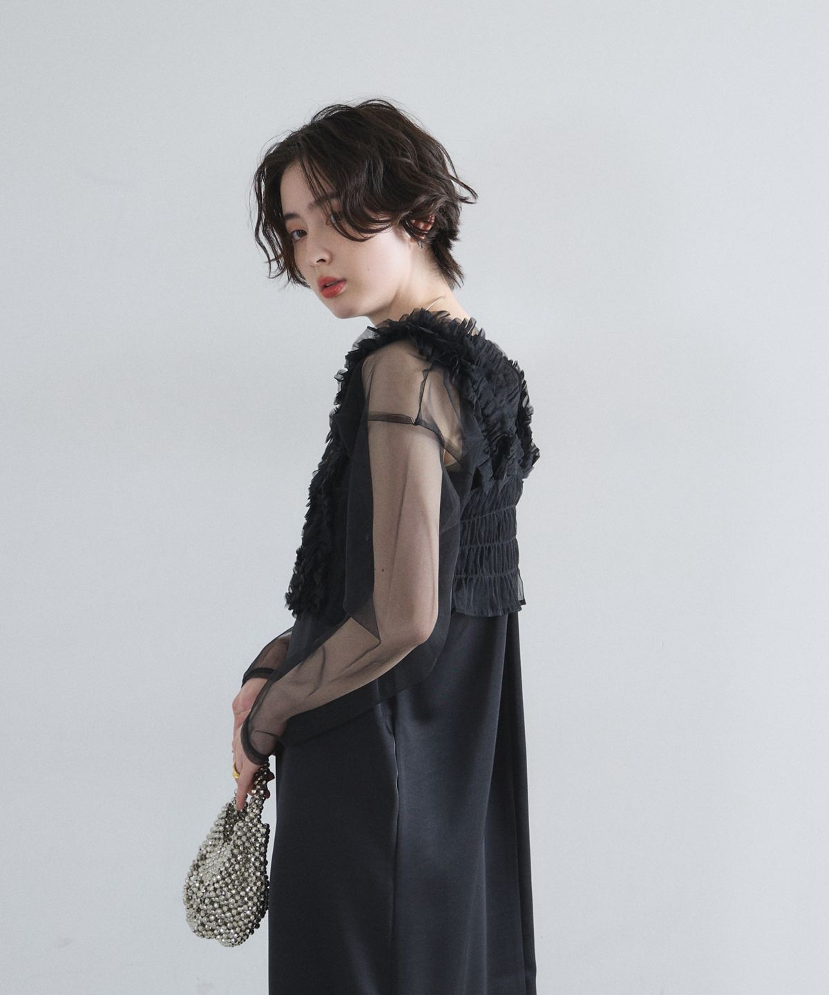 | 商品説明 | : | 繊細なチュールが描く奥行きとモードな抜け感、一着で洗練される主役級ワンピース。 シアー感のあるチュールトップスと、上品な光沢のキャミワンピースを重ねたセットアイテム。 フリル使いが目を惹くトップスは前後2WAYで着用でき、それぞれ単品使いも可能。 結婚式などのオケージョンから、デニムを合わせたデイリーな着こなしまで、日常にドラマチックな彩りを添えてくれます。 |