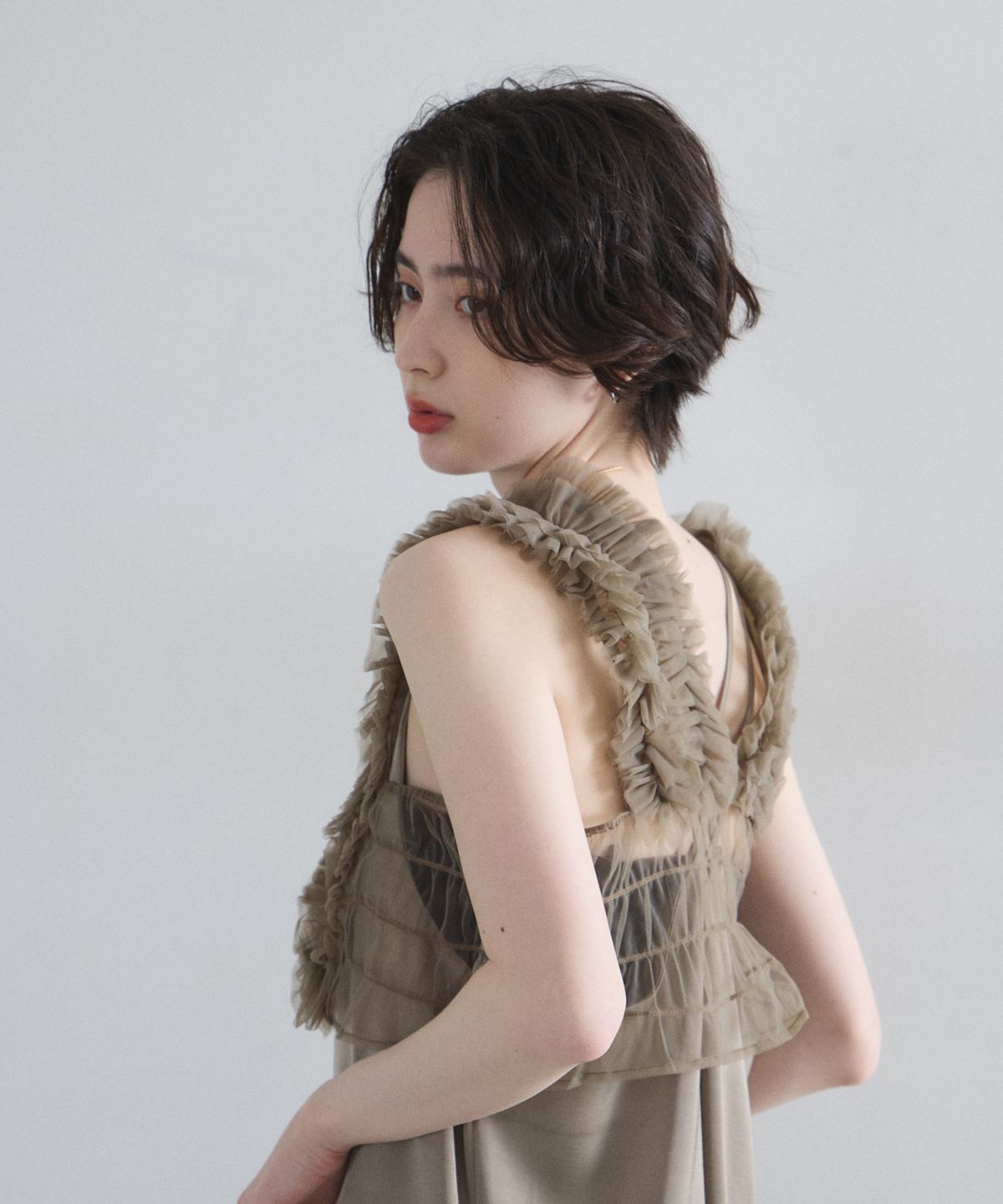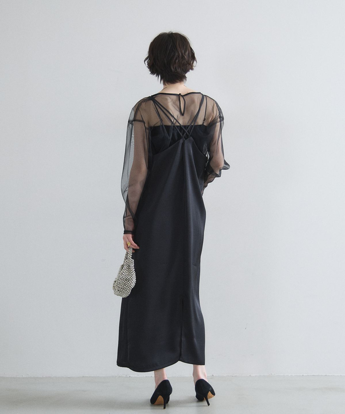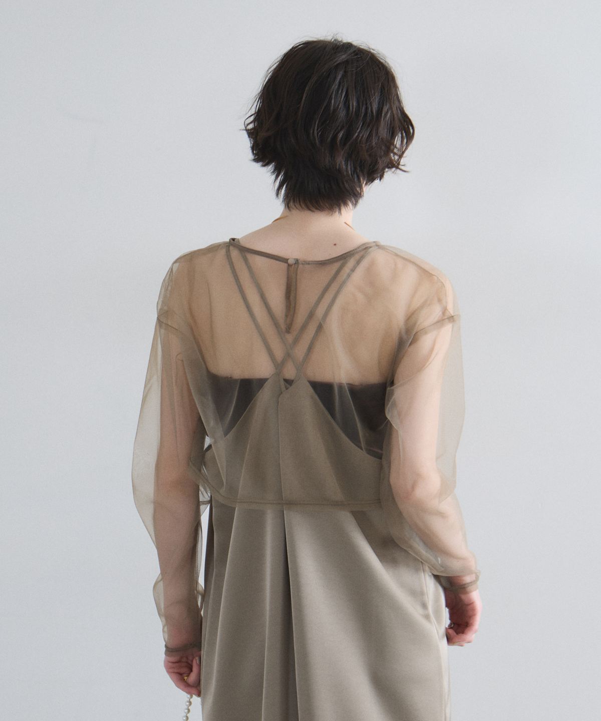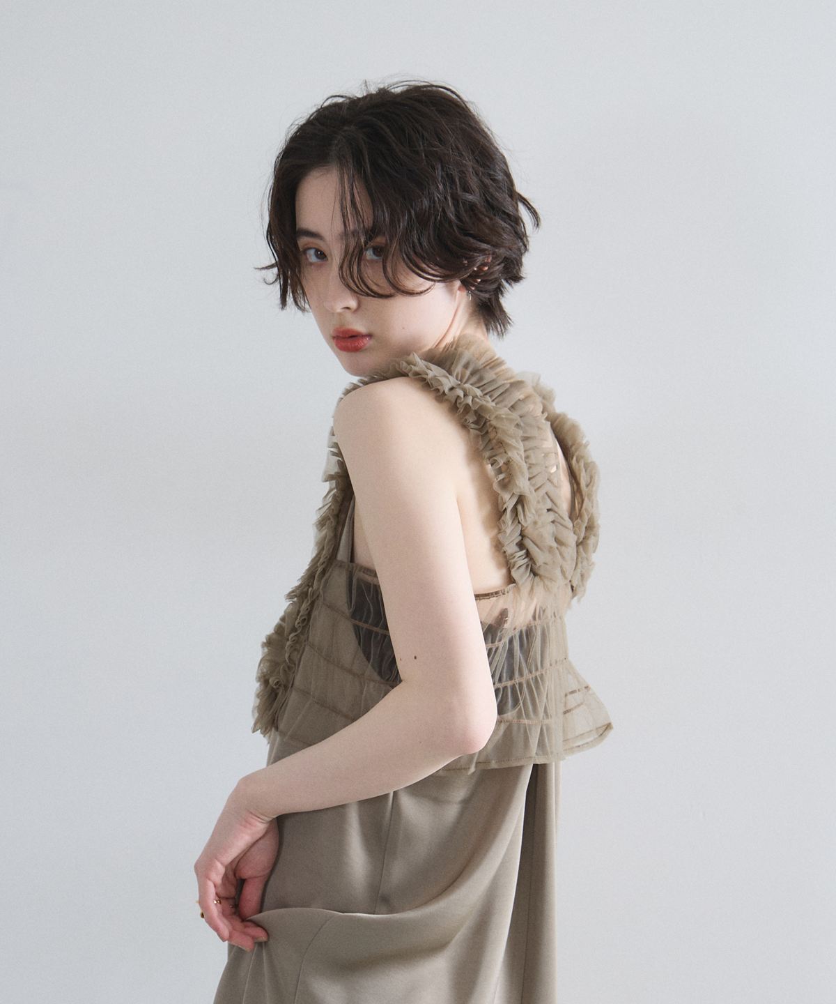| 商品説明 | : | 繊細なチュールが描く奥行きとモードな抜け感、一着で洗練される主役級ワンピース。 シアー感のあるチュールトップスと、上品な光沢のキャミワンピースを重ねたセットアイテム。 フリル使いが目を惹くトップスは前後2WAYで着用でき、それぞれ単品使いも可能。 結婚式などのオケージョンから、デニムを合わせたデイリーな着こなしまで、日常にドラマチックな彩りを添えてくれます。 |