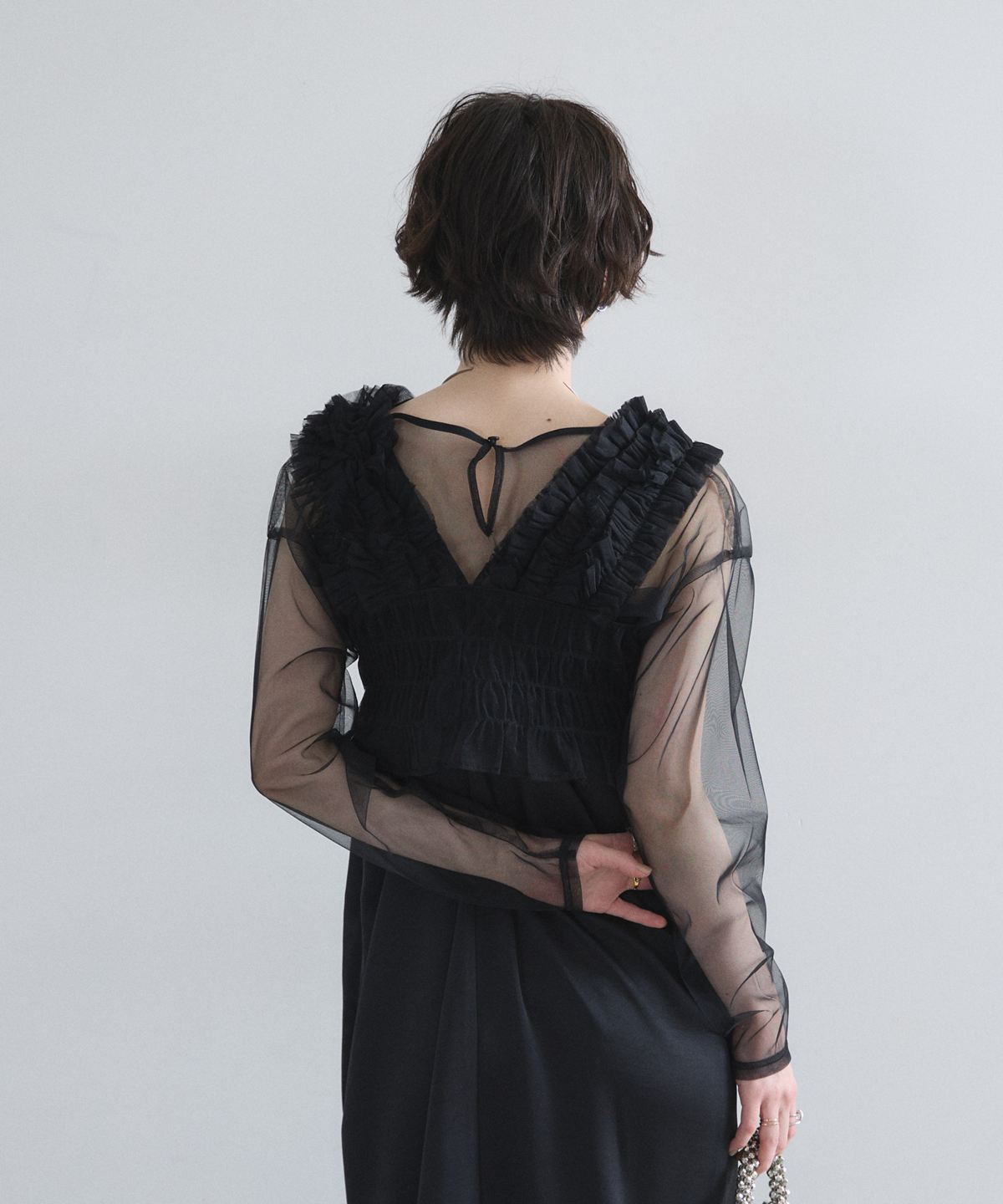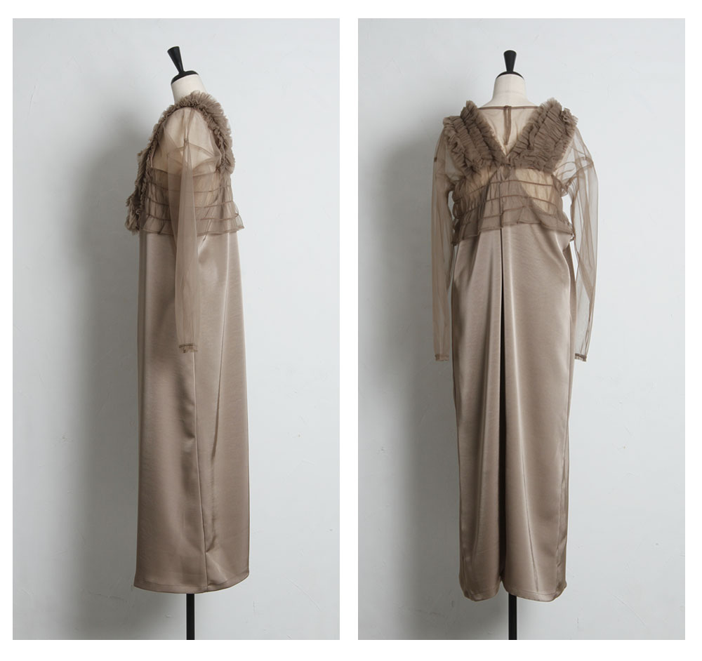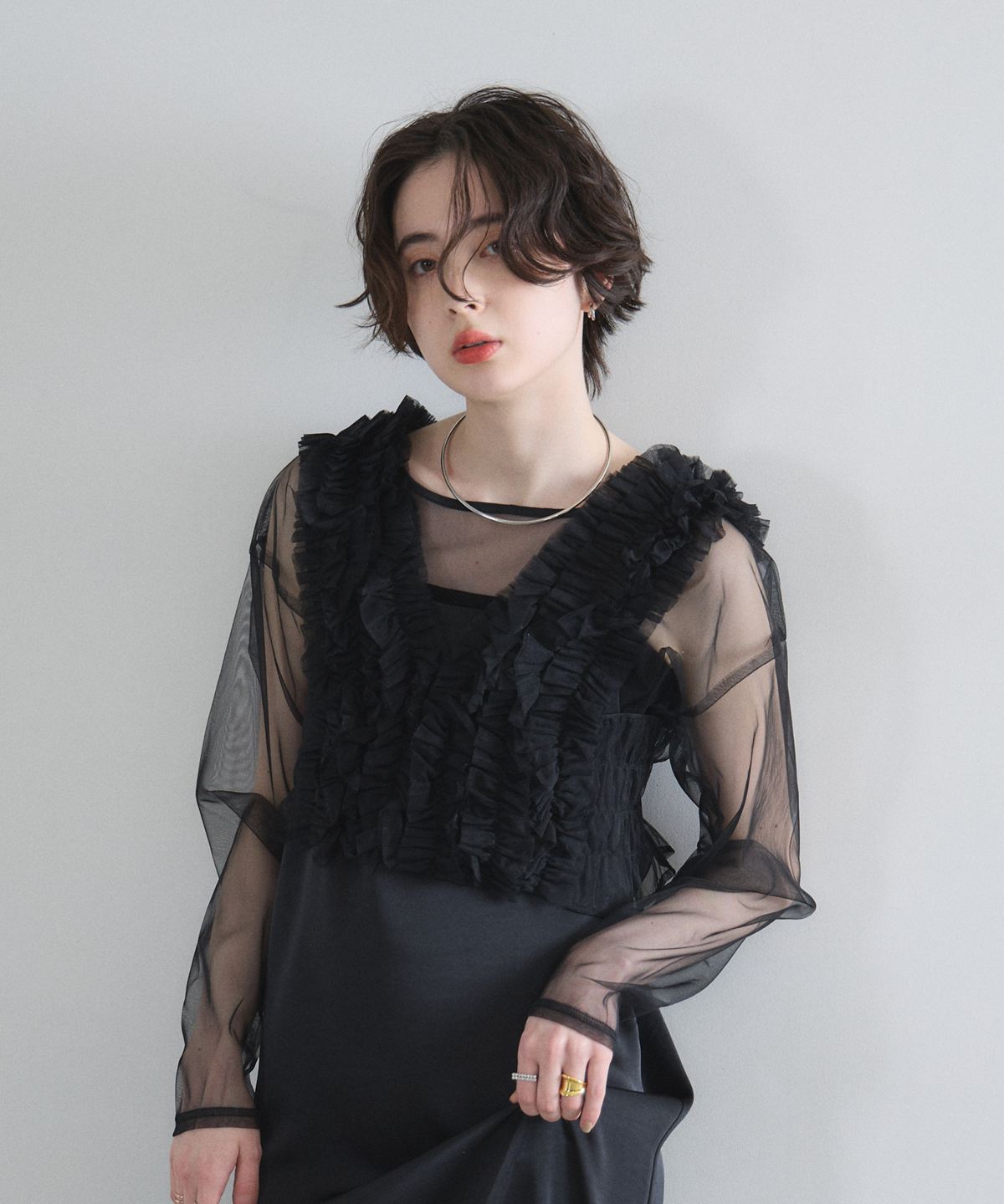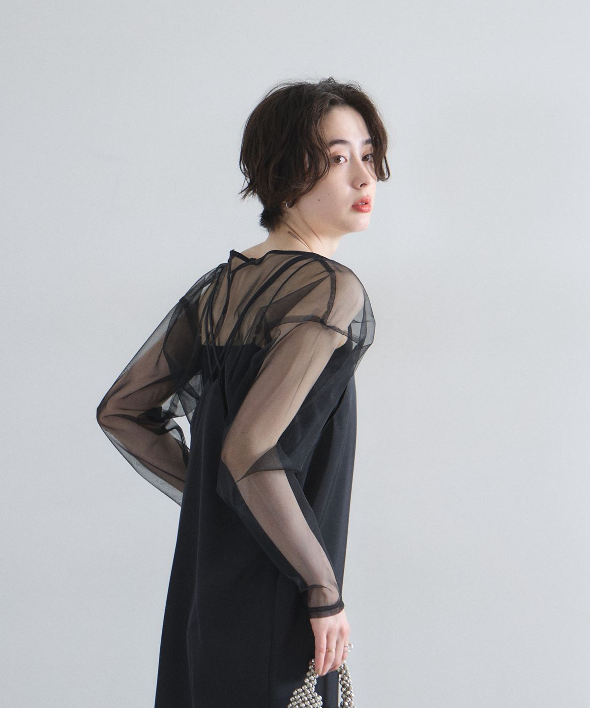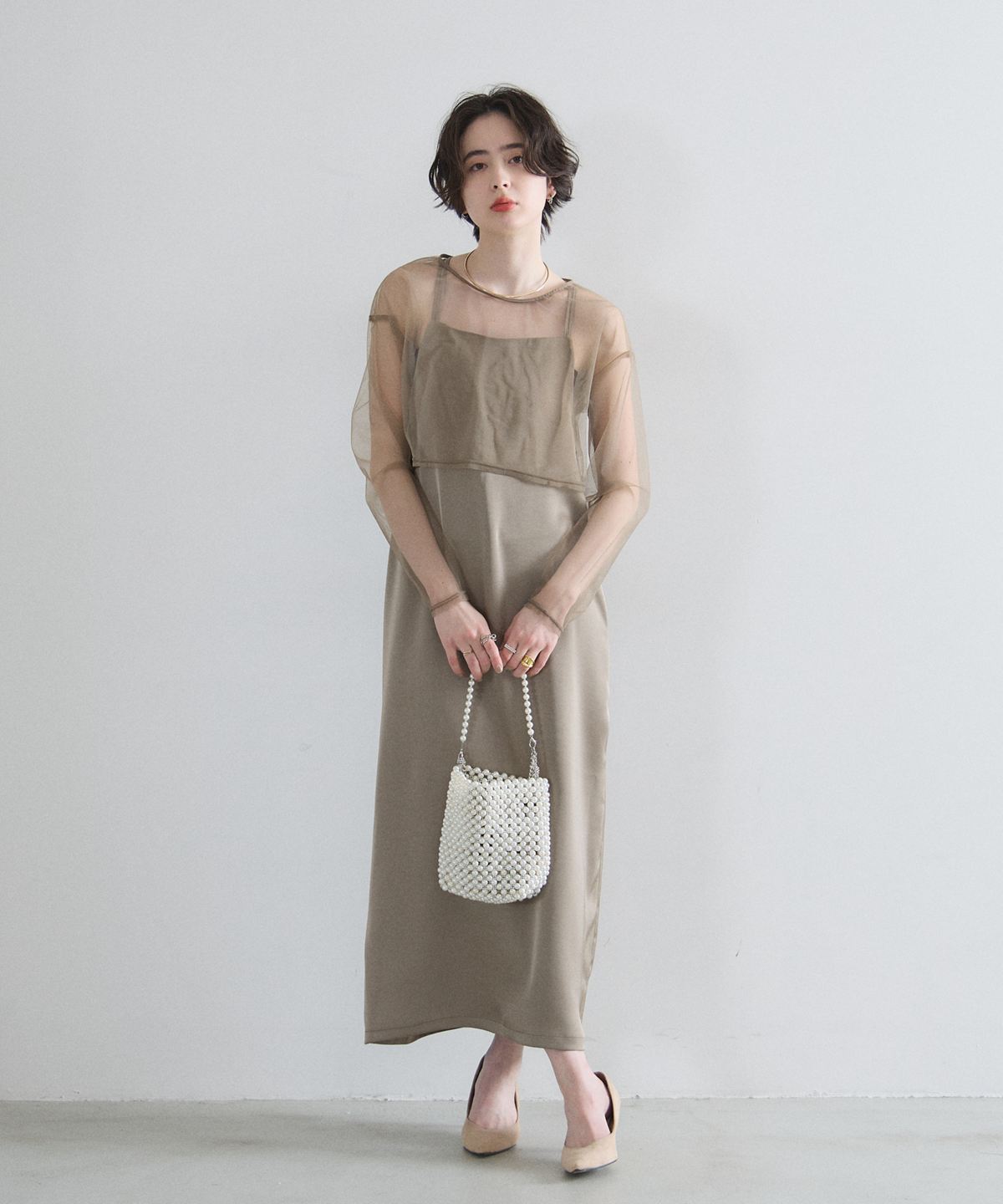 | 商品説明 | : | 繊細なチュールが描く奥行きとモードな抜け感、一着で洗練される主役級ワンピース。 シアー感のあるチュールトップスと、上品な光沢のキャミワンピースを重ねたセットアイテム。 フリル使いが目を惹くトップスは前後2WAYで着用でき、それぞれ単品使いも可能。 結婚式などのオケージョンから、デニムを合わせたデイリーな着こなしまで、日常にドラマチックな彩りを添えてくれます。 |