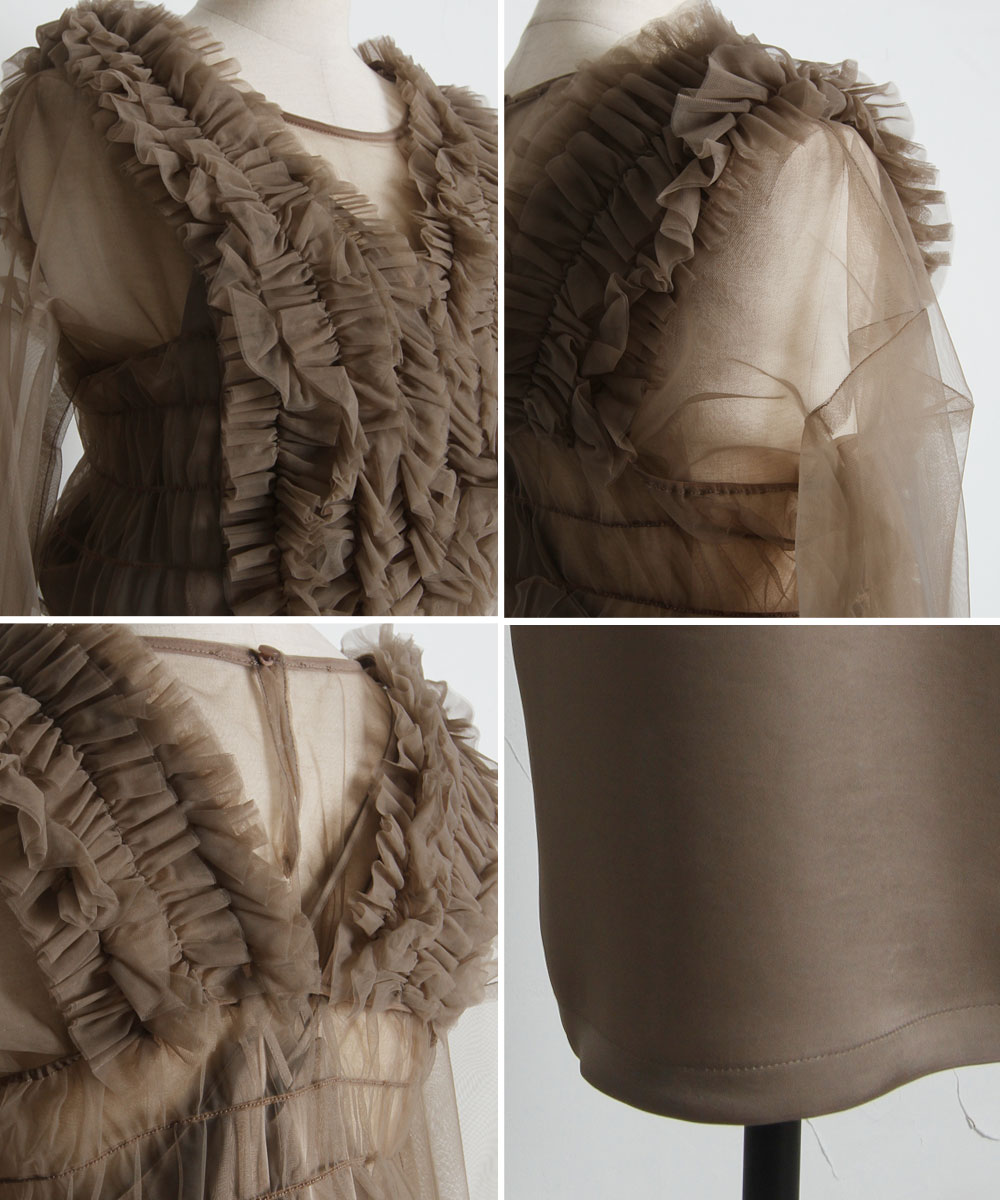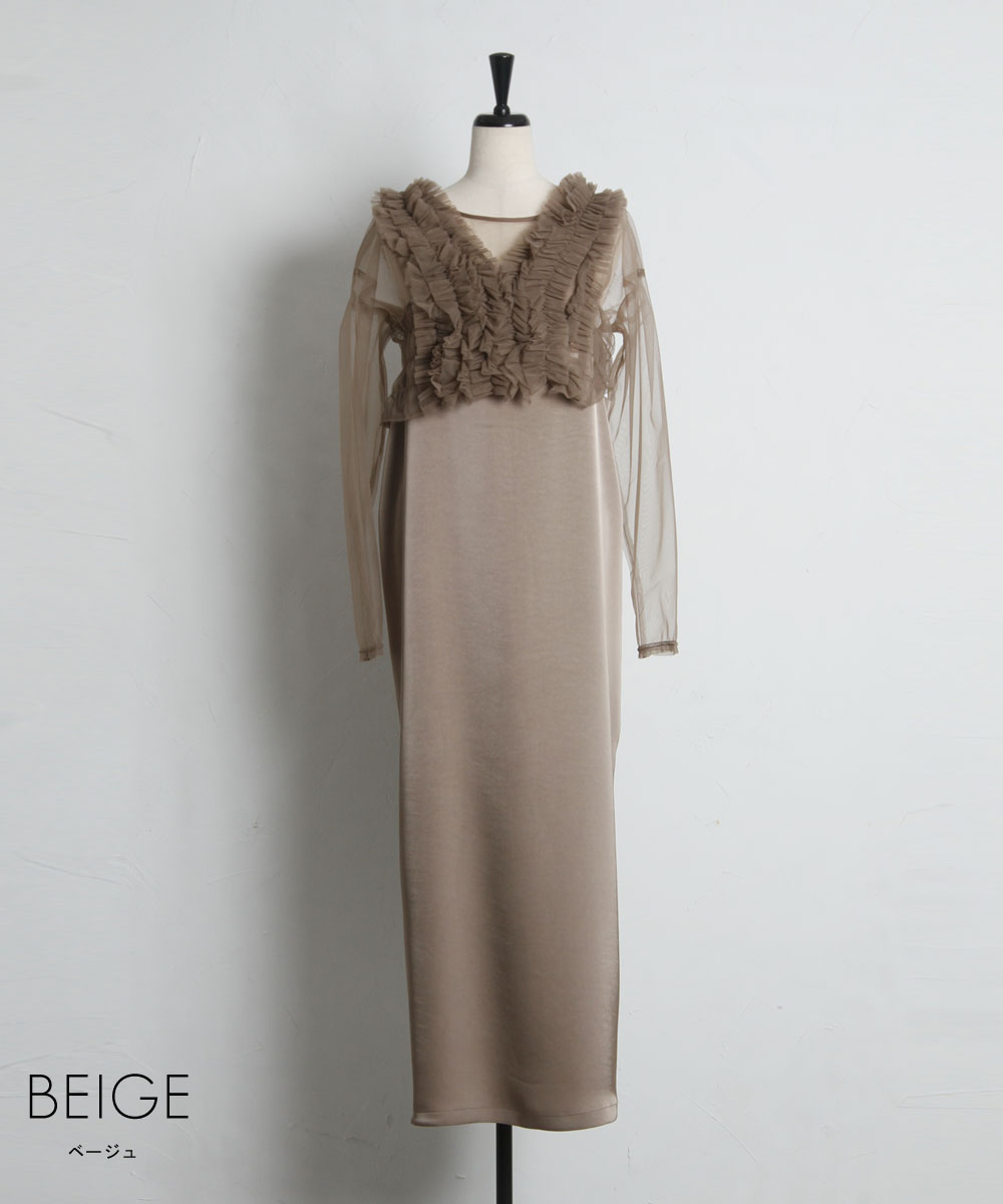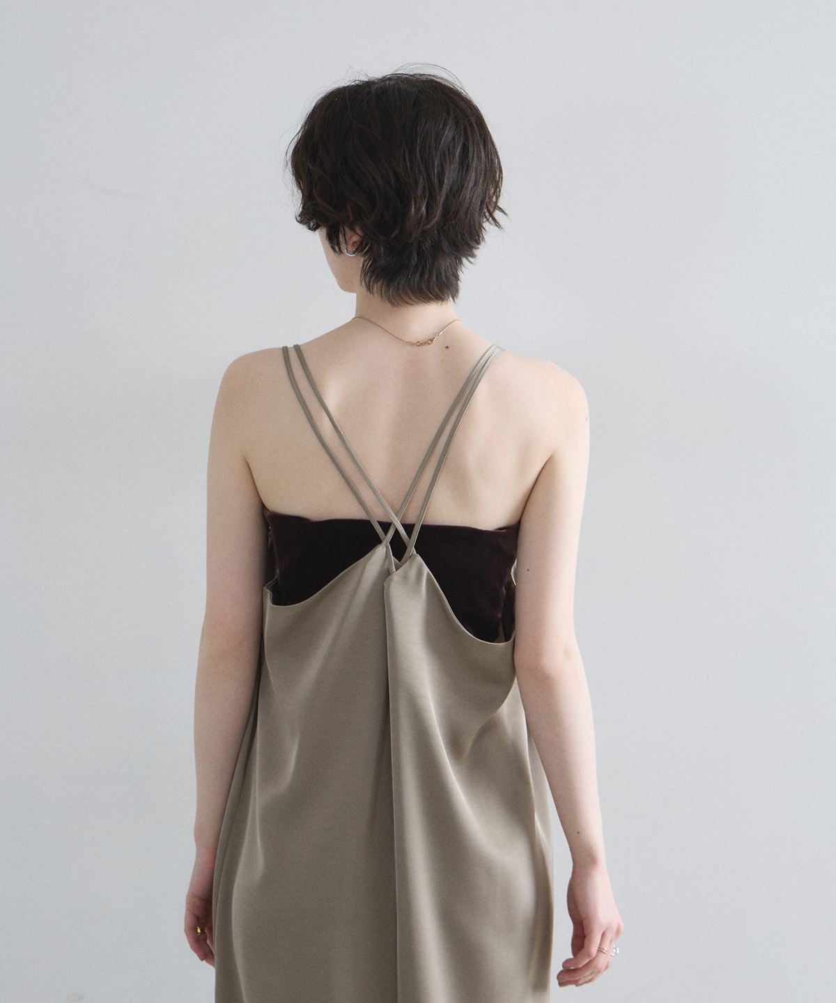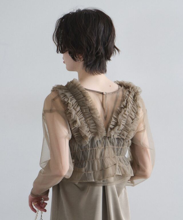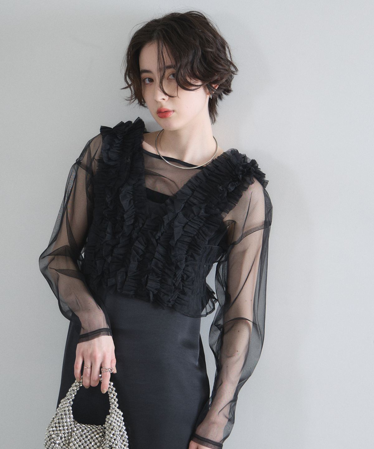 | 商品説明 | : | 繊細なチュールが描く奥行きとモードな抜け感、一着で洗練される主役級ワンピース。 シアー感のあるチュールトップスと、上品な光沢のキャミワンピースを重ねたセットアイテム。 フリル使いが目を惹くトップスは前後2WAYで着用でき、それぞれ単品使いも可能。 結婚式などのオケージョンから、デニムを合わせたデイリーな着こなしまで、日常にドラマチックな彩りを添えてくれます。 |