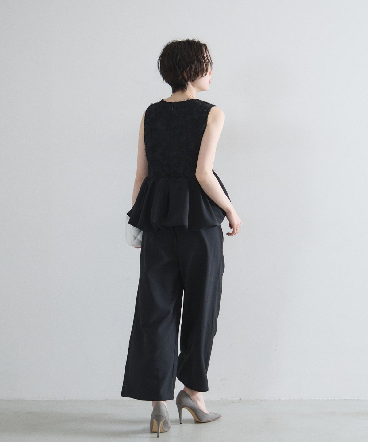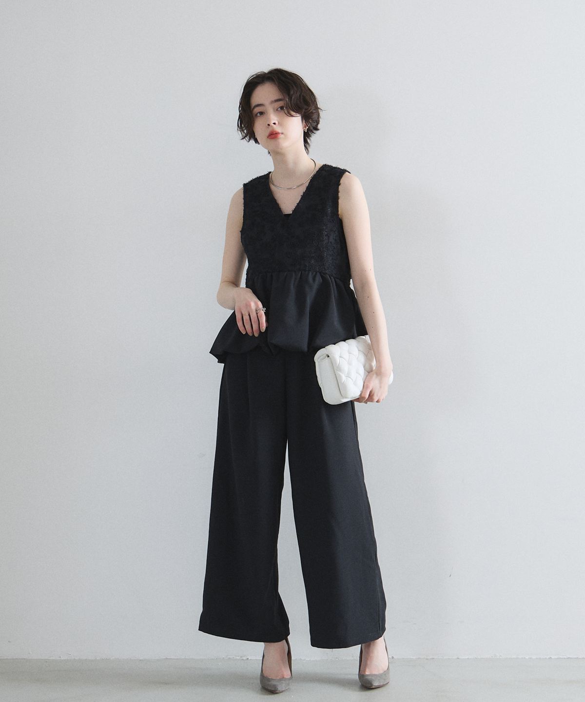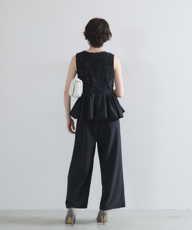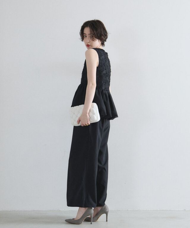 | 商品説明 | : | 異素材で魅せる、洗練のオールインワン。 表情豊かなフリンジジャガードと、構築的なペプラムシルエットが目を引く一着。 高めのウエスト切り替えがスタイルアップを叶え、纏うだけで凛とした佇まいに。 素材のコントラストが奥行きのある華やかさを演出します。 お呼ばれや特別なディナーなど、大切な日の気分を格上げしてくれる主役級アイテムです。 |