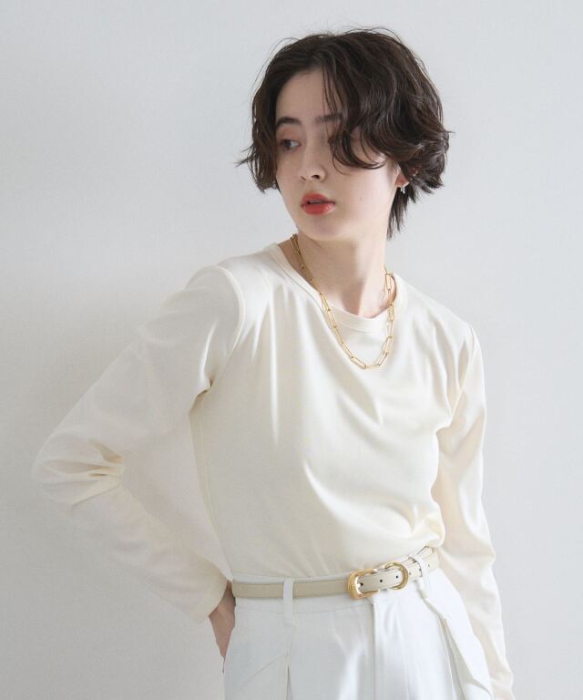| 商品説明 | : | 洗練された女性らしさを引き立てる、大人のシアーロングTシャツ。 肌を綺麗に見せる繊細な生地感と、程よいフィット感が魅力の一枚。 シンプルながらも上品な光沢感があり、 カジュアルなデニムからきれいめなスラックスまで幅広いボトムスと好相性です。 メイン使いはもちろん、ジャケットやニットのインナーとして レイヤードスタイルを楽しむのもおすすめです。 |