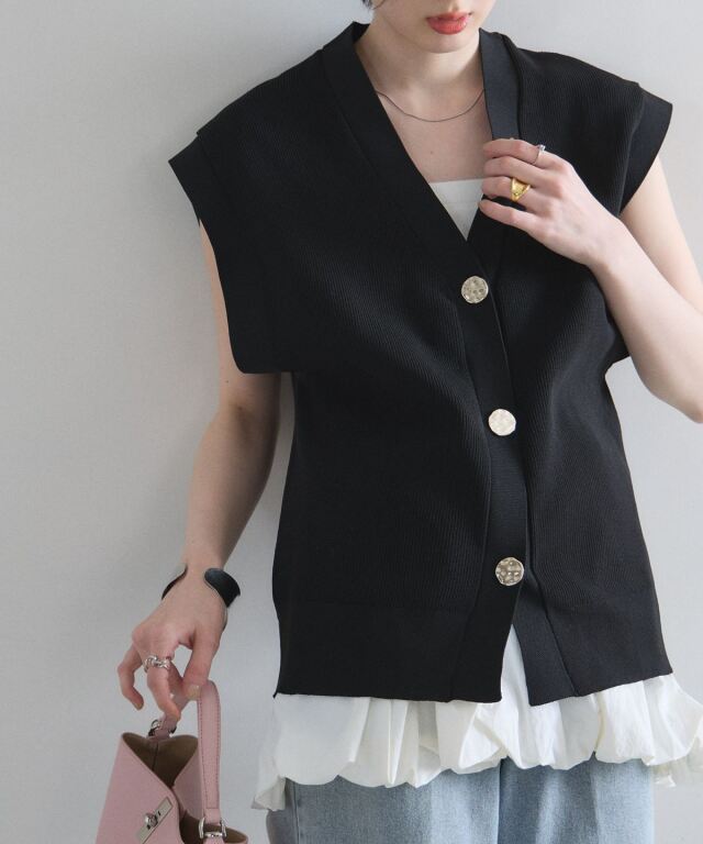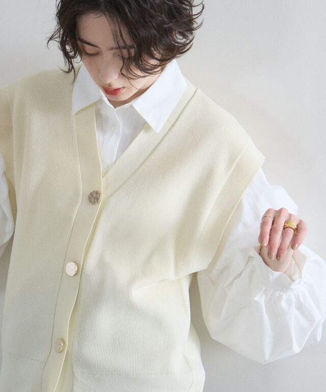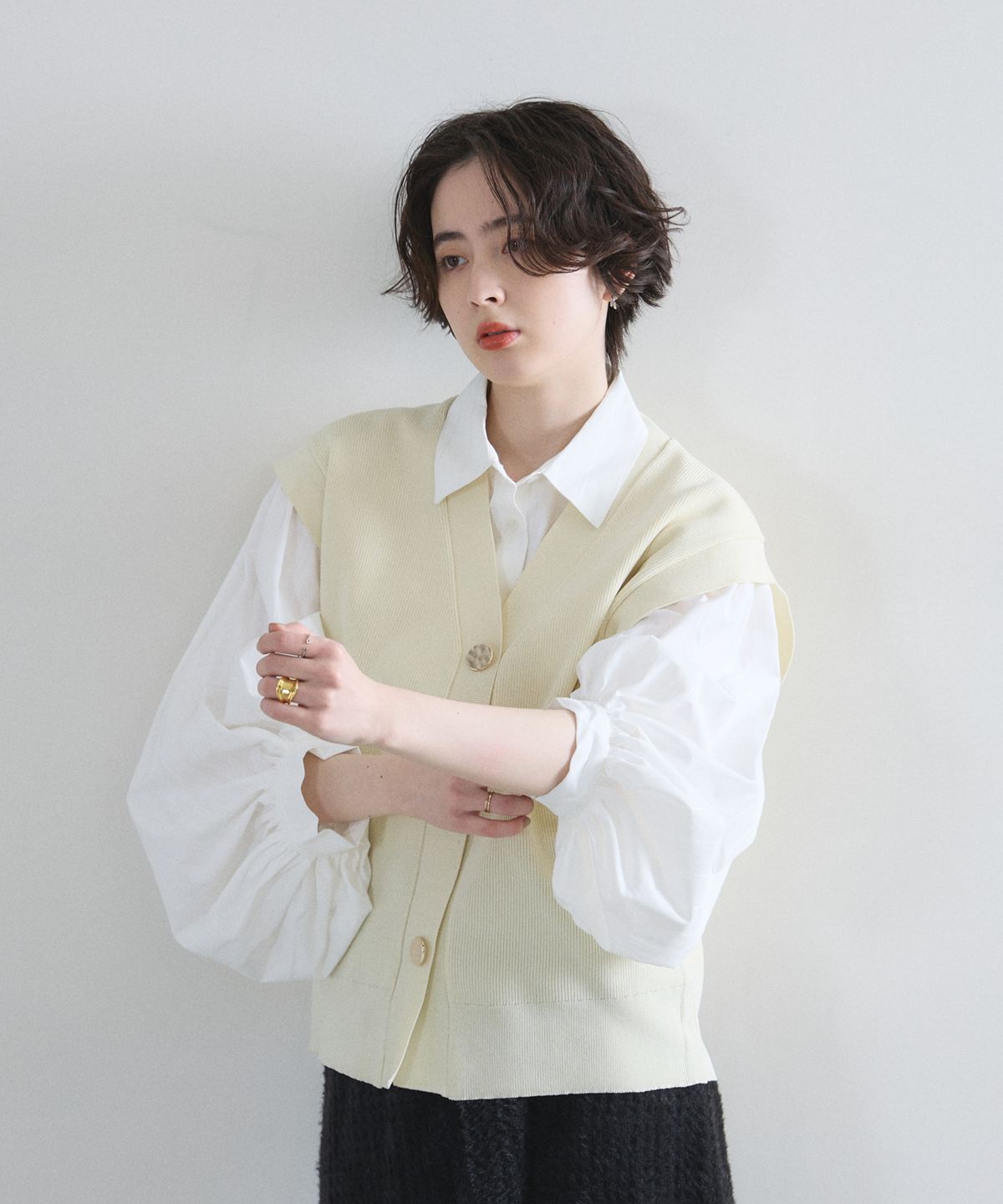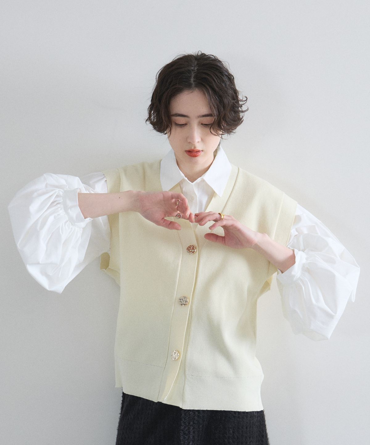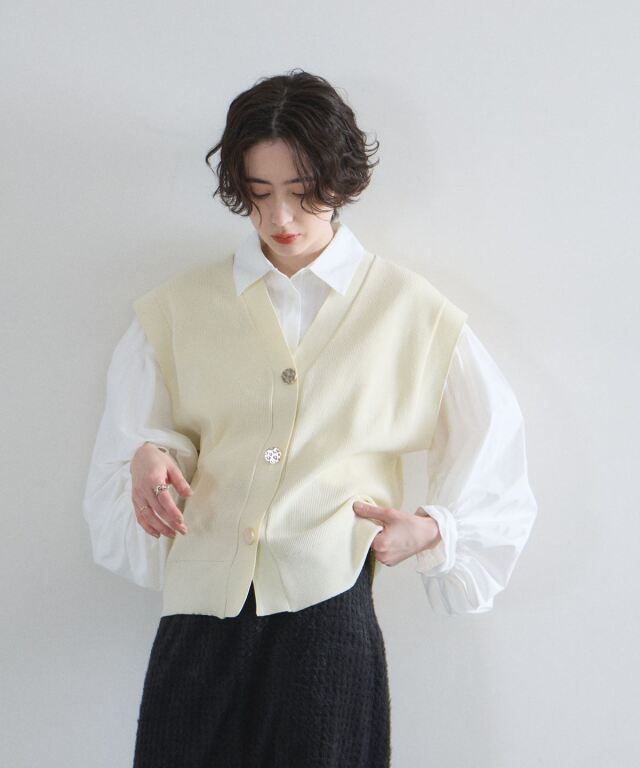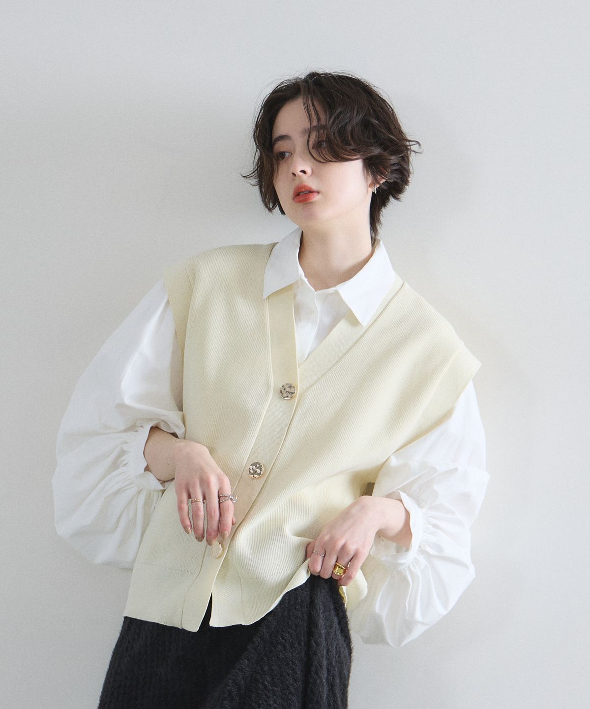 | 商品説明 | : | 遊び心のあるボタン使いで、いつものレイヤードをワンランク上の着こなしへ。 一つひとつ表情の異なるアソートボタンがアクセントのニットベスト。 ゆったりとしたアームホールとオーバーサイズなシルエットで、ボリュームスリーブのブラウスともストレスなく重ね着が楽しめます。 シャツやカットソーにプラスするだけで洗練されたモードスタイルが完成します。 |