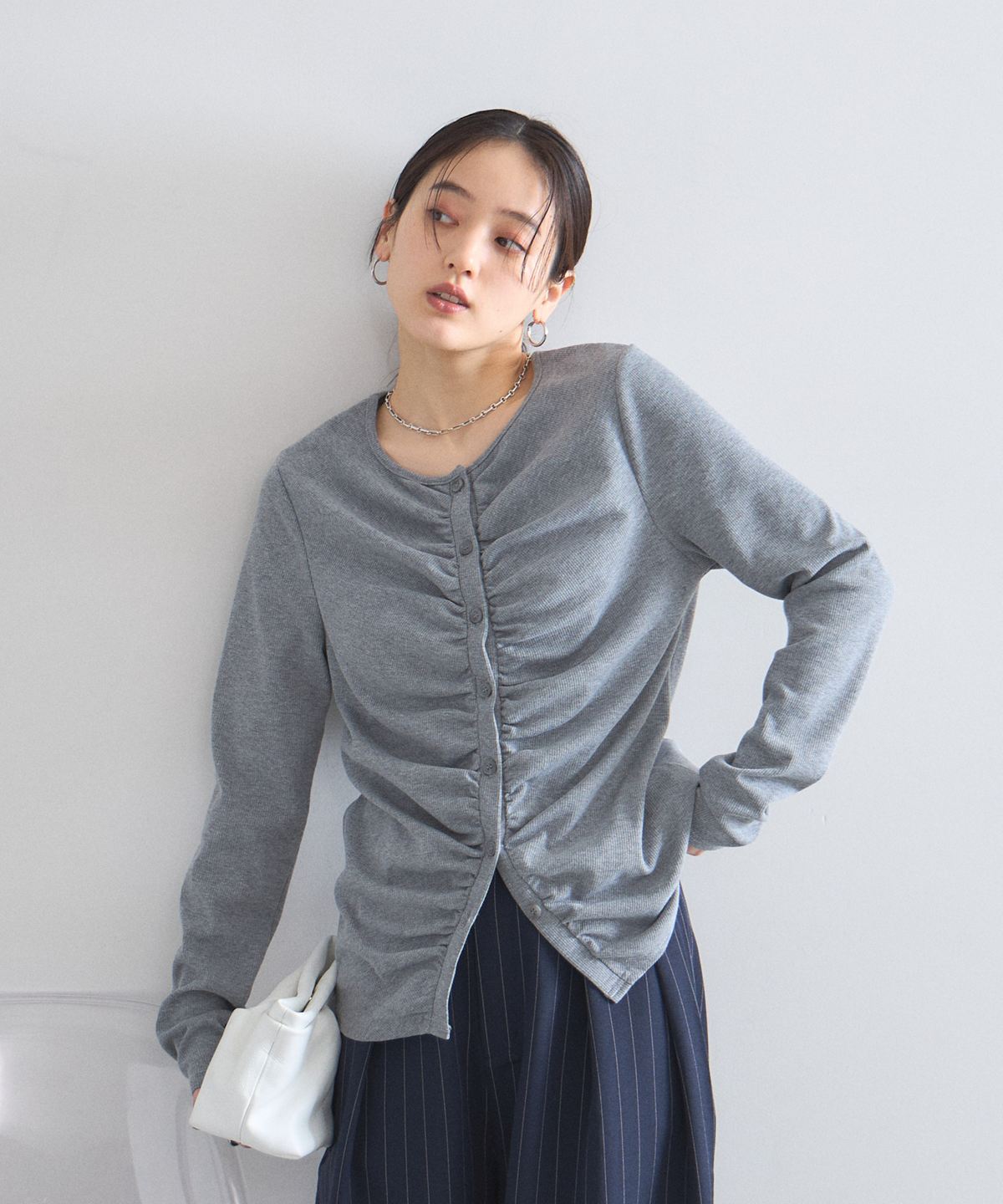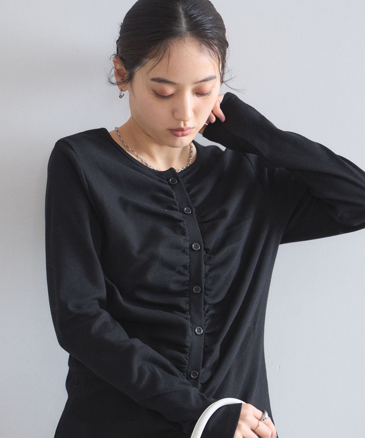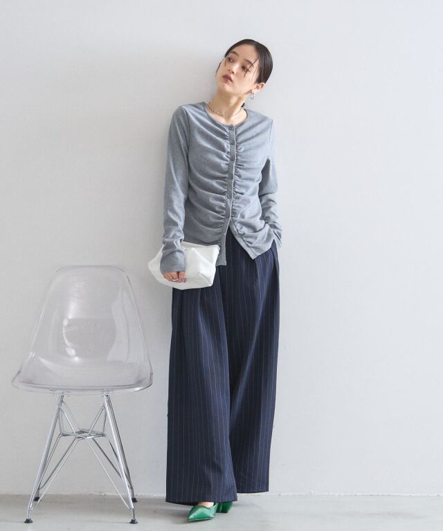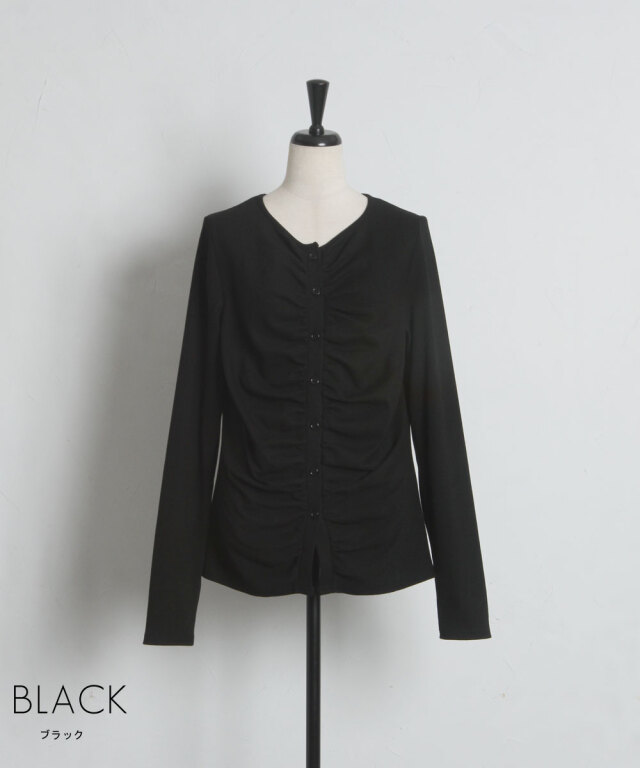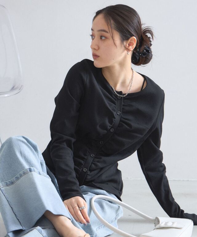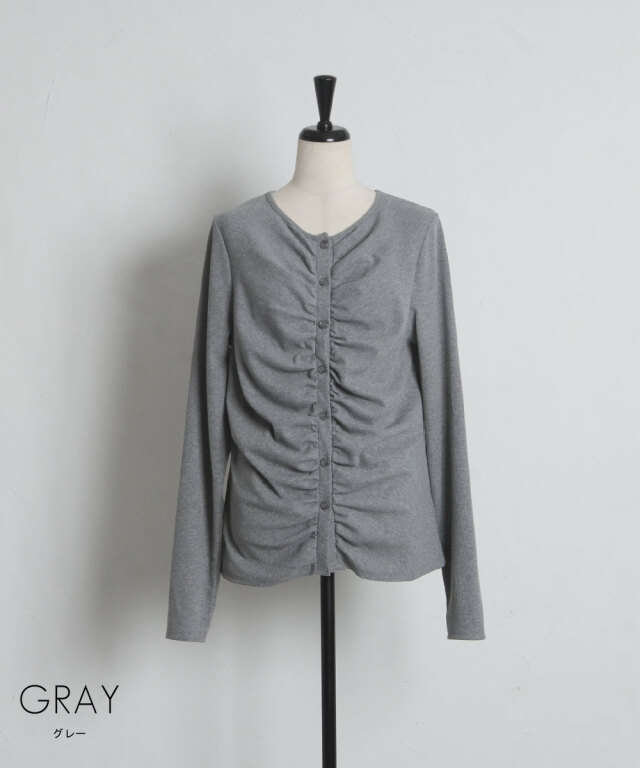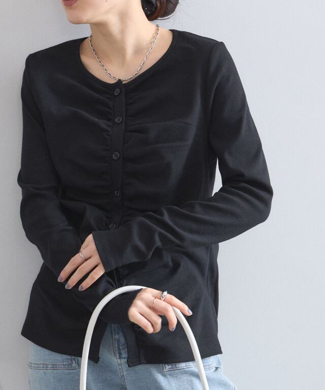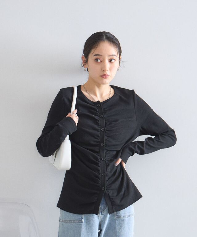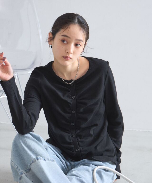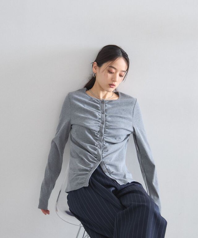 | 商品説明 | : | フロントギャザーが生み出す立体的なシルエットが、日常に華やぎを添える一着。 中央に寄せたギャザーがボディラインを美しく見せ、シンプルながらも存在感のある仕上がりに。 柔らかくしなやかな肌触りの素材を使用しており、羽織りとしてはもちろん、 ボタンを閉めてプルオーバーのように着こなすのもおすすめです。 |