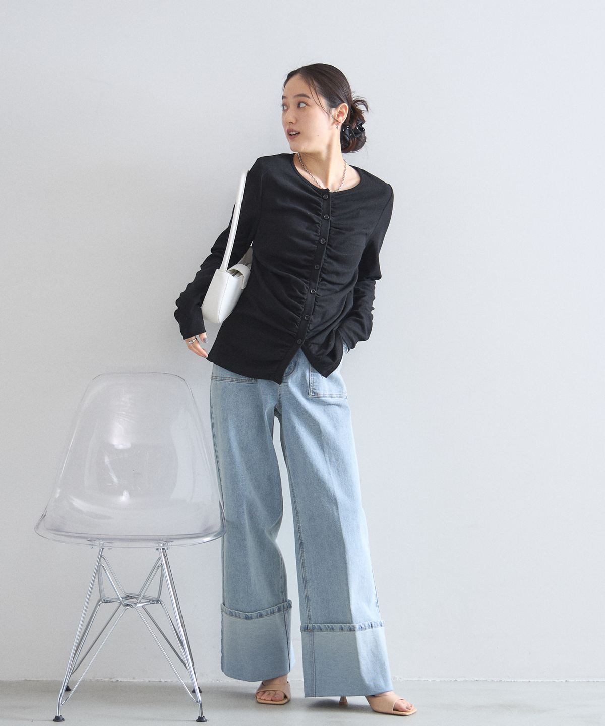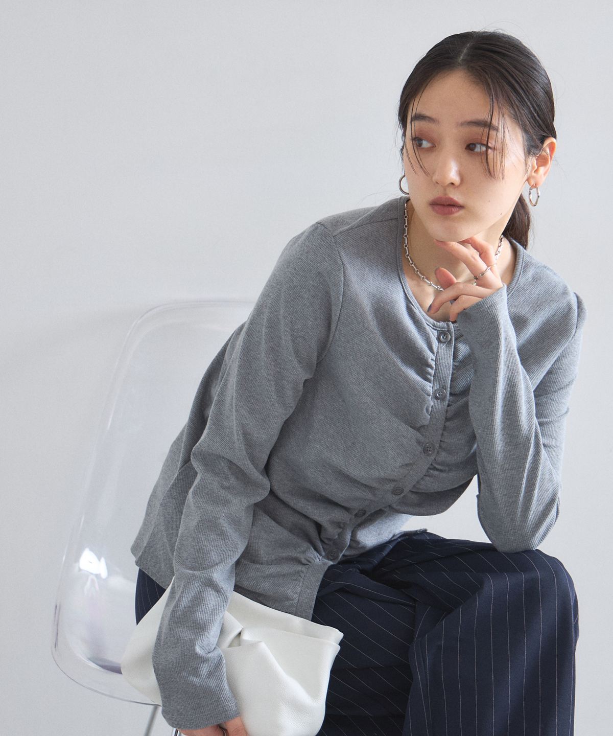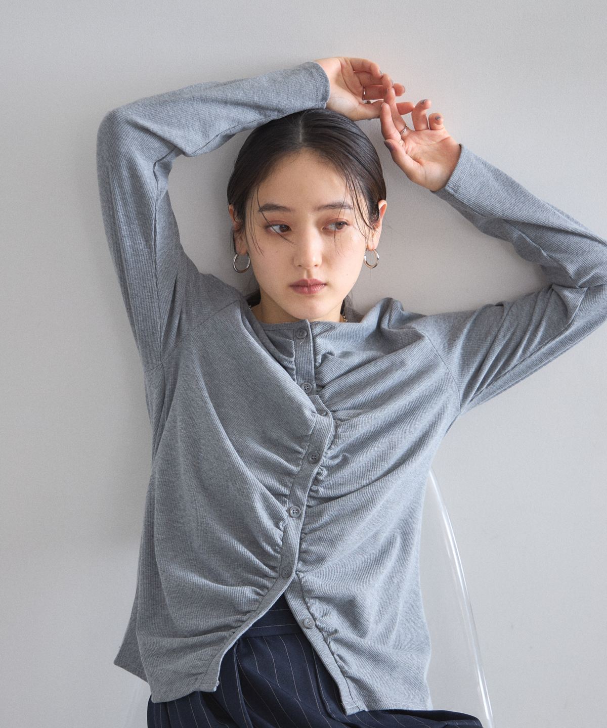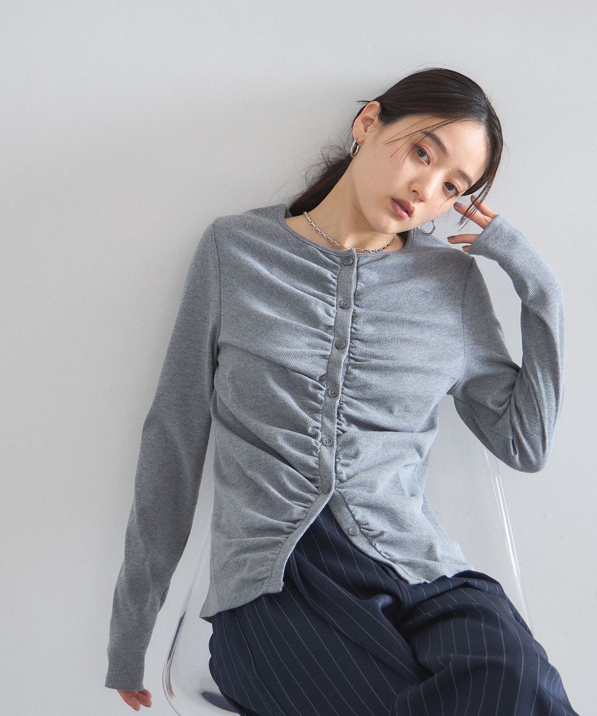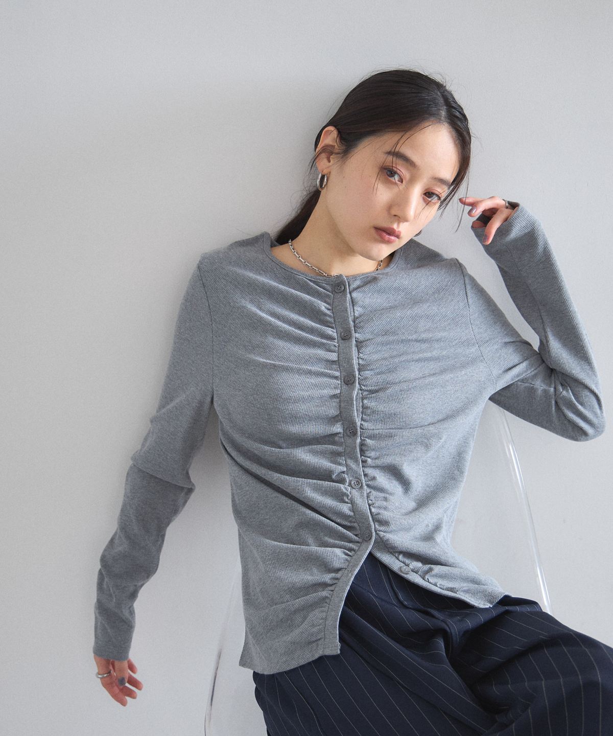 | 商品説明 | : | フロントギャザーが生み出す立体的なシルエットが、日常に華やぎを添える一着。 中央に寄せたギャザーがボディラインを美しく見せ、シンプルながらも存在感のある仕上がりに。 柔らかくしなやかな肌触りの素材を使用しており、羽織りとしてはもちろん、 ボタンを閉めてプルオーバーのように着こなすのもおすすめです。 |