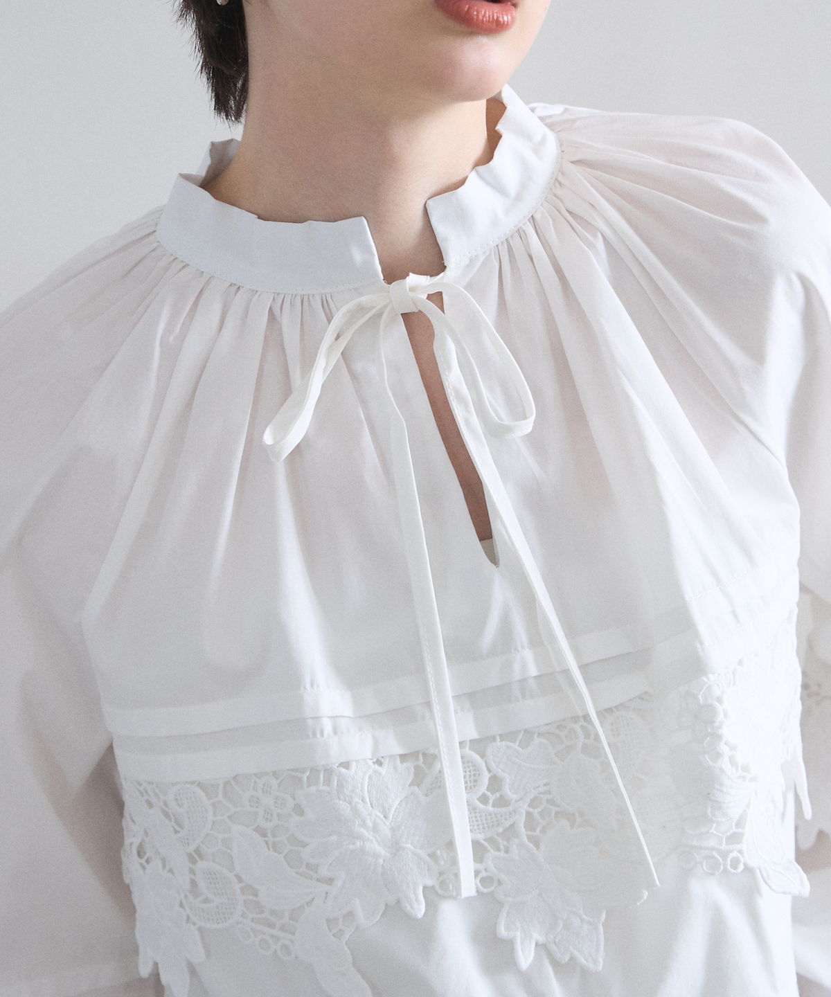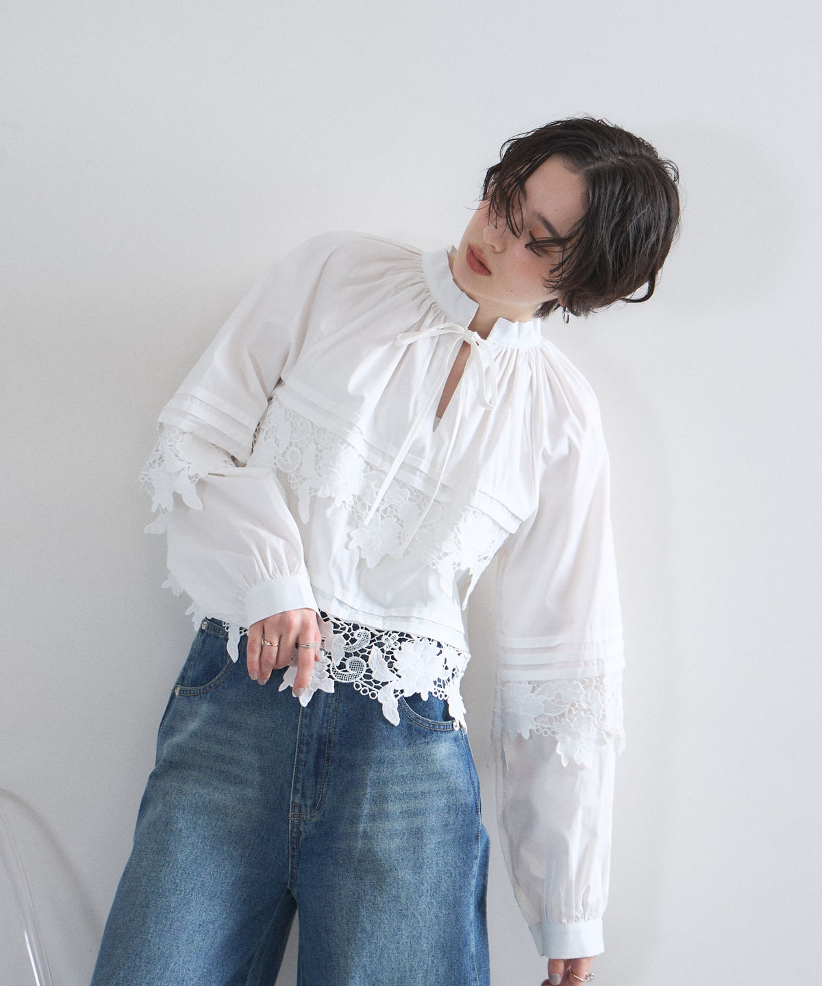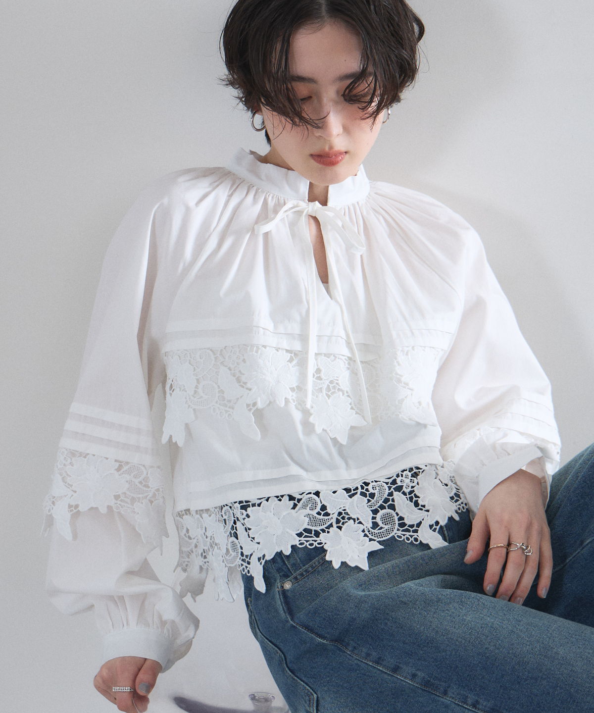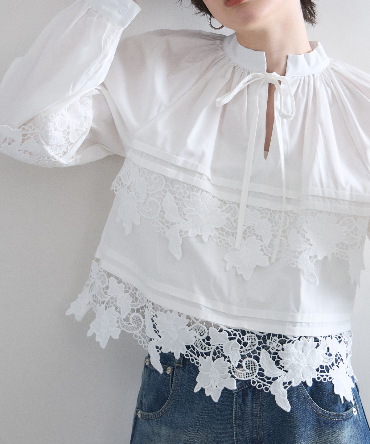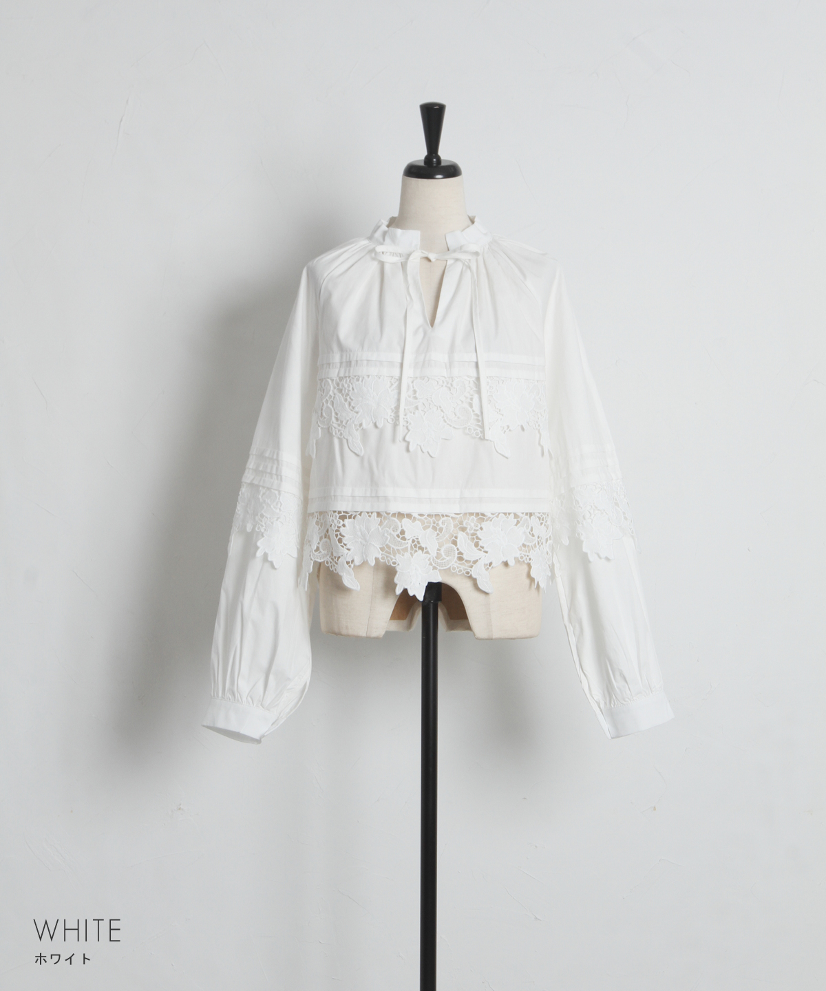 | 商品説明 | : | 贅沢なカットワークレースが目を惹く、フェミニンな主役級ブラウス。 フロントや裾に施された大ぶりのカットワークレースが、顔周りを華やかに演出する一着です。 首元のリボンタイと控えめな立ち襟がクラシカルな印象を与えつつ、ゆったりとしたシルエットでトレンド感もプラス。 デニムでカジュアルダウンしても、スカートでレディにまとめても様になる万能アイテムです。 |