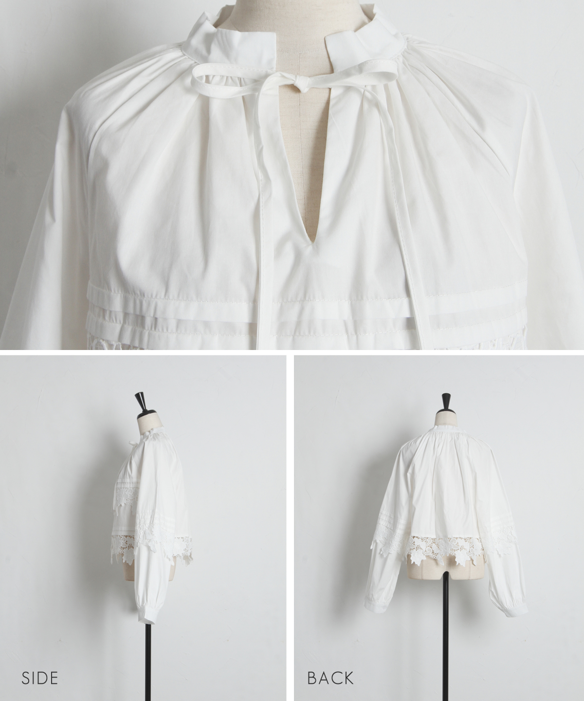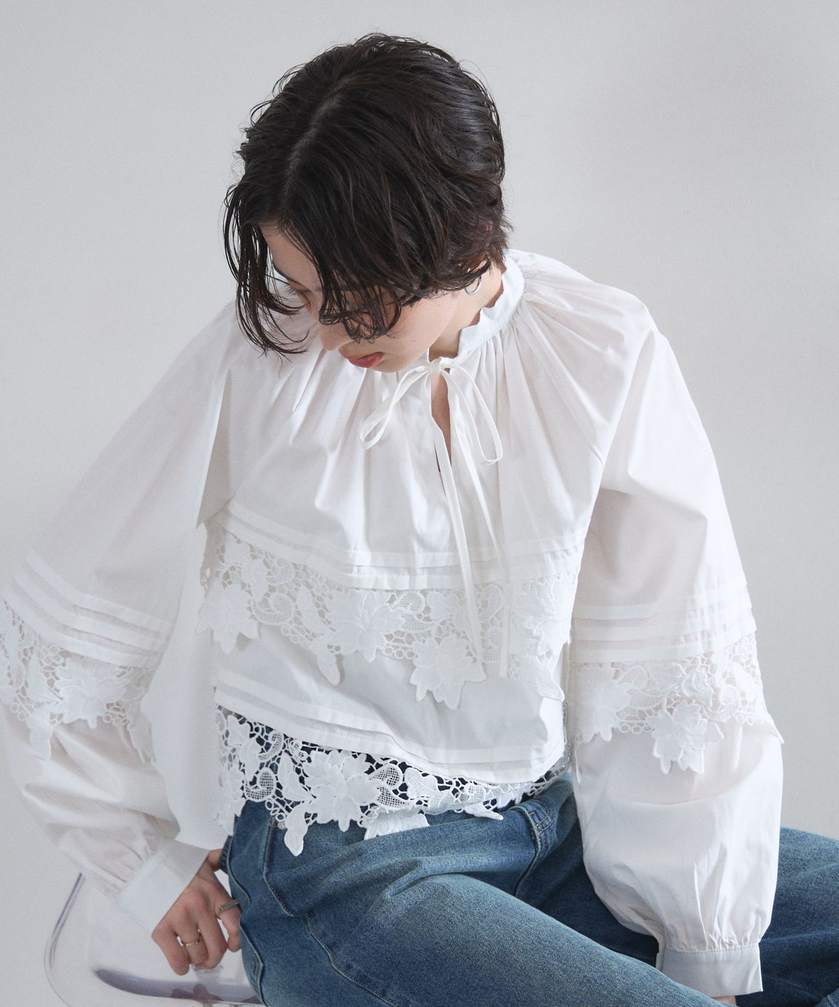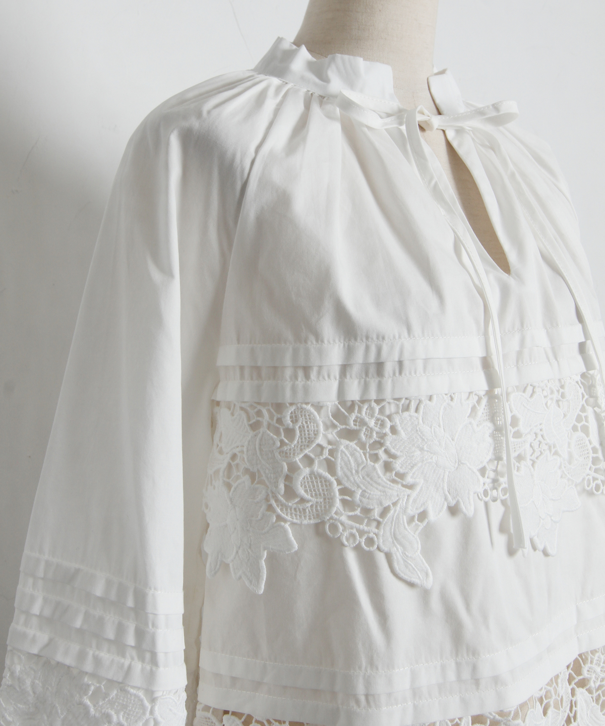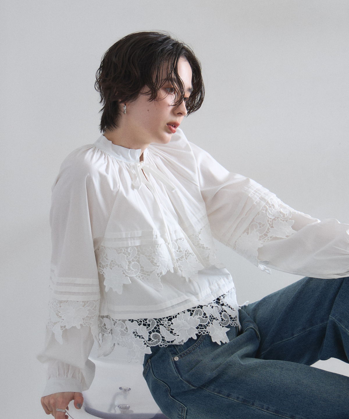 | 商品説明 | : | 贅沢なカットワークレースが目を惹く、フェミニンな主役級ブラウス。 フロントや裾に施された大ぶりのカットワークレースが、顔周りを華やかに演出する一着です。 首元のリボンタイと控えめな立ち襟がクラシカルな印象を与えつつ、ゆったりとしたシルエットでトレンド感もプラス。 デニムでカジュアルダウンしても、スカートでレディにまとめても様になる万能アイテムです。 |