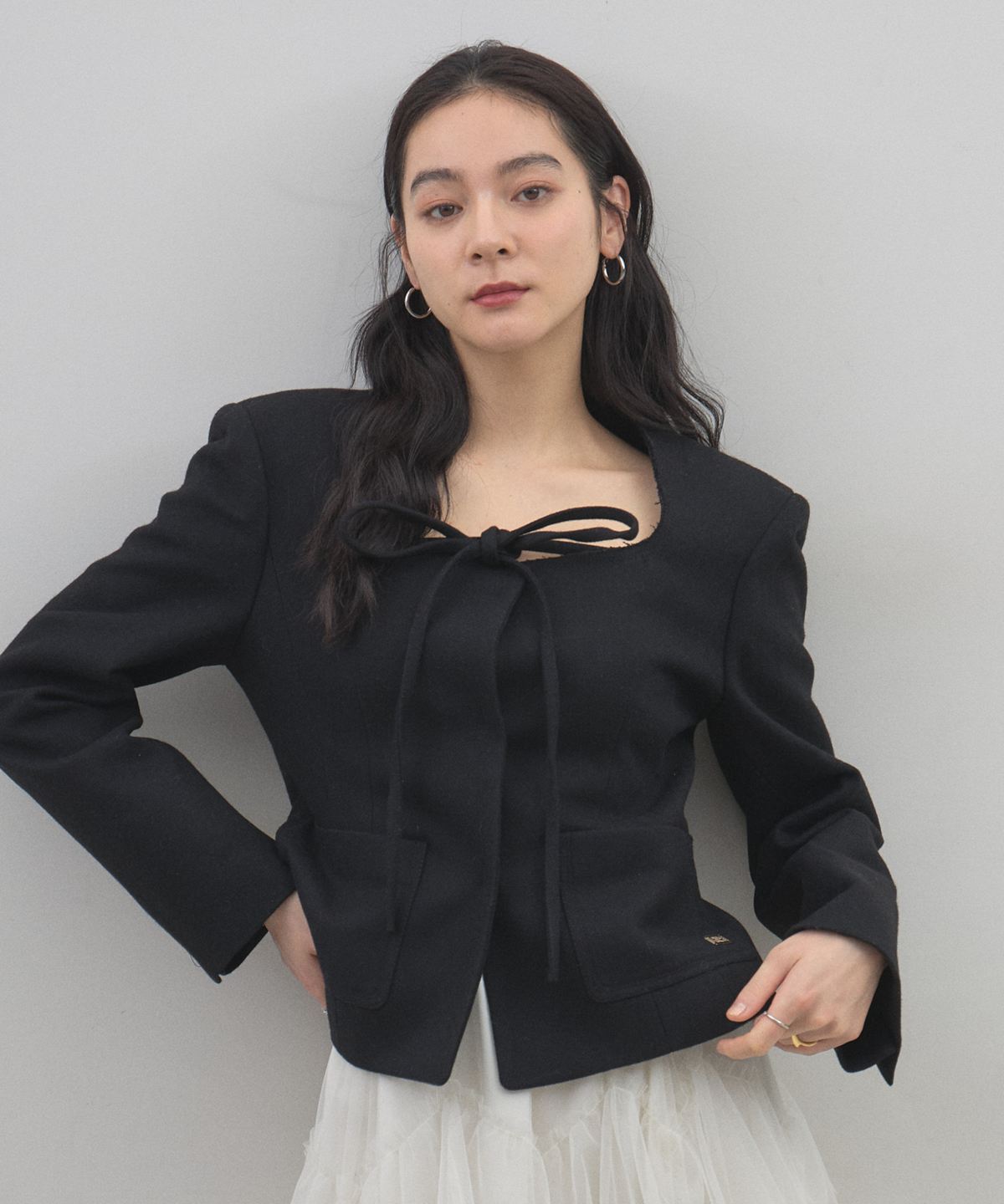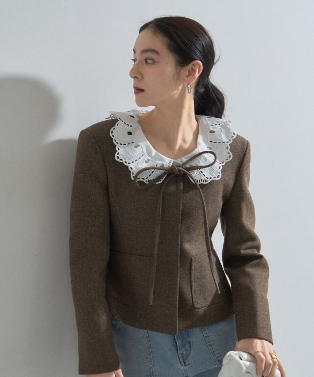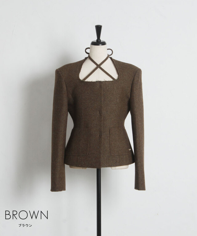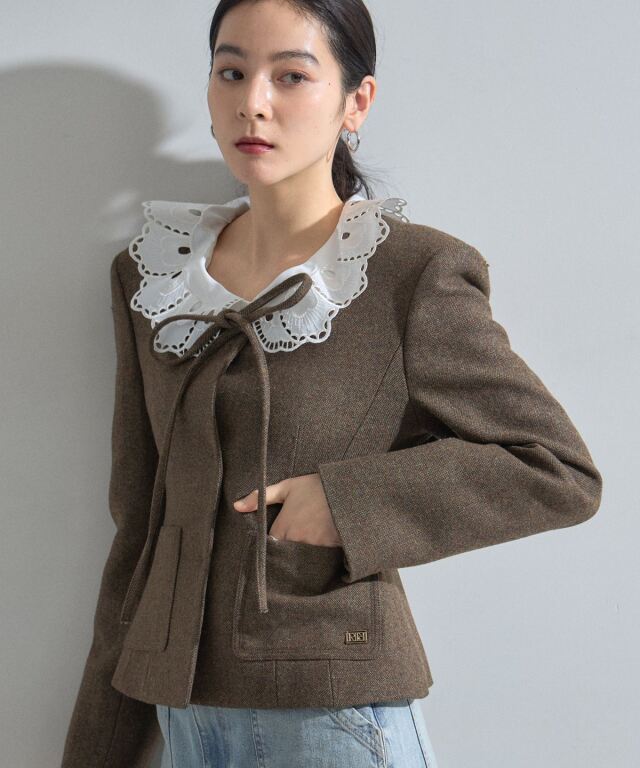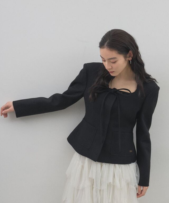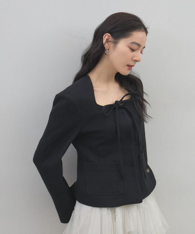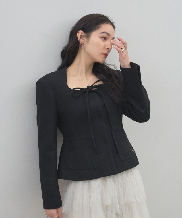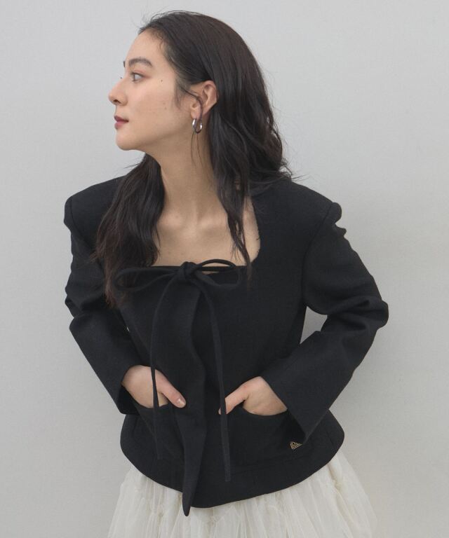 | 商品説明 | : | デコルテを美しく魅せるスクエアネックとリボン使いが目を惹く、クラシカルな主役級ジャケット。 大きく開いたスクエアネックが女性らしい抜け感を演出し、顔周りをすっきりと見せてくれる一着です。 フロントにあしらわれた細身のリボンタイが、マニッシュになりがちなジャケットスタイルに程よい甘さとモードなエッセンスをプラスします。 ウエストを程よくシェイプしたコンパクトなシルエットは、ボリュームのあるチュールスカートやワイドパンツとも相性抜群。 パッチポケットのさりげないディテールがアクセントになり、デイリーから華やかなシーンまで幅広く活躍します。 羽織るだけで品格のあるスタイリングが完成する、こだわりの詰まったアイテムです。 |