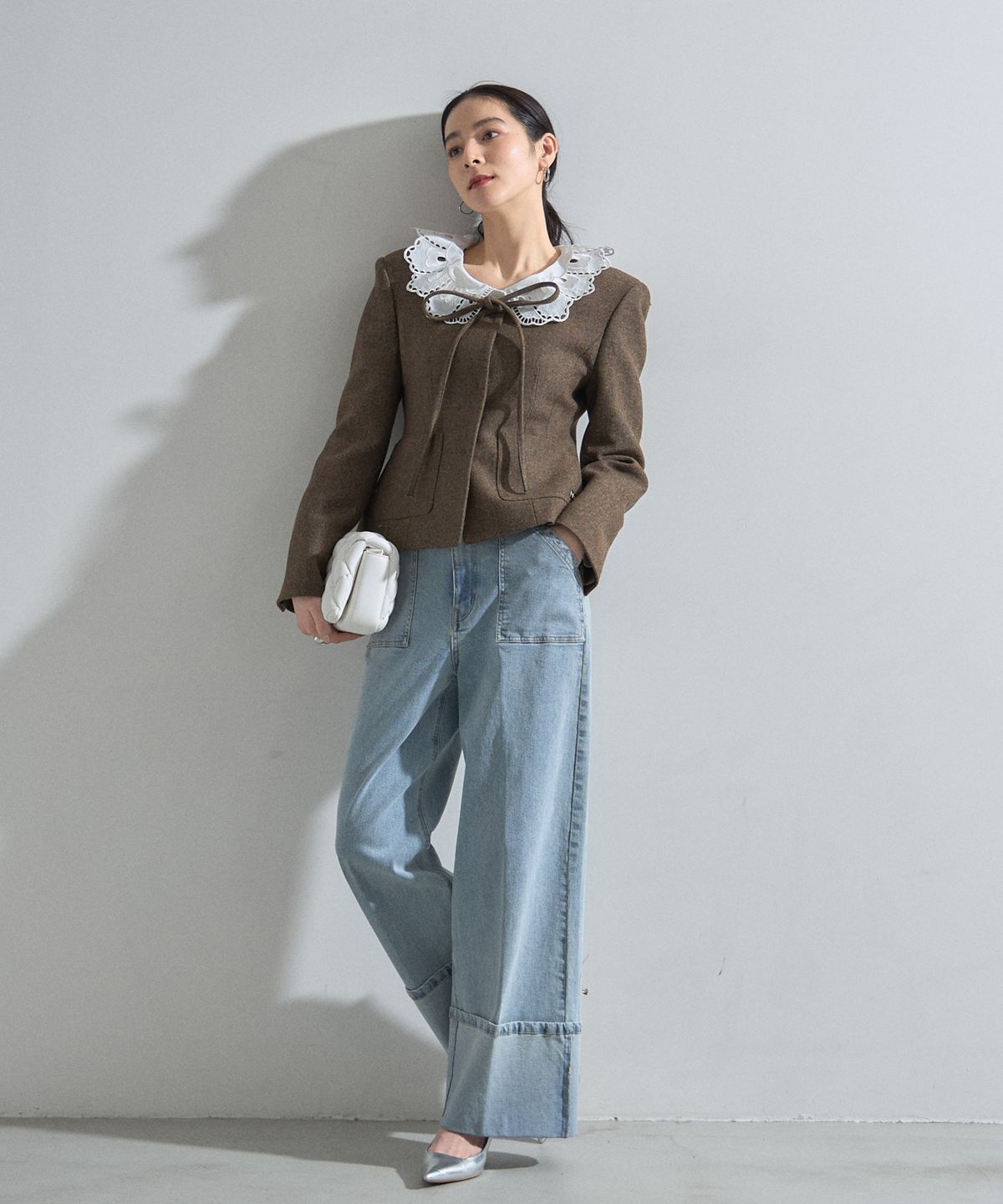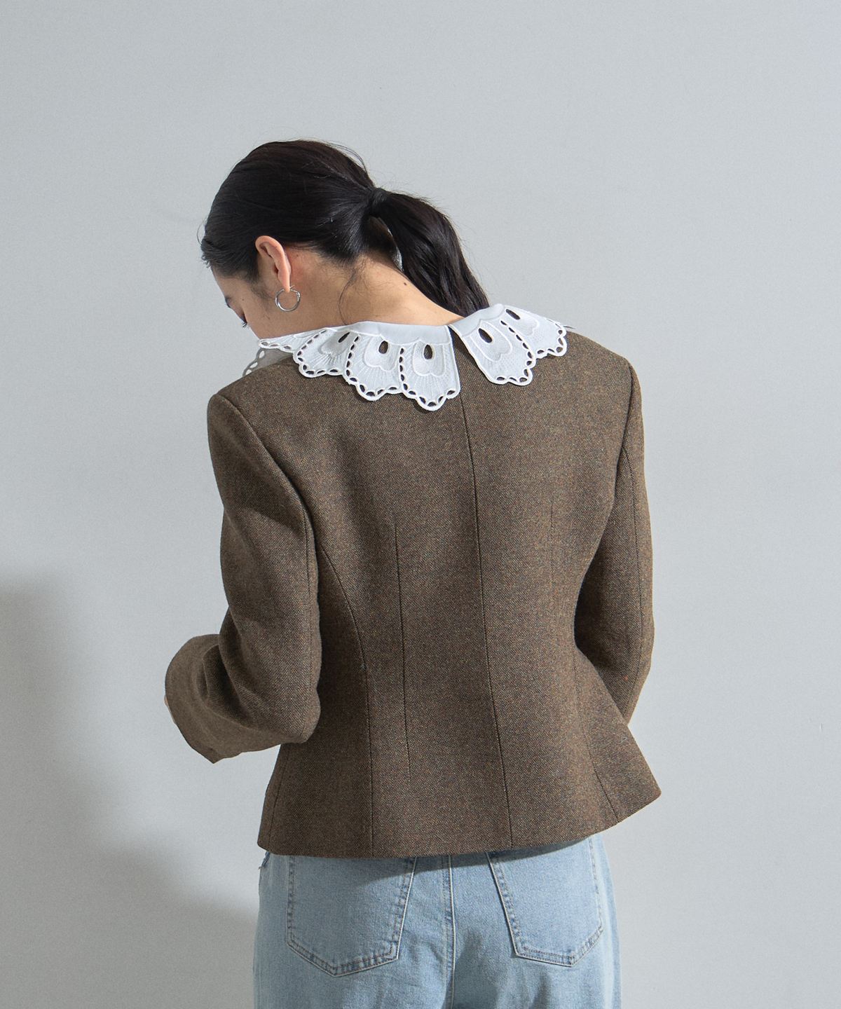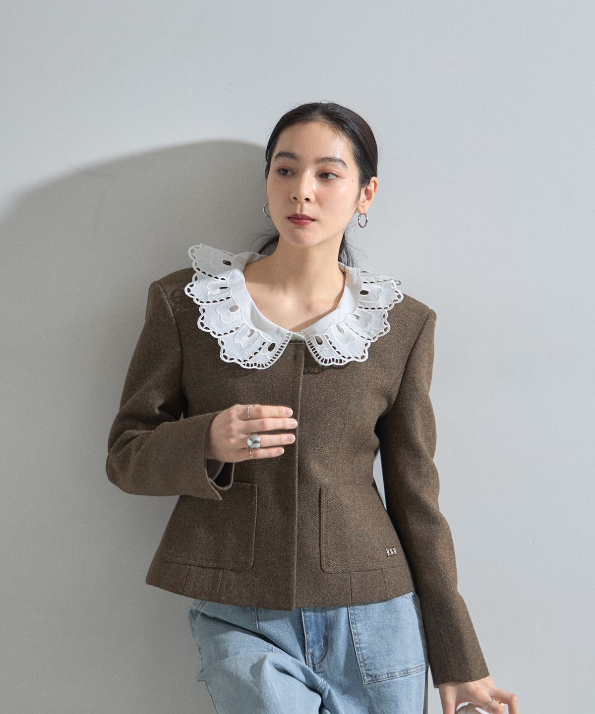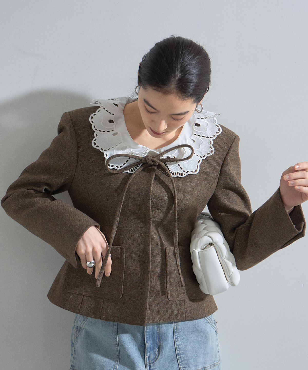 | 商品説明 | : | デコルテを美しく魅せるスクエアネックとリボン使いが目を惹く、クラシカルな主役級ジャケット。 大きく開いたスクエアネックが女性らしい抜け感を演出し、顔周りをすっきりと見せてくれる一着です。 フロントにあしらわれた細身のリボンタイが、マニッシュになりがちなジャケットスタイルに程よい甘さとモードなエッセンスをプラスします。 ウエストを程よくシェイプしたコンパクトなシルエットは、ボリュームのあるチュールスカートやワイドパンツとも相性抜群。 パッチポケットのさりげないディテールがアクセントになり、デイリーから華やかなシーンまで幅広く活躍します。 羽織るだけで品格のあるスタイリングが完成する、こだわりの詰まったアイテムです。 |