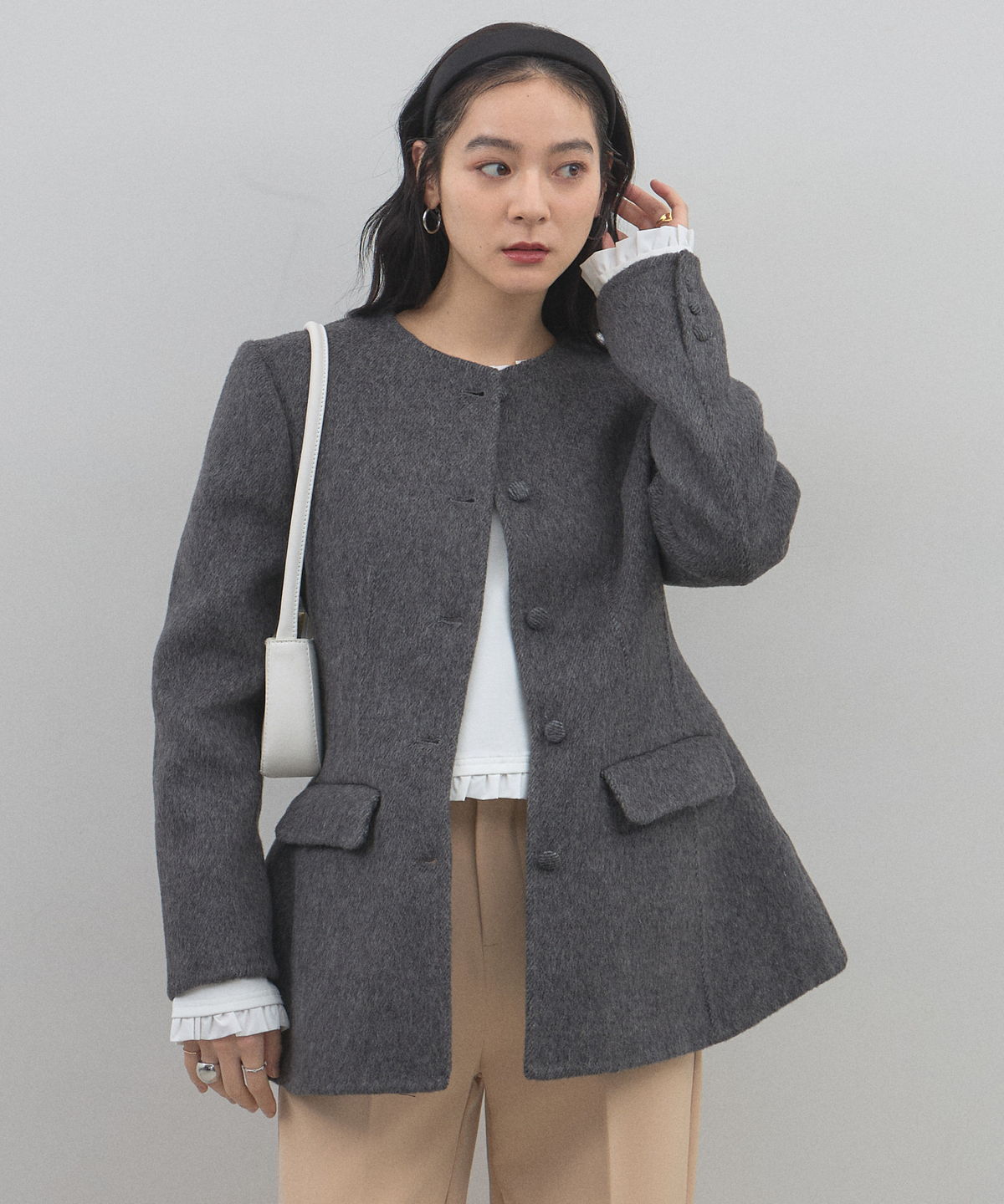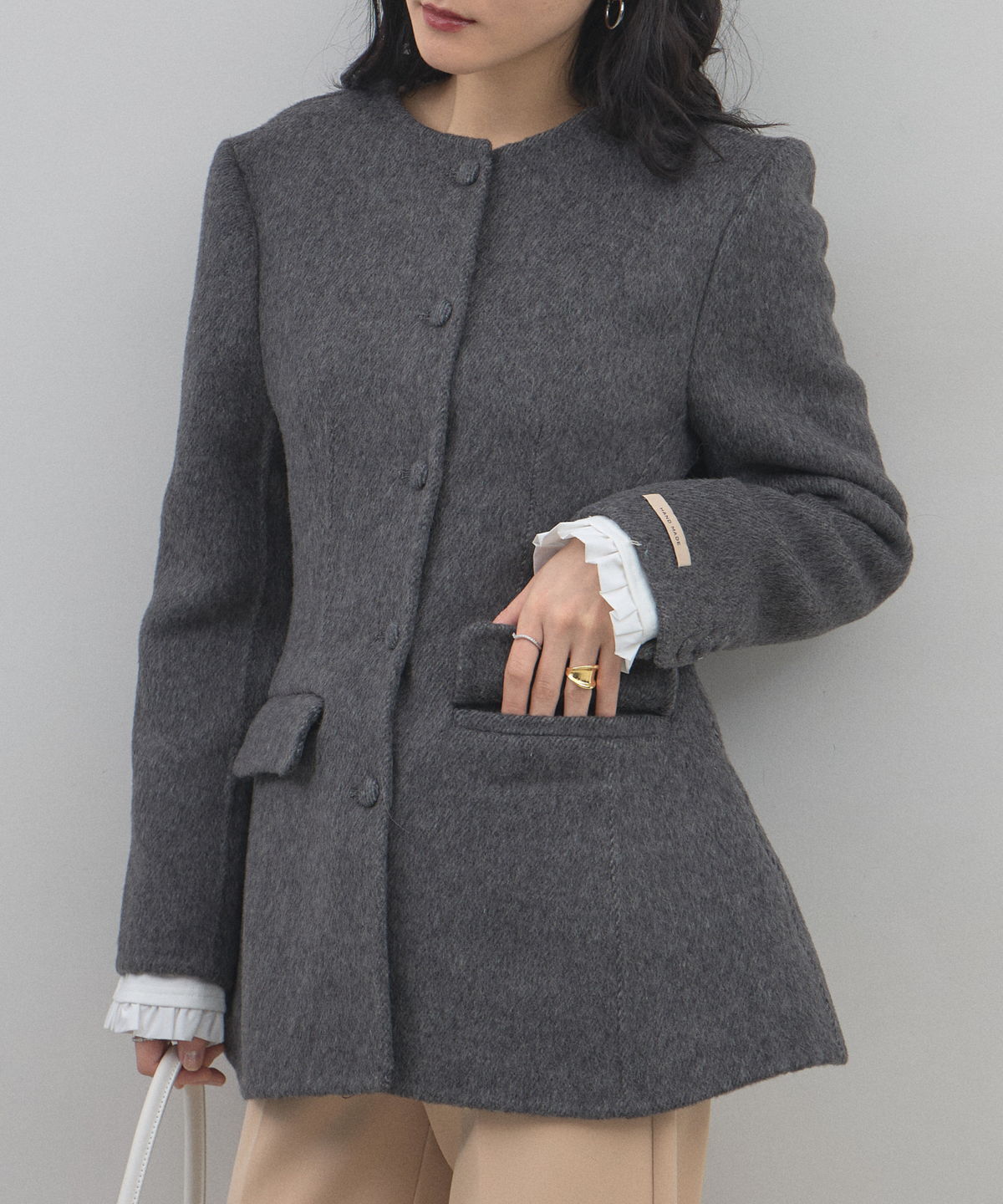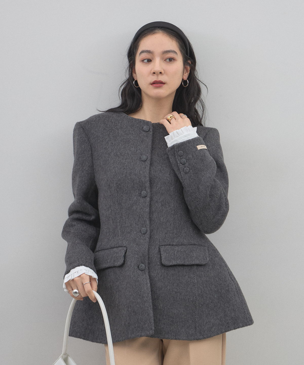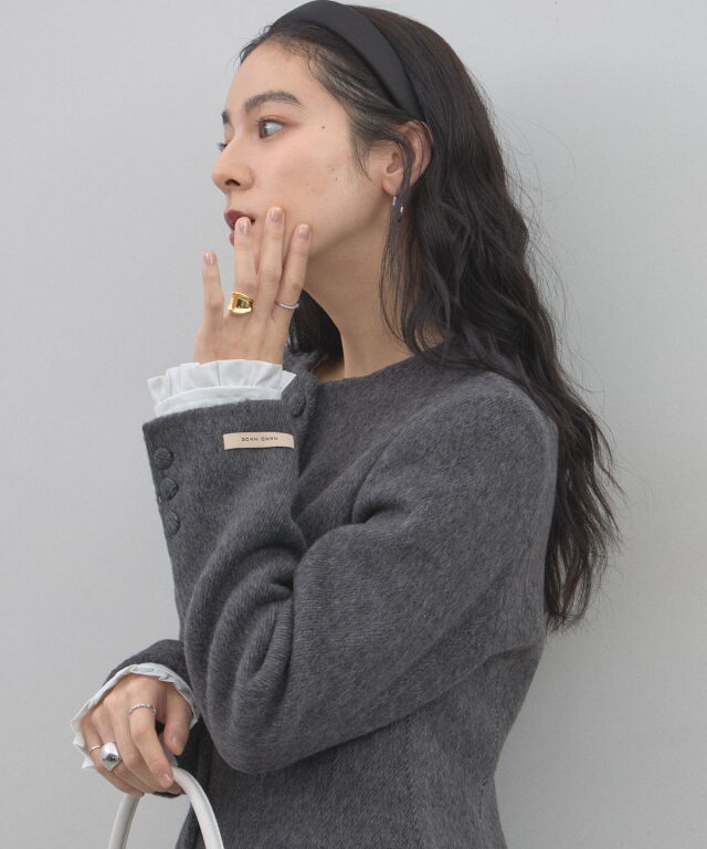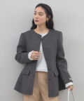 | 商品説明 | : | 削ぎ落とされた美しさに、素材の深みを。洗練を極めた大人のためのノーカラージャケット。 無駄を排したミニマルなデザインの中に、上質な素材の風合いが際立つノーカラージャケットです。 温かみのあるメランジ調の素材を採用し、かっちりしすぎない柔らかなニュアンスと、奥行きのある上品な表情を両立しました。 首元をすっきりと見せるノーカラーのデザインは、フリルブラウスやタートルネックを覗かせたレイヤードスタイルも美しく決まります。 少し長めの着丈と緩やかに広がるペプラム風のシルエットが、気になる腰回りをカバーしつつ、女性らしいしなやかなラインを演出。 オフィスシーンから特別な日のセレモニーまで、一歩先を行くエレガンスを叶えてくれる一着です。 |