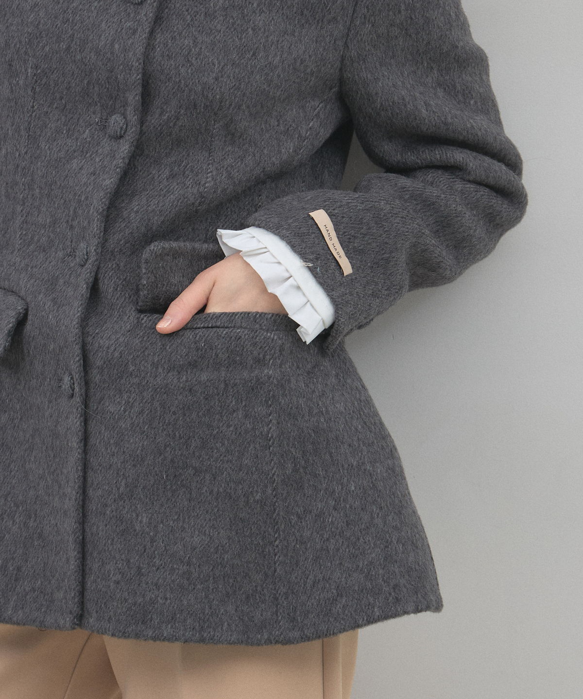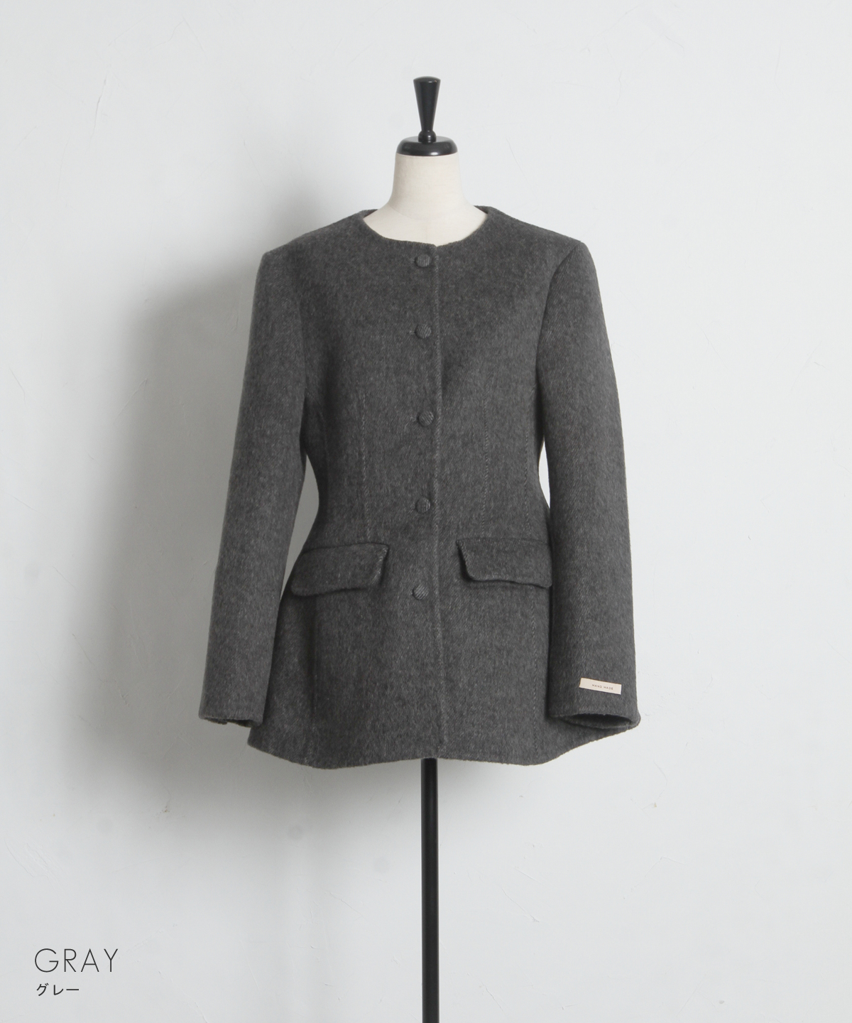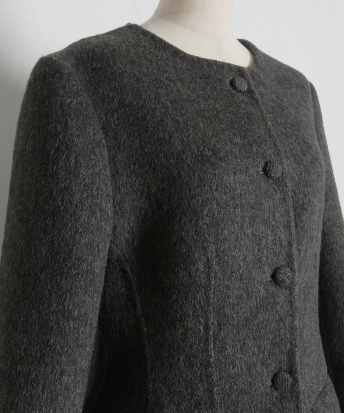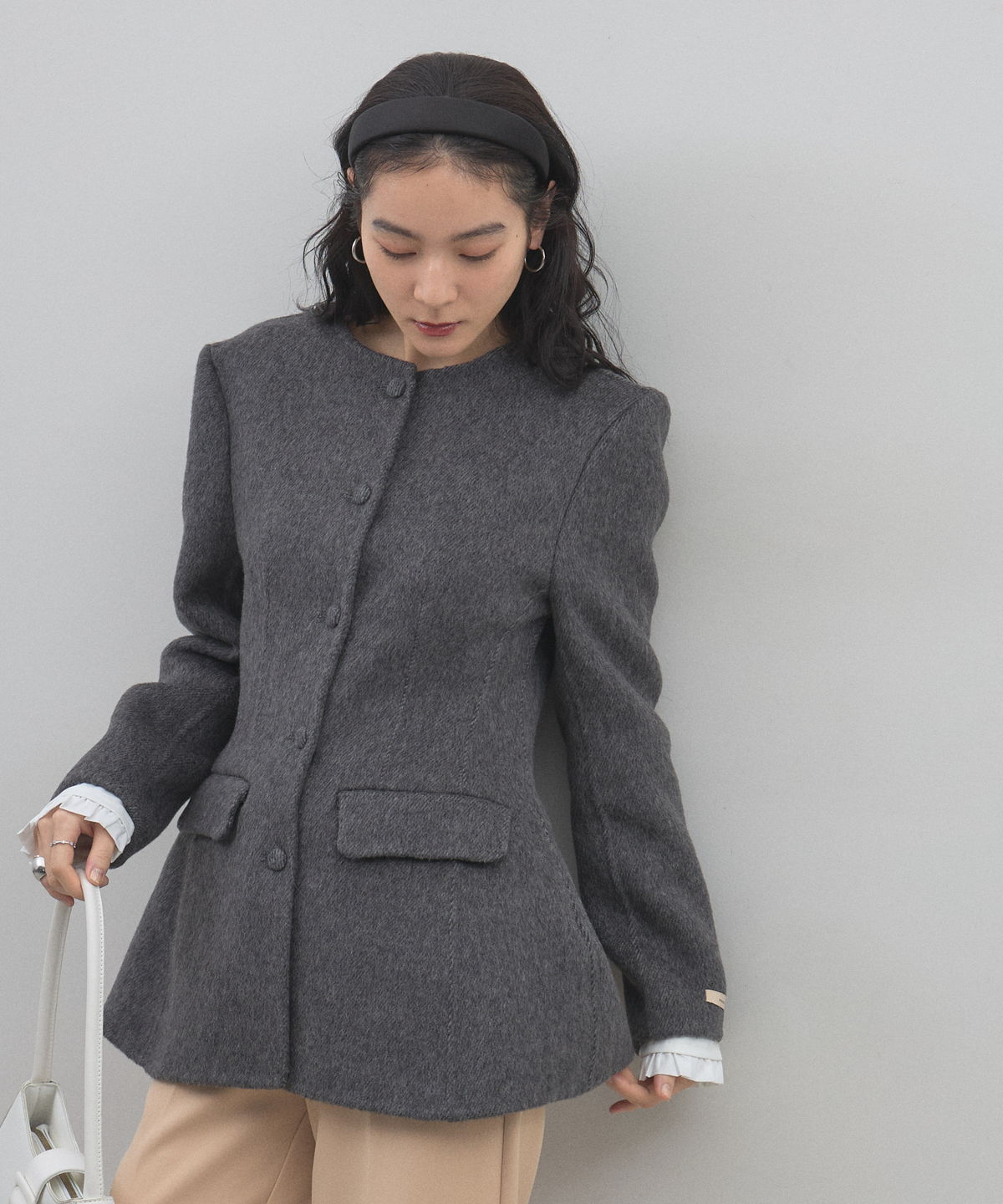 | 商品説明 | : | 削ぎ落とされた美しさに、素材の深みを。洗練を極めた大人のためのノーカラージャケット。 無駄を排したミニマルなデザインの中に、上質な素材の風合いが際立つノーカラージャケットです。 温かみのあるメランジ調の素材を採用し、かっちりしすぎない柔らかなニュアンスと、奥行きのある上品な表情を両立しました。 首元をすっきりと見せるノーカラーのデザインは、フリルブラウスやタートルネックを覗かせたレイヤードスタイルも美しく決まります。 少し長めの着丈と緩やかに広がるペプラム風のシルエットが、気になる腰回りをカバーしつつ、女性らしいしなやかなラインを演出。 オフィスシーンから特別な日のセレモニーまで、一歩先を行くエレガンスを叶えてくれる一着です。 |