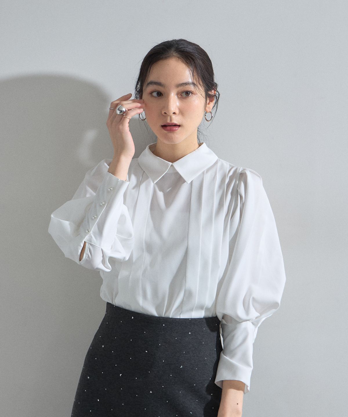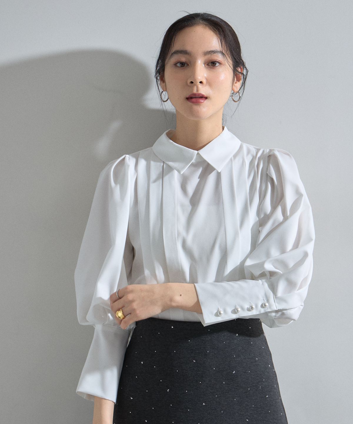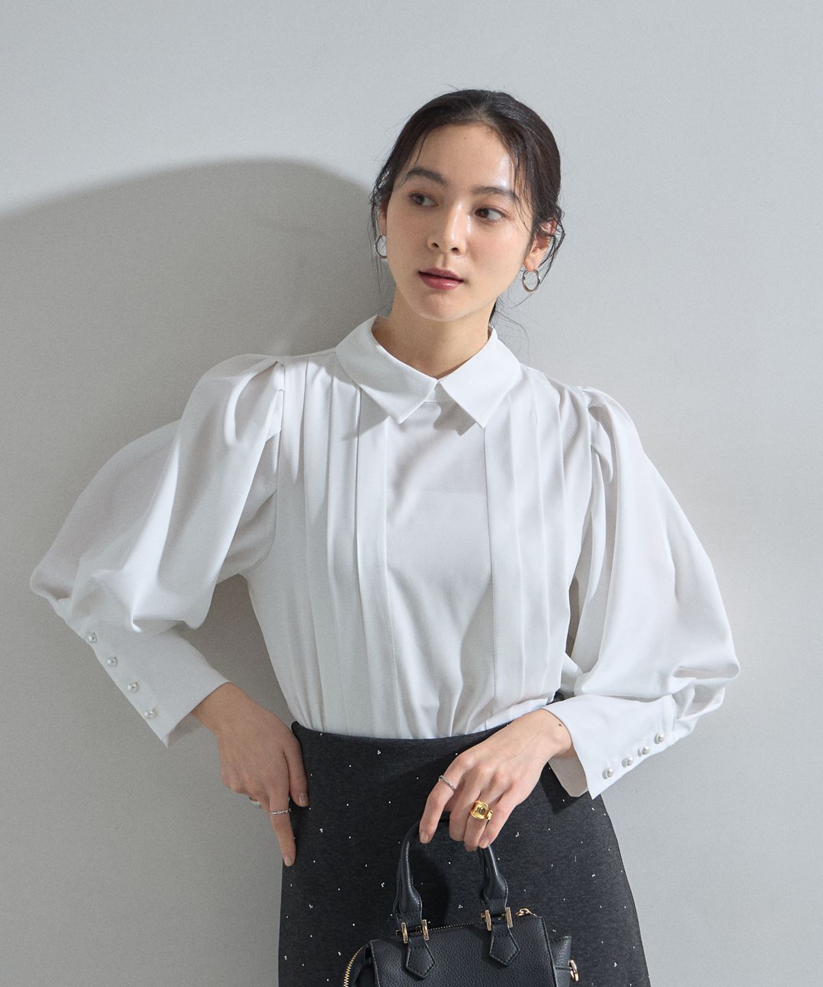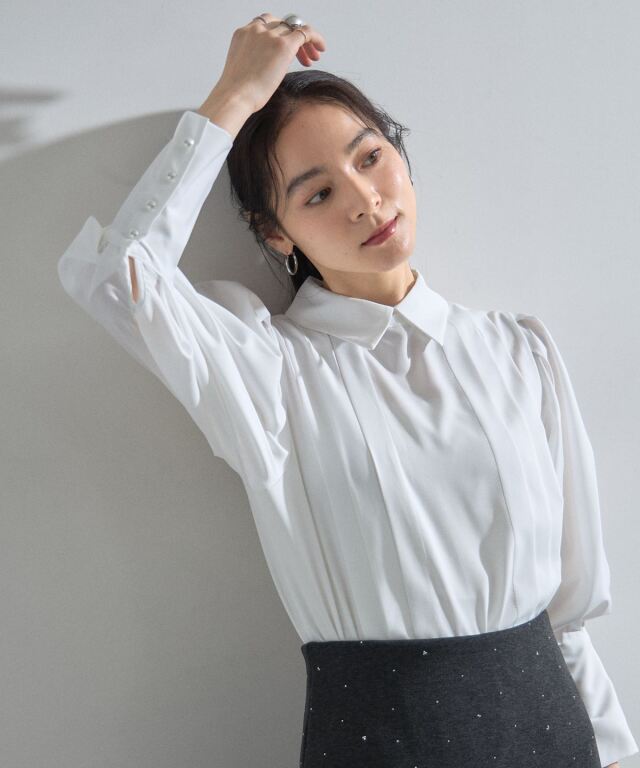 | 商品説明 | : | 端正なピンタックとボリューム袖が織りなす、洗練のモダンクラシカル。 フロントに施された流れるようなピンタックが、縦のラインを強調し、凛とした知的な表情を演出。 ふんわりと膨らむボリューム袖とのコントラストが美しく、一枚で主役級の存在感を放ちます。 袖口のパール調ボタンや、程よく立ち上がった襟元など、細部までこだわりが詰まった上品な一着。 クリーンな白が顔周りを明るく見せ、オフィスから華やかなシーンまで、 着る人の気品を引き立ててくれます。 |