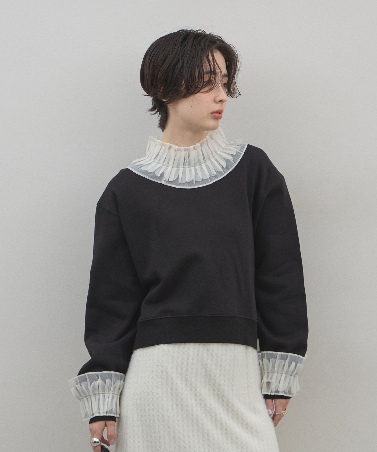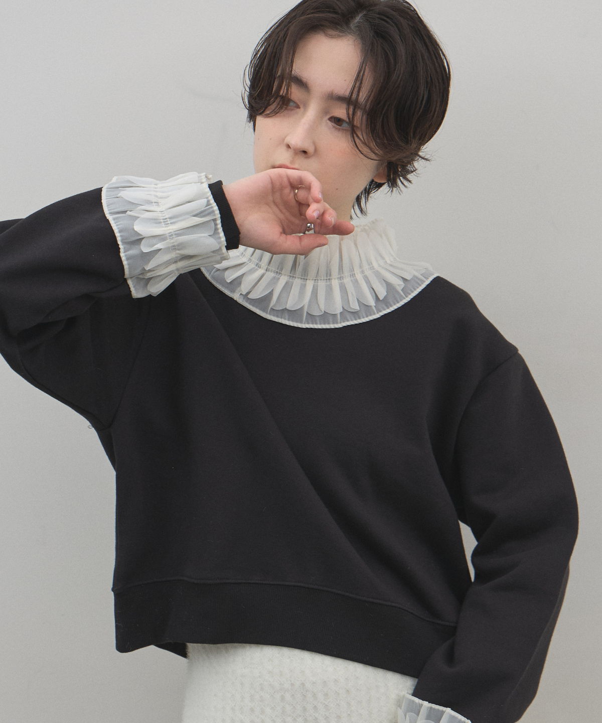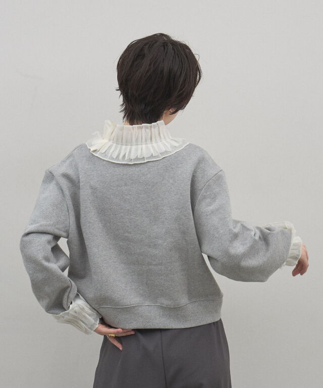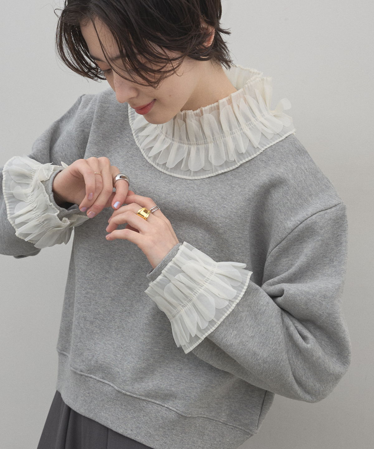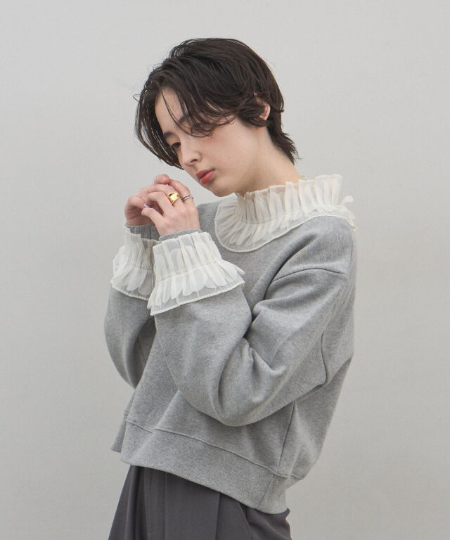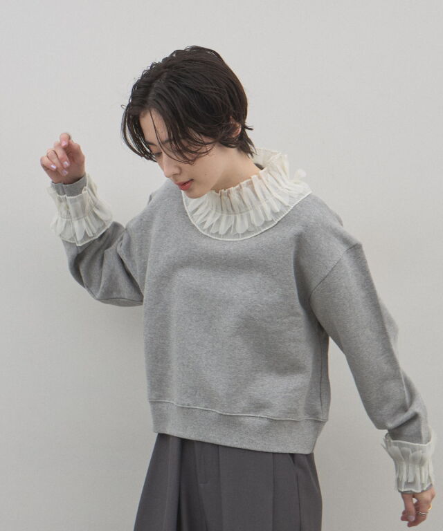 | 商品説明 | : | スポーティに甘さを添えて。チュールフリルが目を惹く、大人のモードスウェット。 カジュアルなスウェットに、ボリューミーな白のチュールフリルをドッキングした主役級トップス。 首元と袖口にあしらわれたシアーな透け感が、 重くなりがちな冬のスタイルに軽やかさと女性らしい華やかさをプラスします。 身頃はすっきりとした着丈で、ハイウエストのボトムスとも相性抜群。 一枚でサマになるのはもちろん、あえてカジュアルなデニムや、 タイトなスカートと合わせて素材のコントラストを楽しむのもおすすめです。 日常のスタイルにモードな遊び心を添える、拘りの詰まった一着です。 |