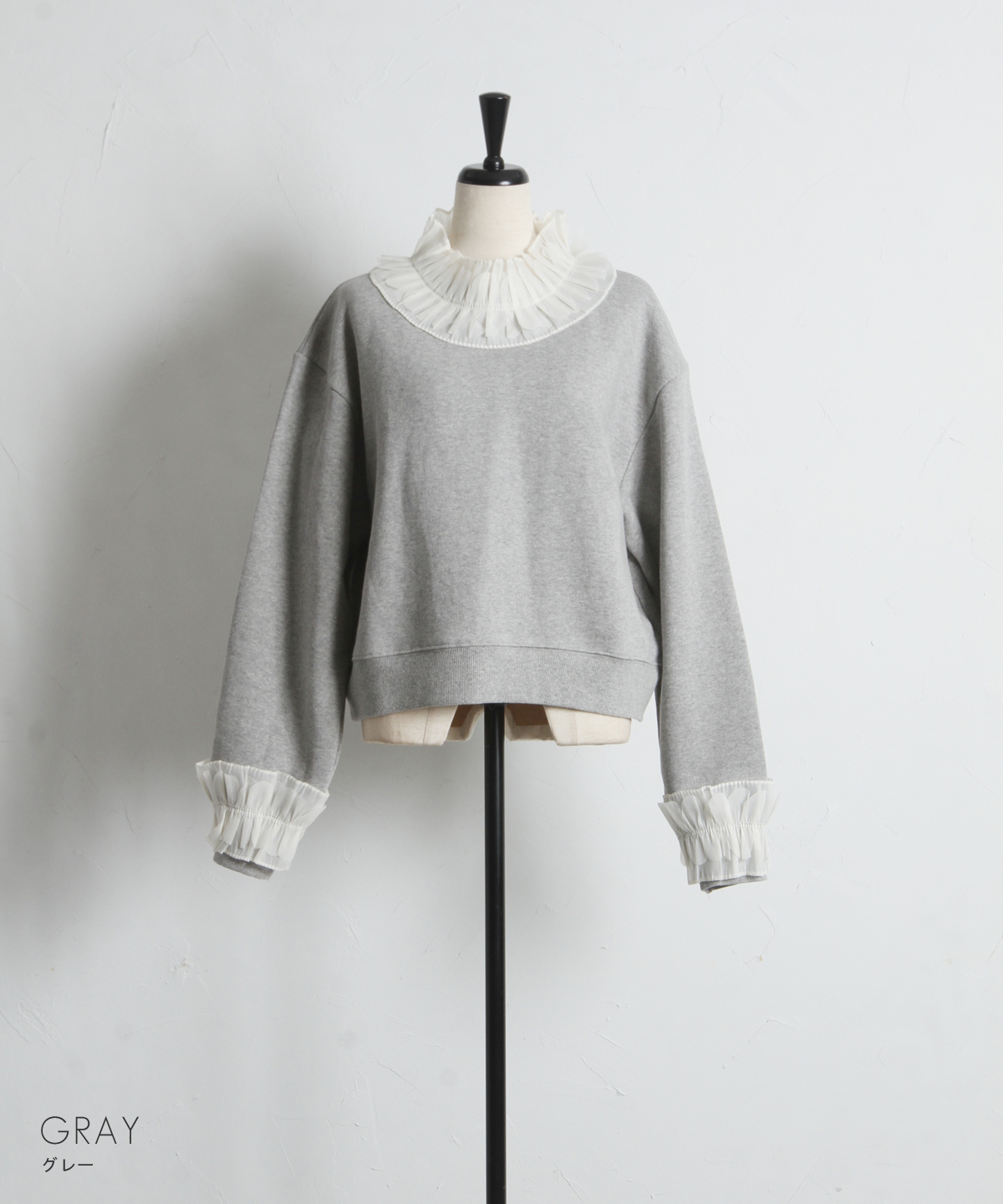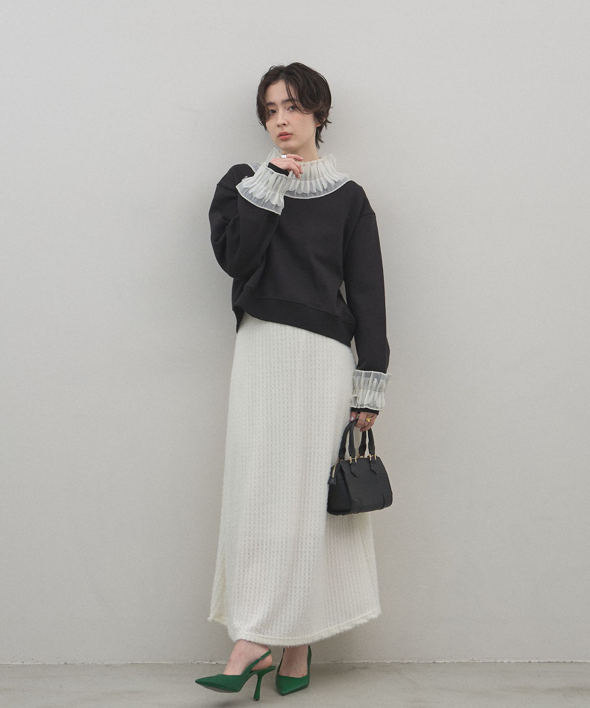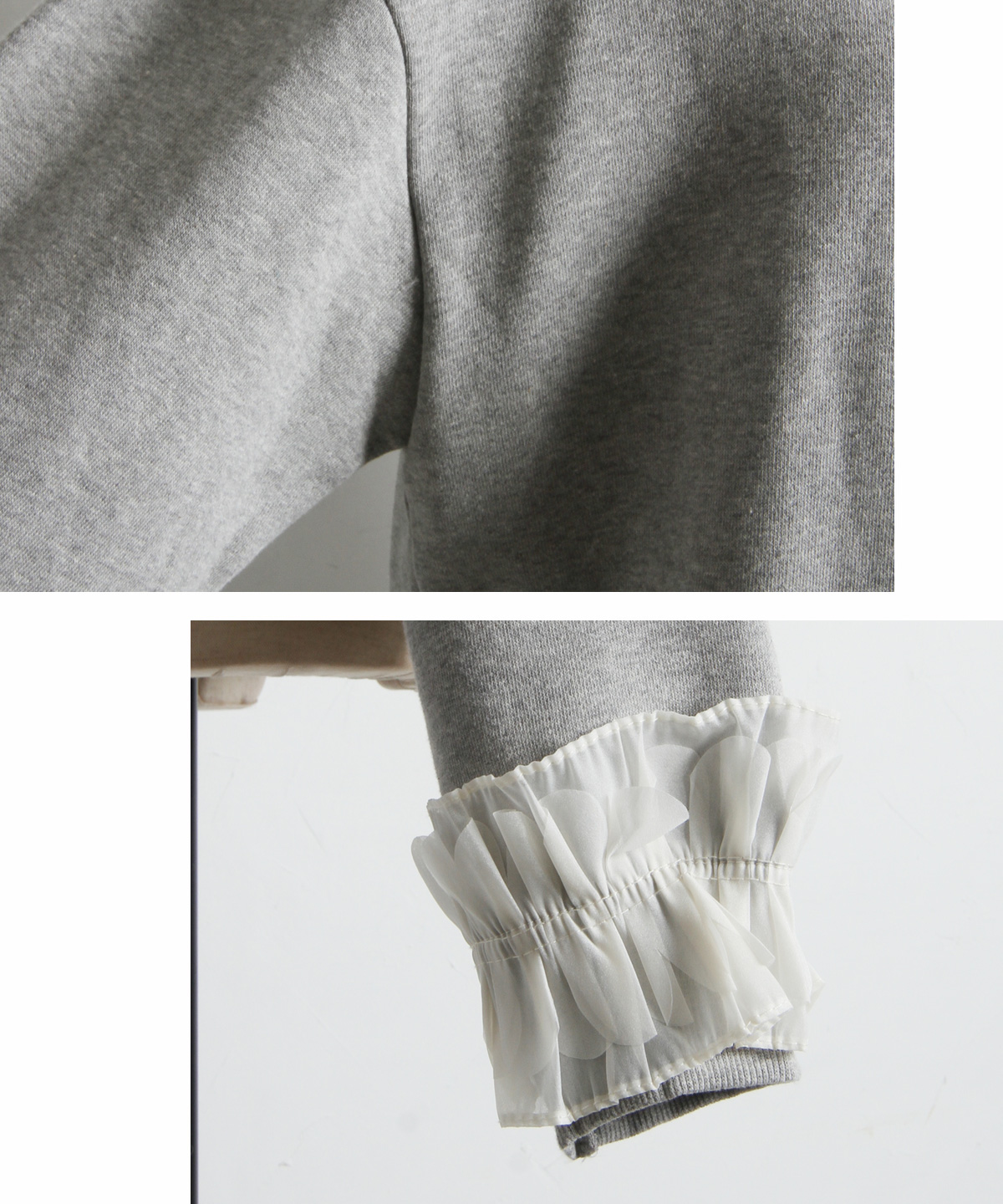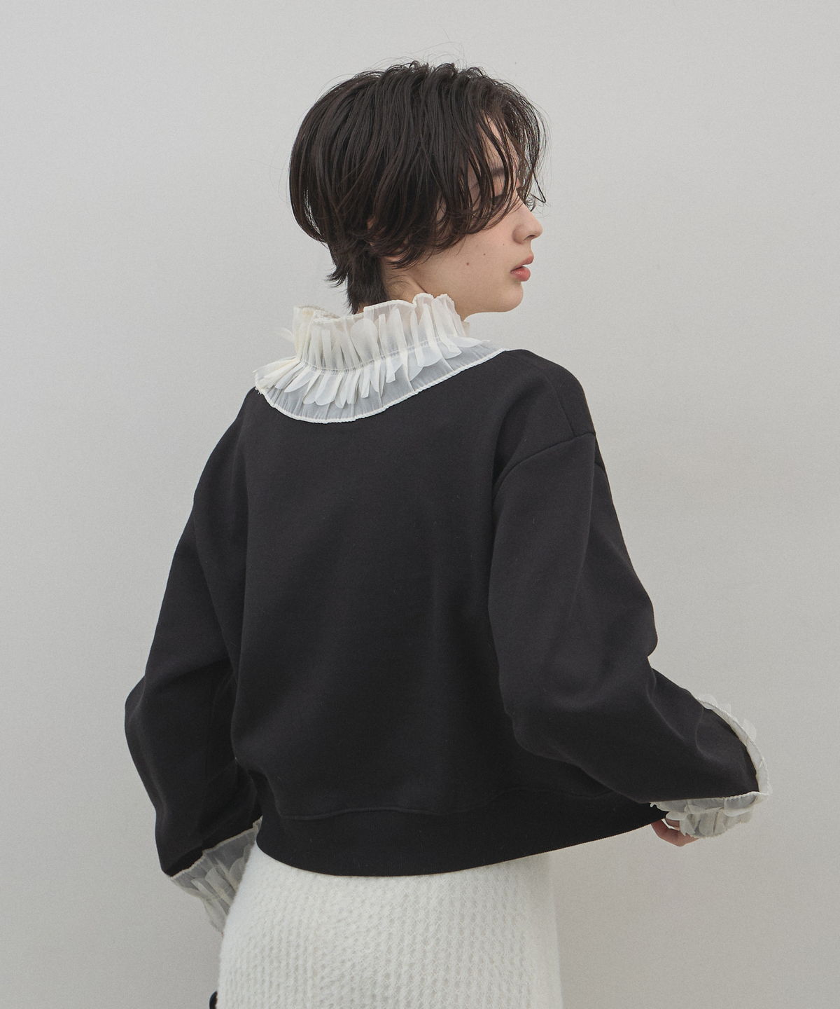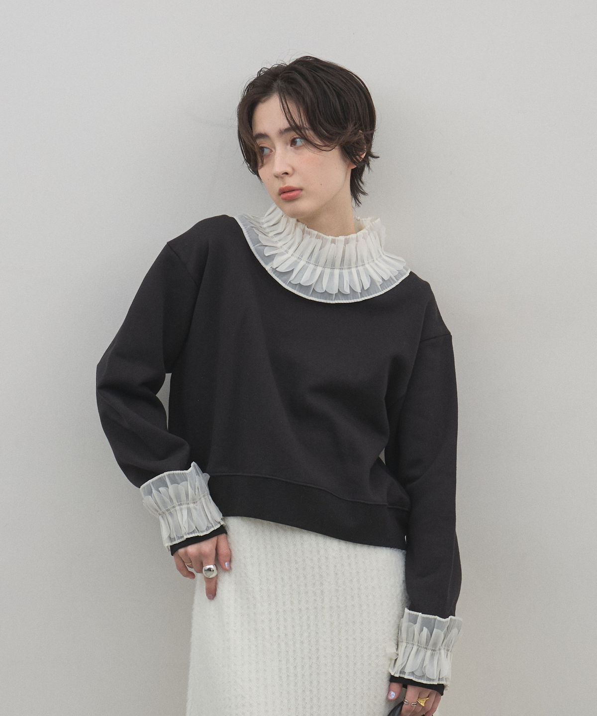 | 商品説明 | : | スポーティに甘さを添えて。チュールフリルが目を惹く、大人のモードスウェット。 カジュアルなスウェットに、ボリューミーな白のチュールフリルをドッキングした主役級トップス。 首元と袖口にあしらわれたシアーな透け感が、 重くなりがちな冬のスタイルに軽やかさと女性らしい華やかさをプラスします。 身頃はすっきりとした着丈で、ハイウエストのボトムスとも相性抜群。 一枚でサマになるのはもちろん、あえてカジュアルなデニムや、 タイトなスカートと合わせて素材のコントラストを楽しむのもおすすめです。 日常のスタイルにモードな遊び心を添える、拘りの詰まった一着です。 |
