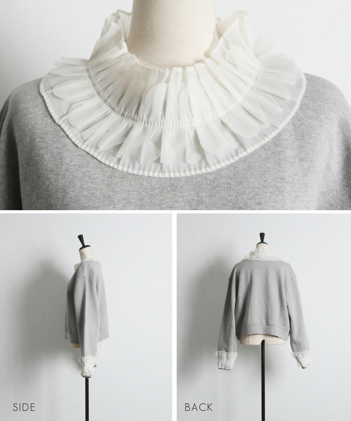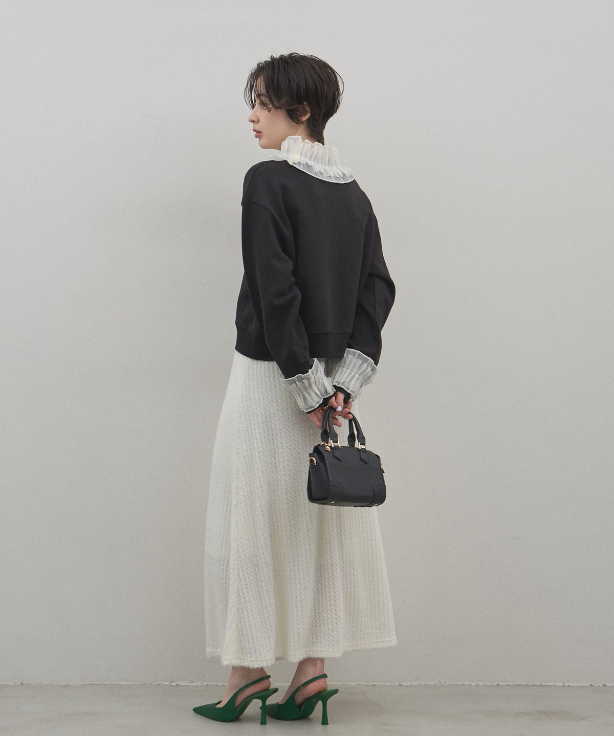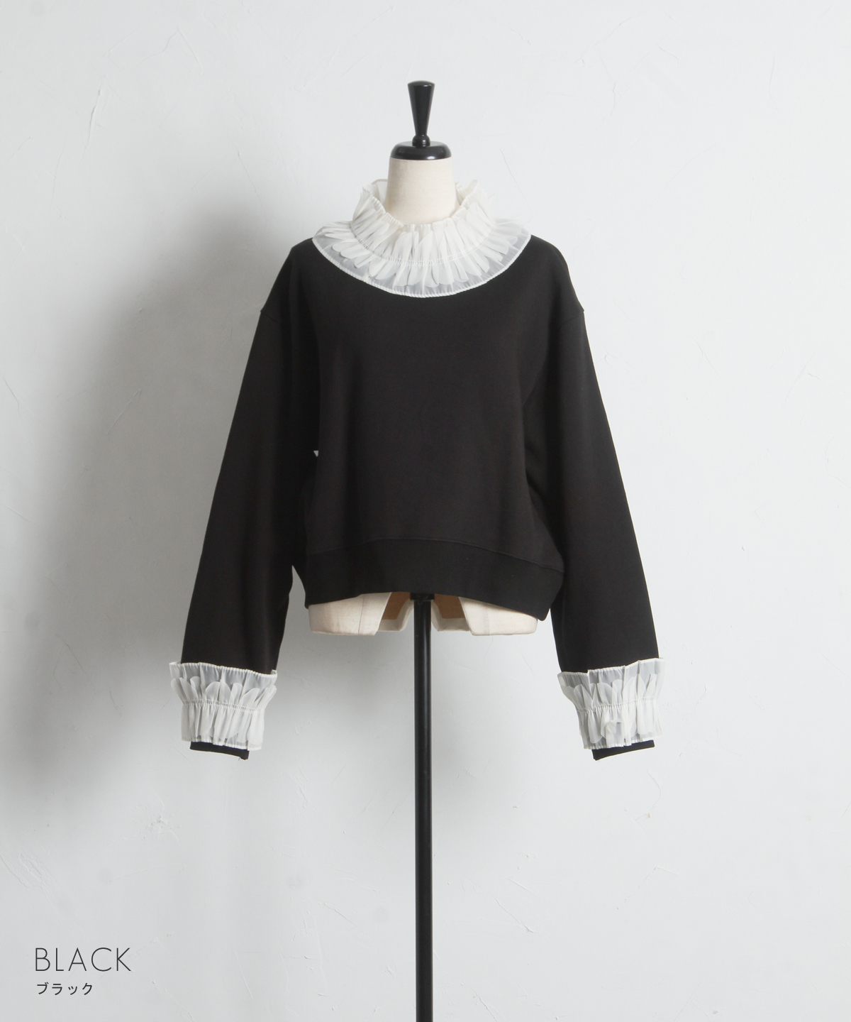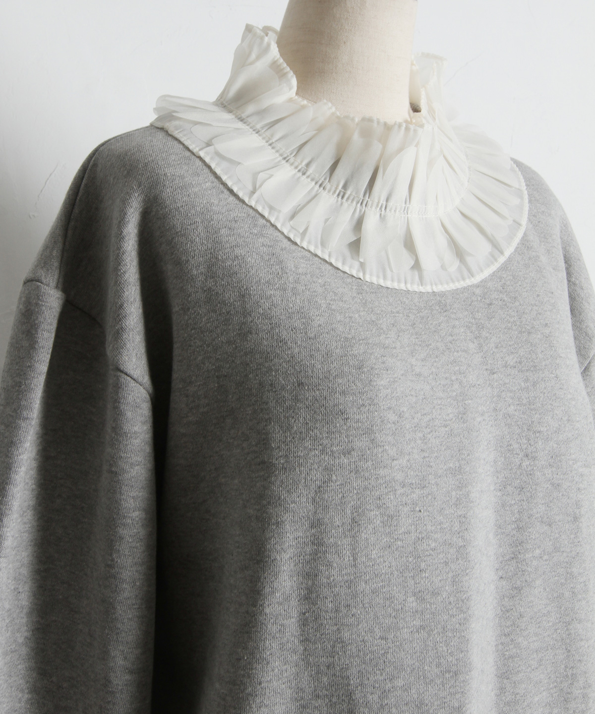 | 商品説明 | : | スポーティに甘さを添えて。チュールフリルが目を惹く、大人のモードスウェット。 カジュアルなスウェットに、ボリューミーな白のチュールフリルをドッキングした主役級トップス。 首元と袖口にあしらわれたシアーな透け感が、 重くなりがちな冬のスタイルに軽やかさと女性らしい華やかさをプラスします。 身頃はすっきりとした着丈で、ハイウエストのボトムスとも相性抜群。 一枚でサマになるのはもちろん、あえてカジュアルなデニムや、 タイトなスカートと合わせて素材のコントラストを楽しむのもおすすめです。 日常のスタイルにモードな遊び心を添える、拘りの詰まった一着です。 |