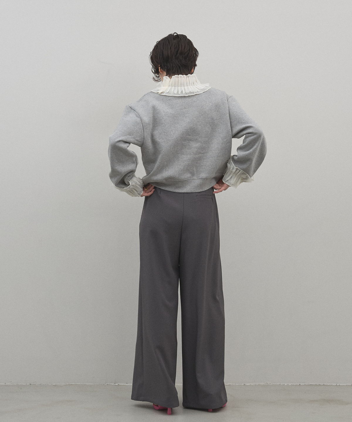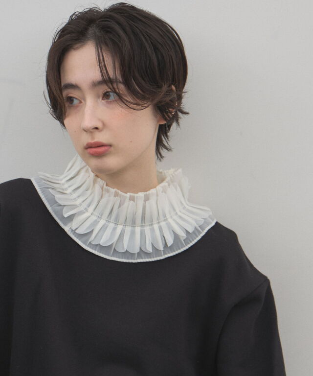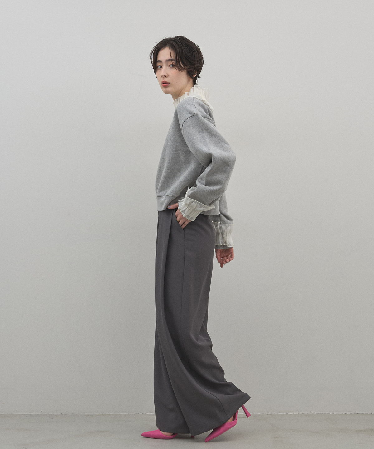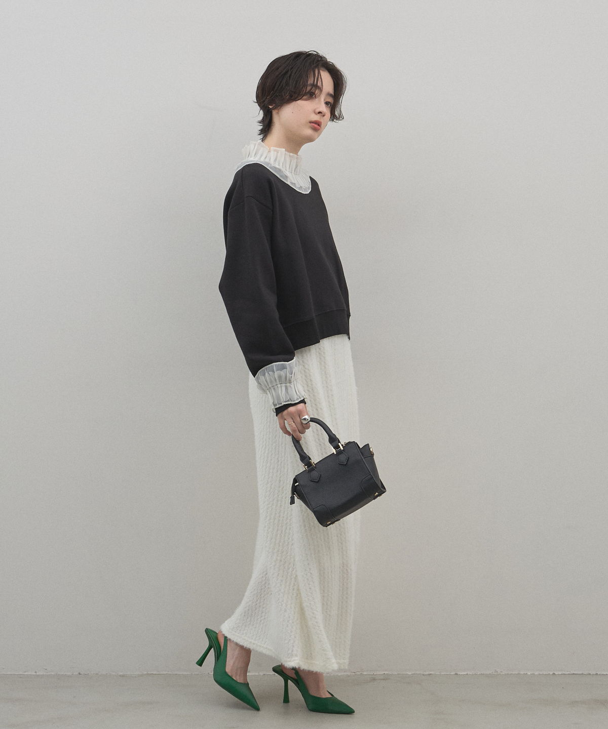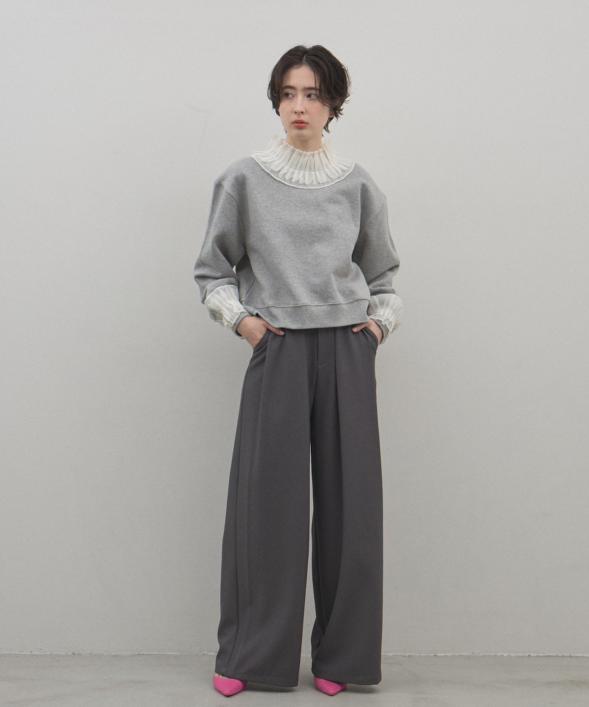| 商品説明 | : | スポーティに甘さを添えて。チュールフリルが目を惹く、大人のモードスウェット。 カジュアルなスウェットに、ボリューミーな白のチュールフリルをドッキングした主役級トップス。 首元と袖口にあしらわれたシアーな透け感が、 重くなりがちな冬のスタイルに軽やかさと女性らしい華やかさをプラスします。 身頃はすっきりとした着丈で、ハイウエストのボトムスとも相性抜群。 一枚でサマになるのはもちろん、あえてカジュアルなデニムや、 タイトなスカートと合わせて素材のコントラストを楽しむのもおすすめです。 日常のスタイルにモードな遊び心を添える、拘りの詰まった一着です。 |