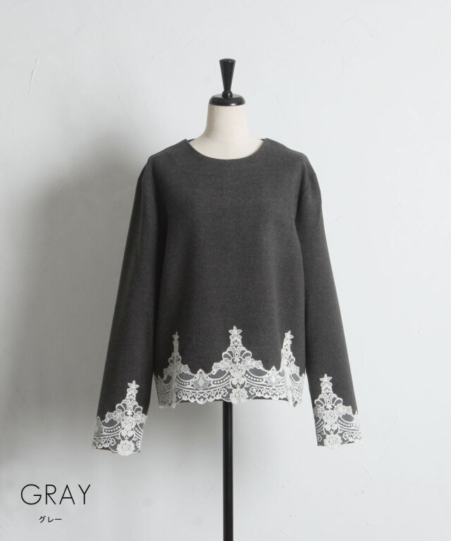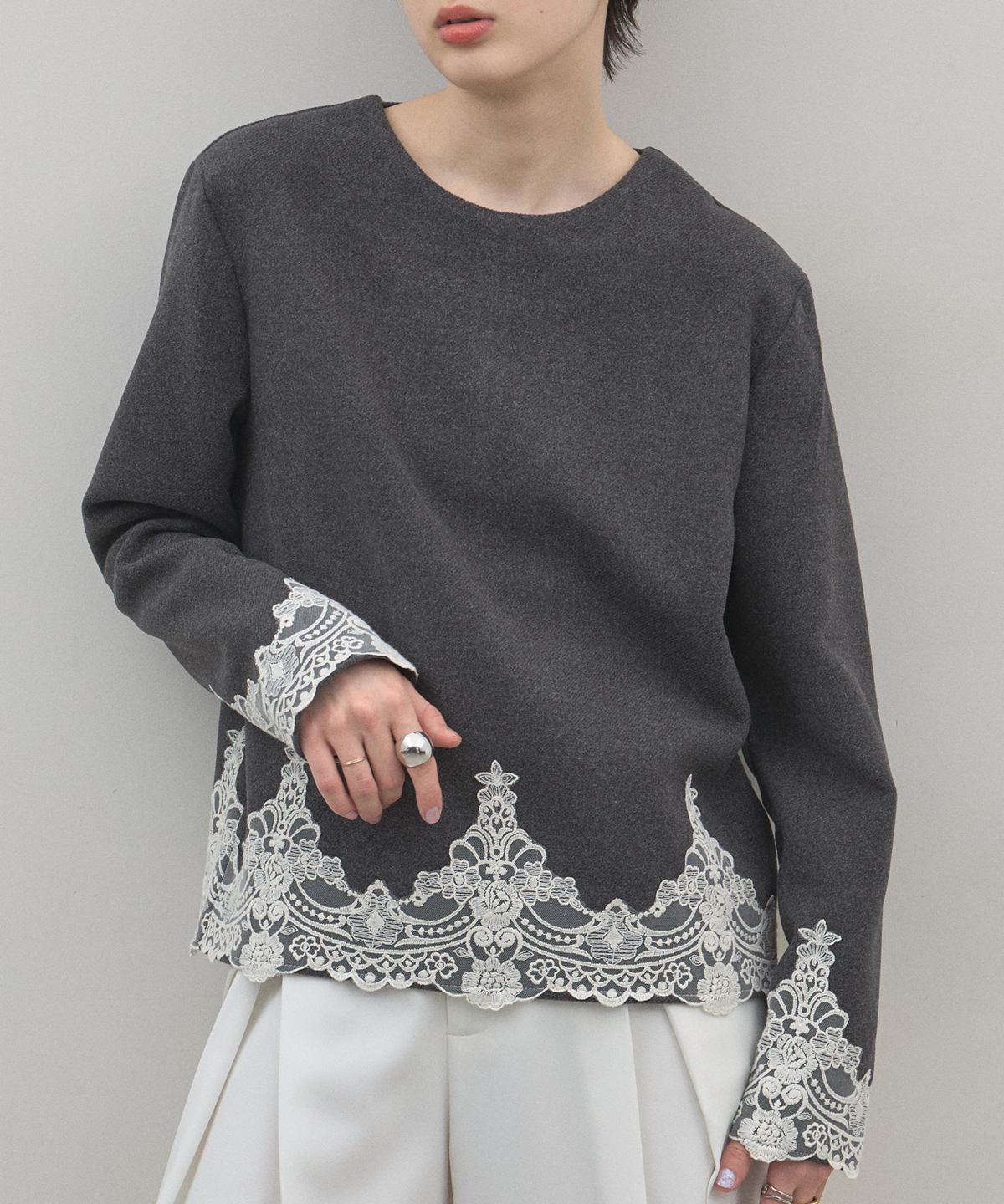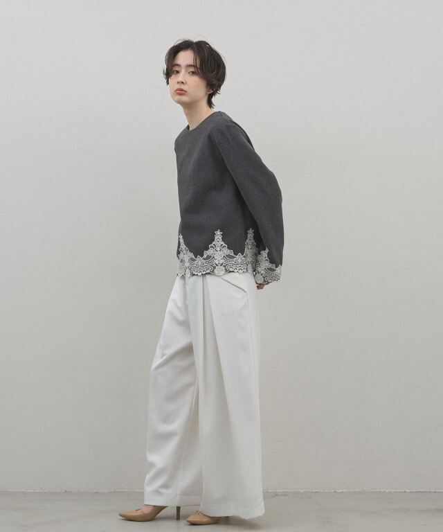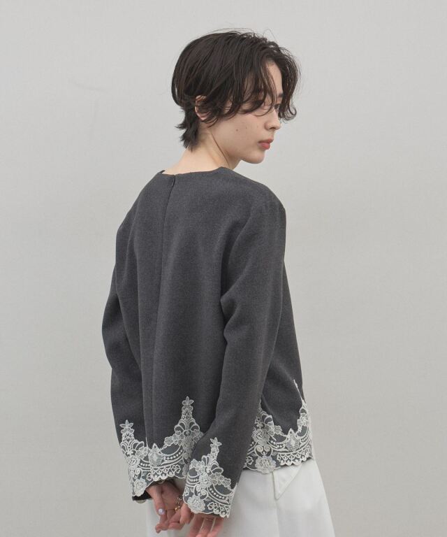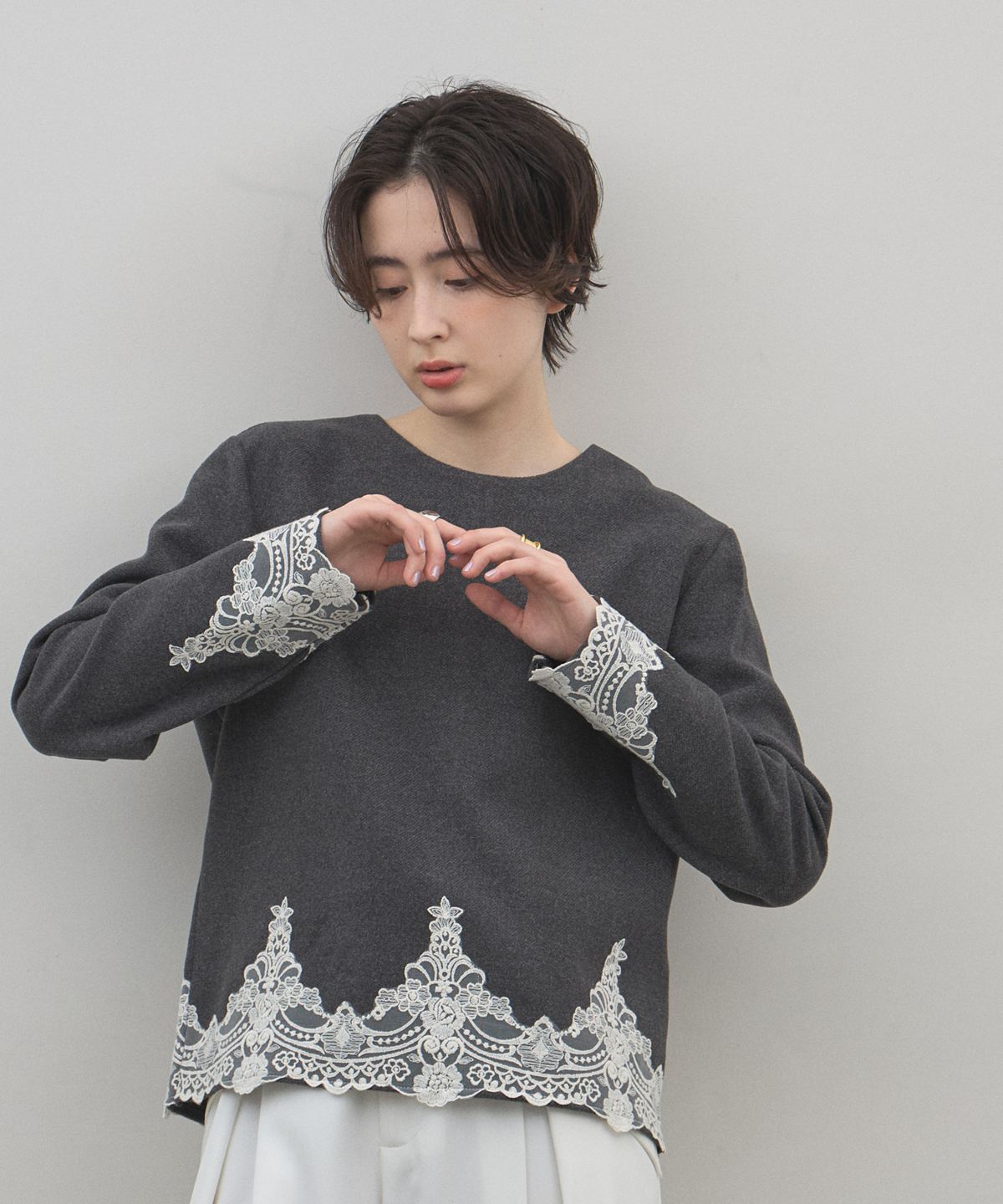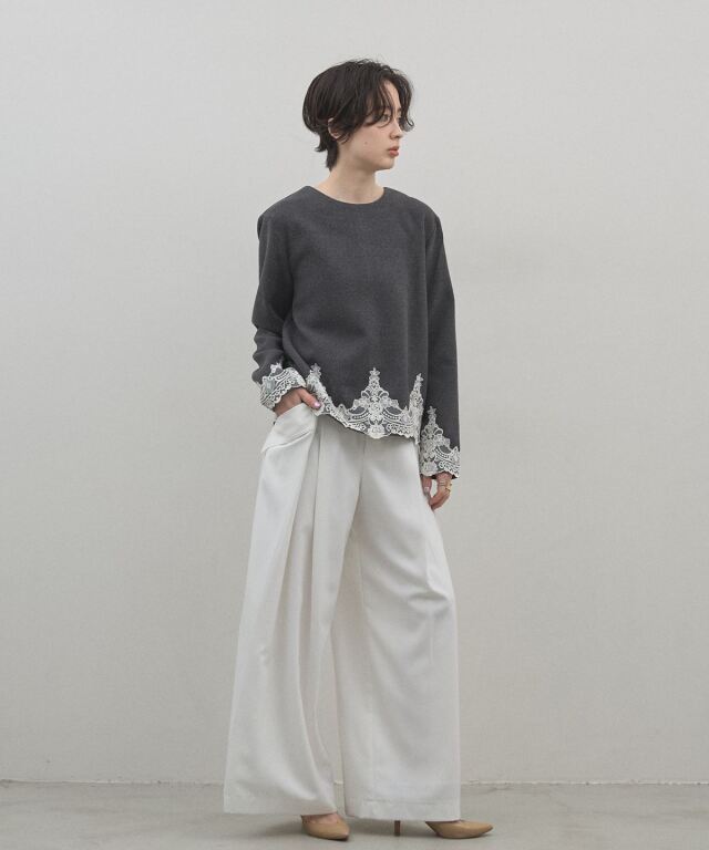 | 商品説明 | : | 日常をクラスアップさせる、静かな華やぎを纏う繊細レースのプルオーバー。 シックなチャコールカラーのボディに、ヴィンテージライクな白レースを贅沢にあしらった一着。 袖口と裾に配された大ぶりのレースが、重たくなりがちな冬の装いに軽やかさと上品な甘さをプラスします。 身幅にゆとりを持たせたボックスシルエットは、体型を拾わずリラックスした着心地を実現。 きれいめなスラックスでモードに、 デニムでカジュアルダウンしても様になります。大人のこだわりを感じさせる、主役級のトップスです。 |