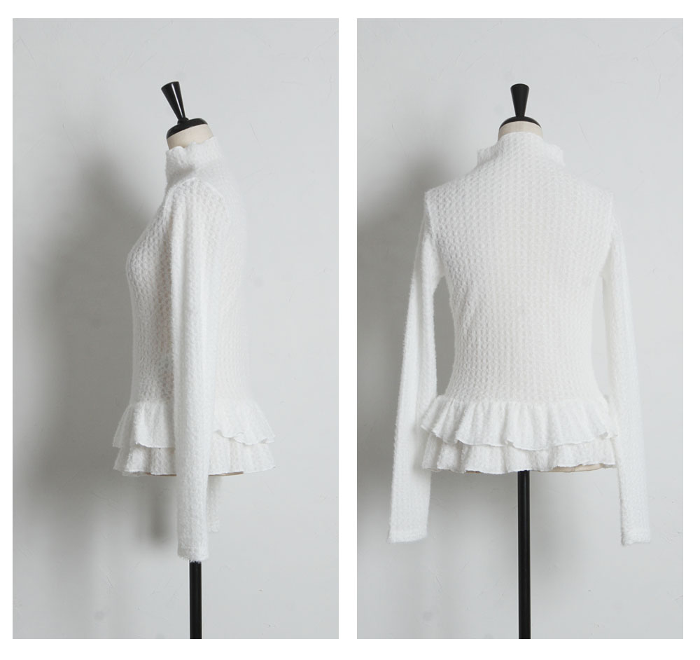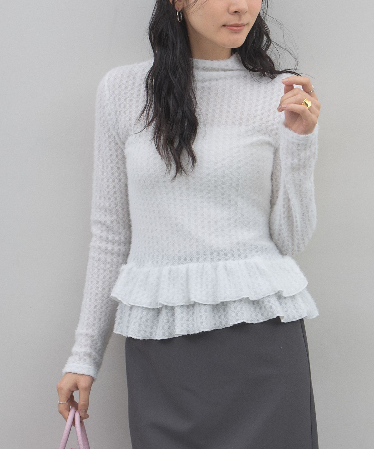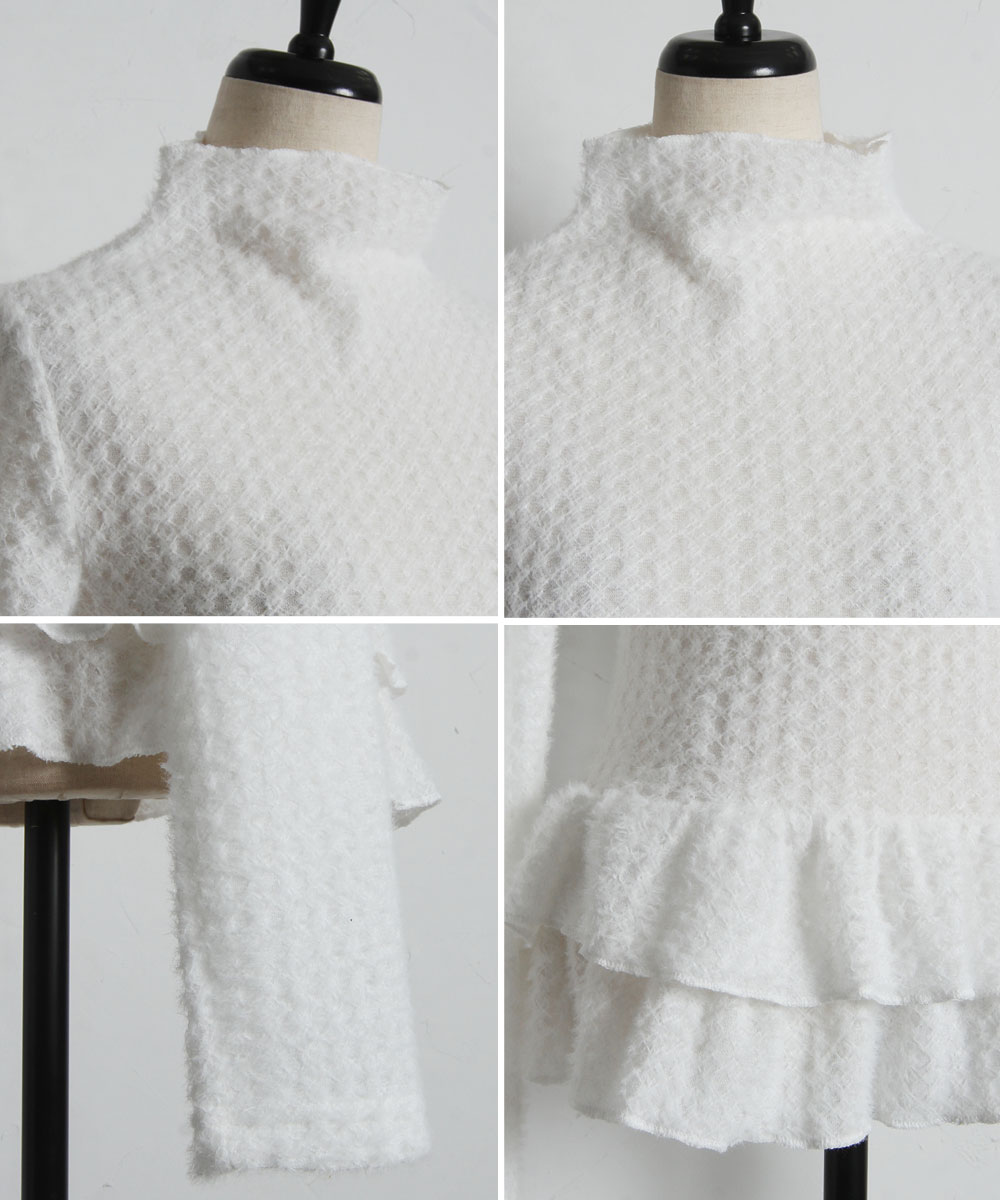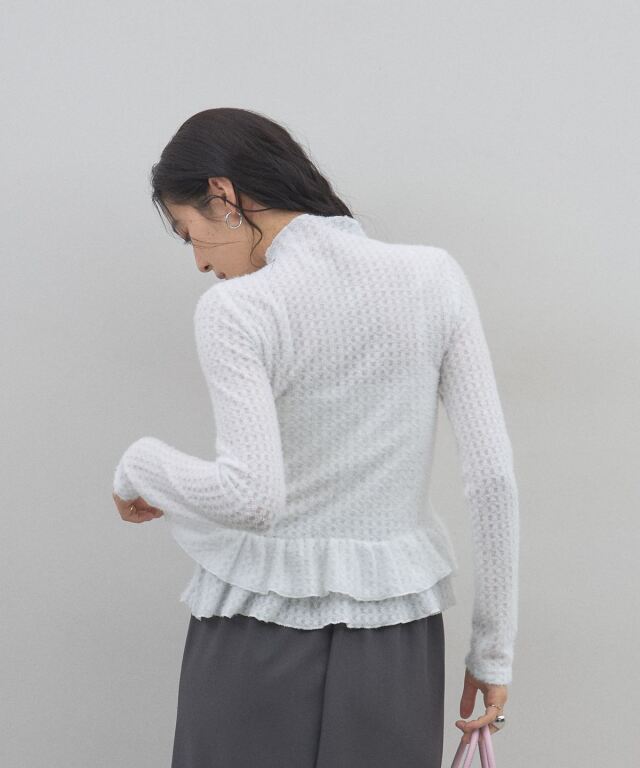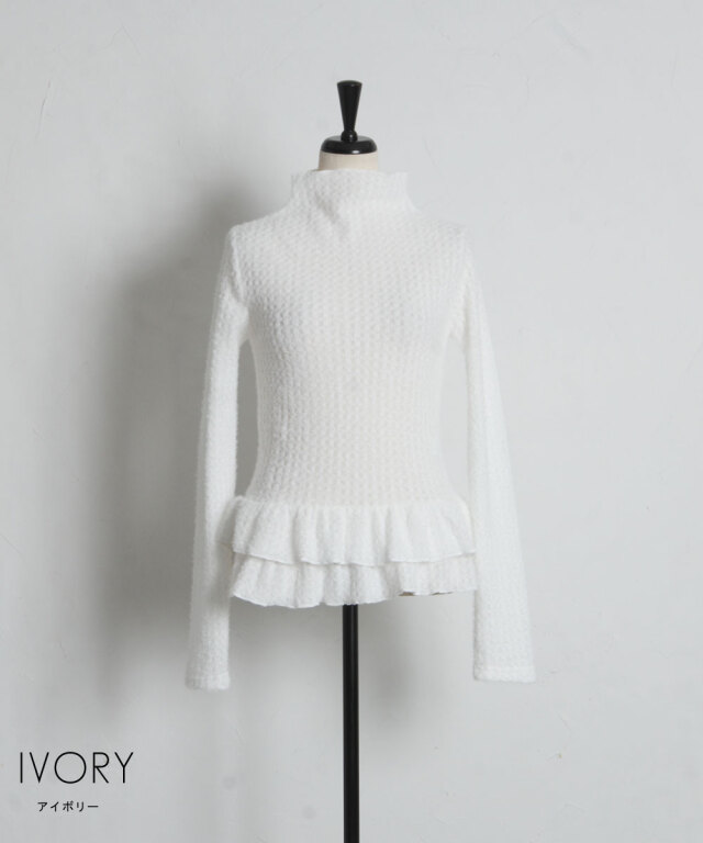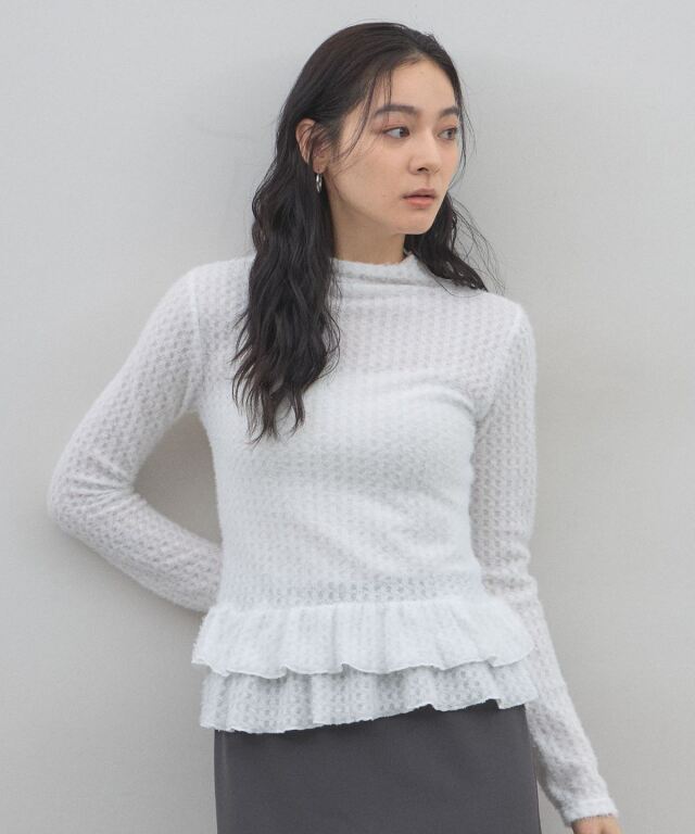 | 商品説明 | : | 可憐なフリルが腰回りを彩る、大人可愛いを叶える主役級ペプラムニット。 裾にあしらわれた2段のメロウフリルが、女性らしく華やかなシルエットを演出。 ふんわりとした起毛感のある編み地が、優しげで柔らかなニュアンスをプラスします。 腰位置を高く見せるペプラムデザインは、スタイルアップ効果も抜群。 タイトなスカートや細身のパンツと合わせるだけで、 甘さと上品さのバランスが絶妙な、洗練された冬のフェミニンスタイルが完成します。 |