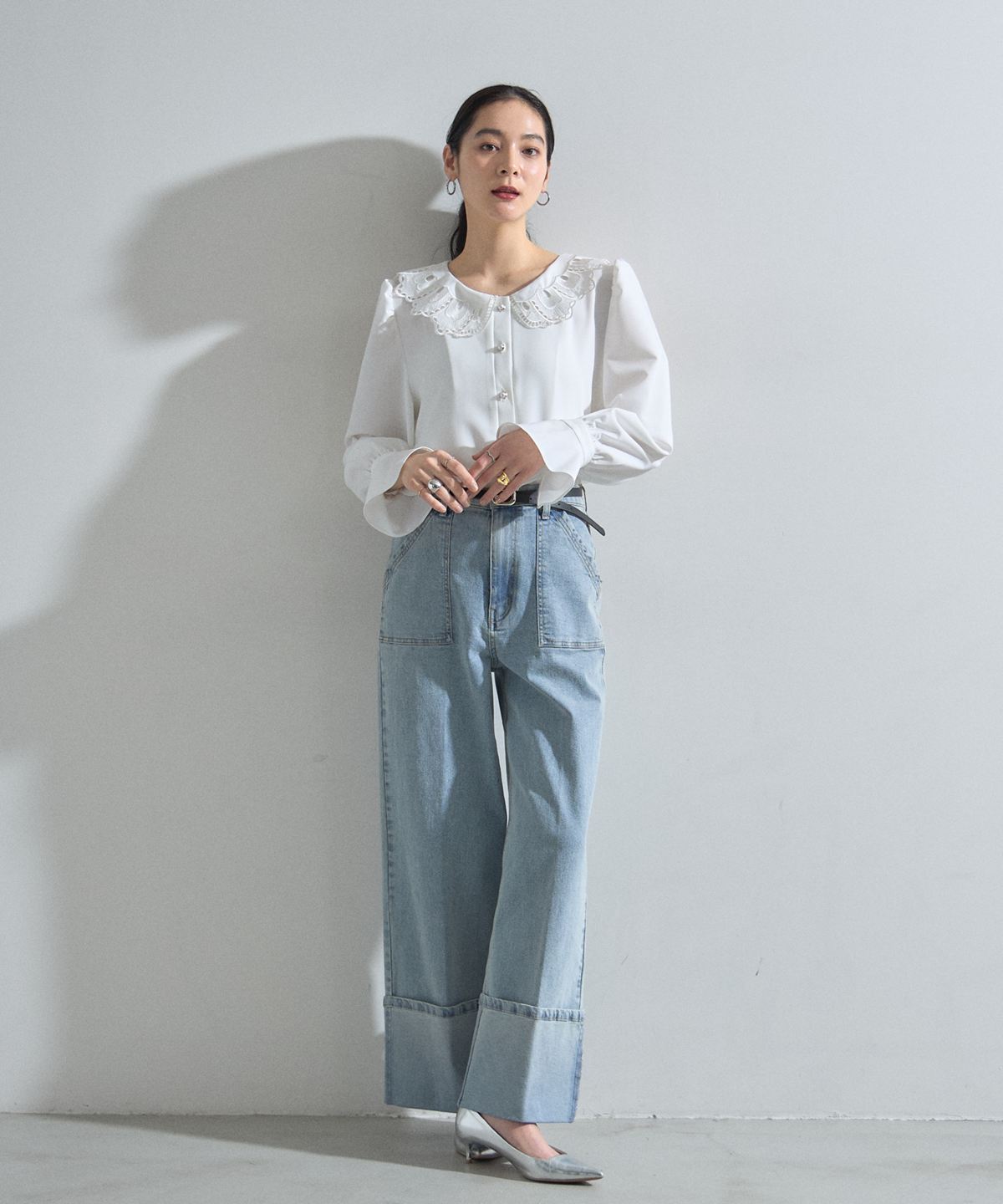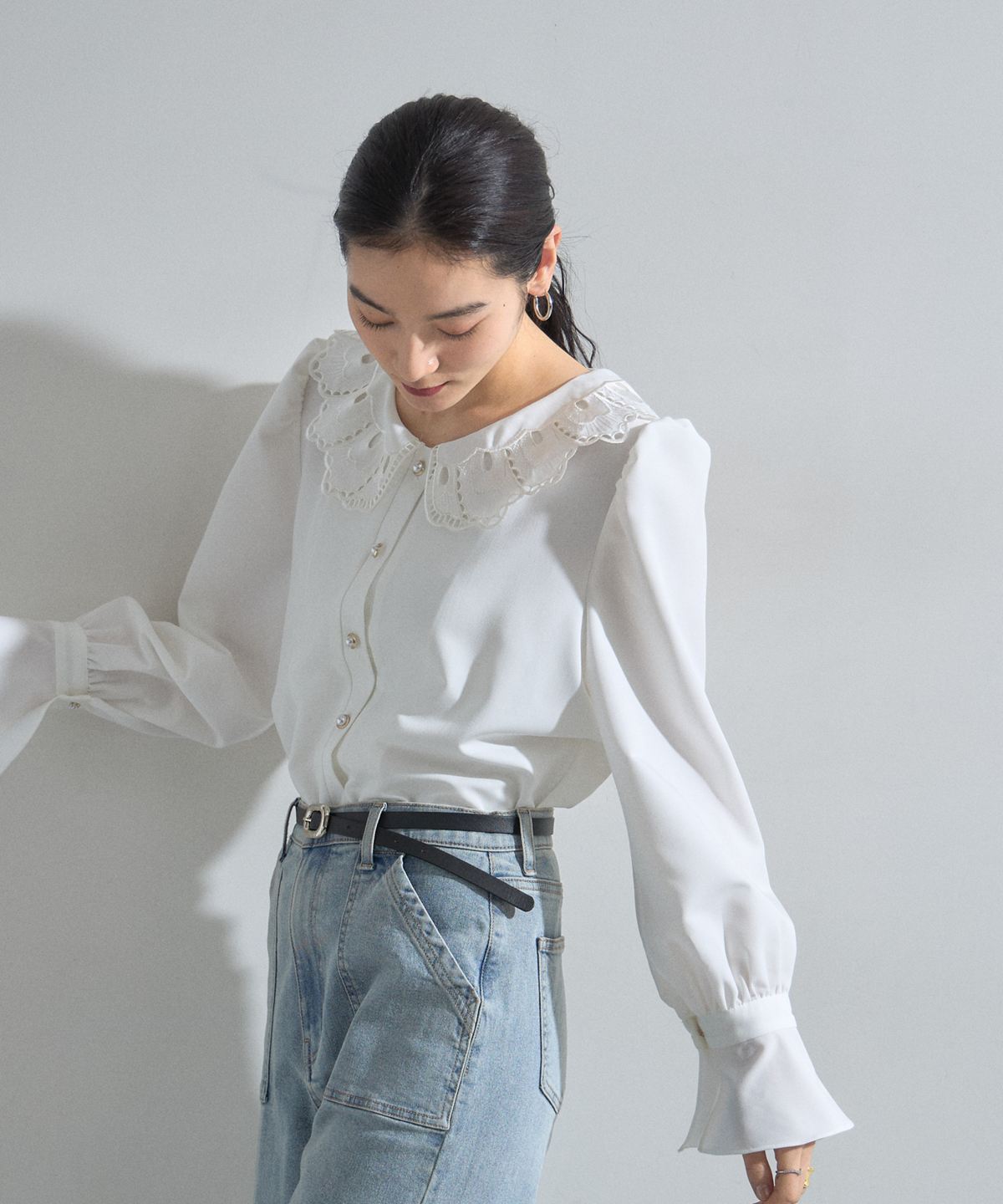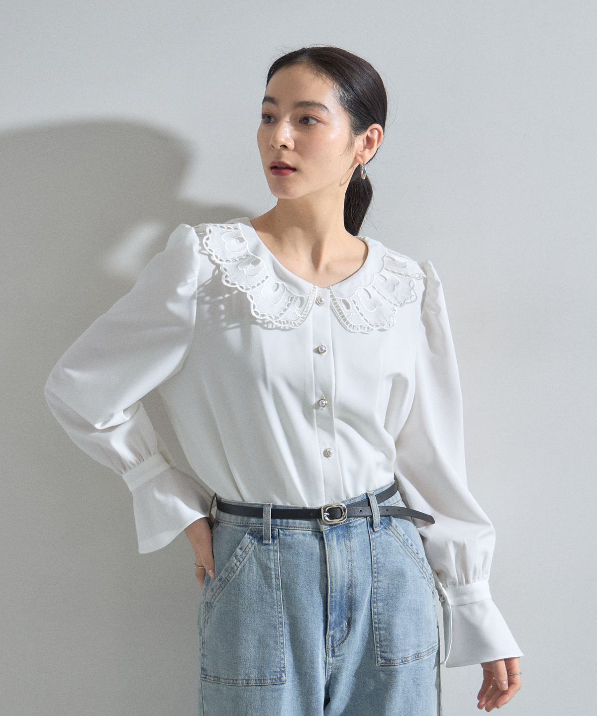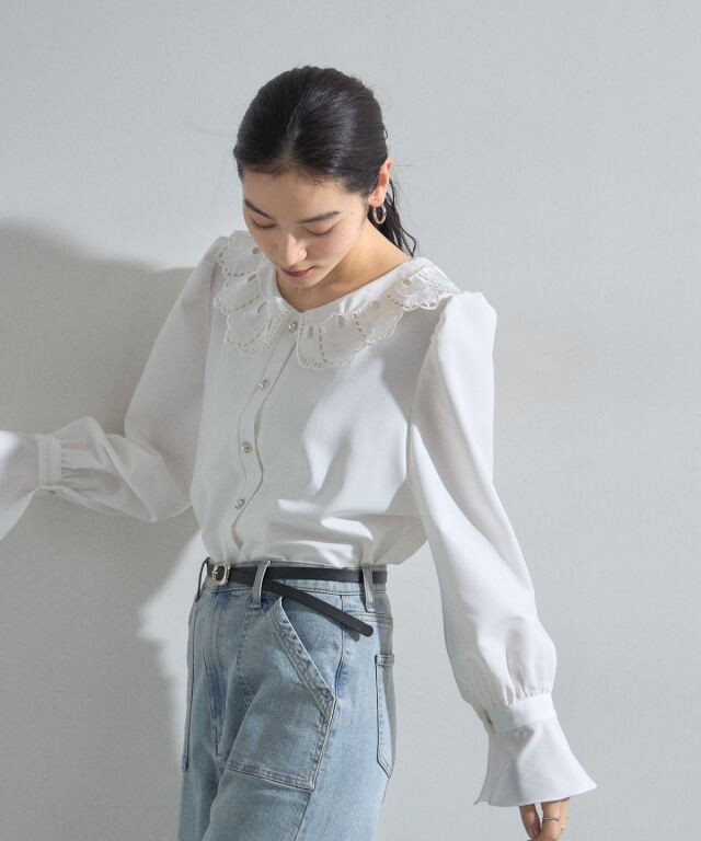 | 商品説明 | : | 贅沢なカットワーク刺繍襟で顔周りを華やかに。クラシカルな気品漂う主役級ブラウス。 繊細なカットワーク刺繍を施した大きめの襟が、女性らしくクラシカルな印象を与えるブラウスです。 程よいボリュームのパフスリーブと長めのカフスデザインが、 手元まで美しく見せ、洗練されたシルエットを描きます。 フロントには艶やかなパール調ボタンをあしらい、ディテールまで上品に仕上げました。 デニムでカジュアルダウンしたミックススタイルはもちろん、 スカートを合わせたオケージョンシーンにも最適。 一枚で着映えする、ワードローブに加えておきたい優秀アイテムです。 |
