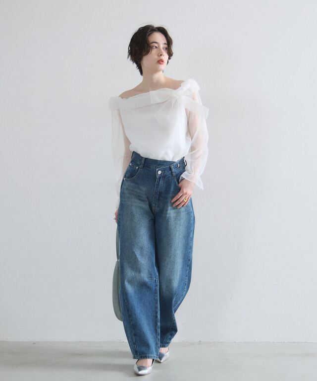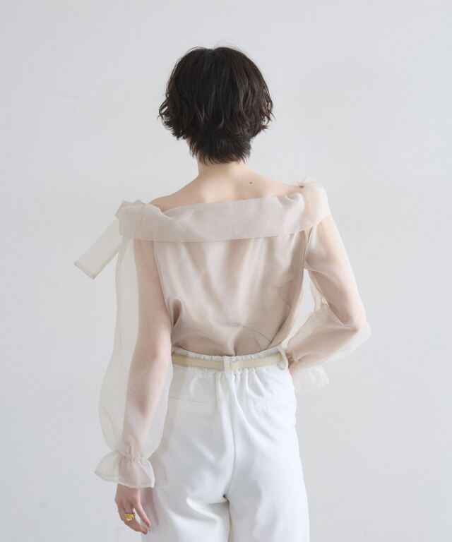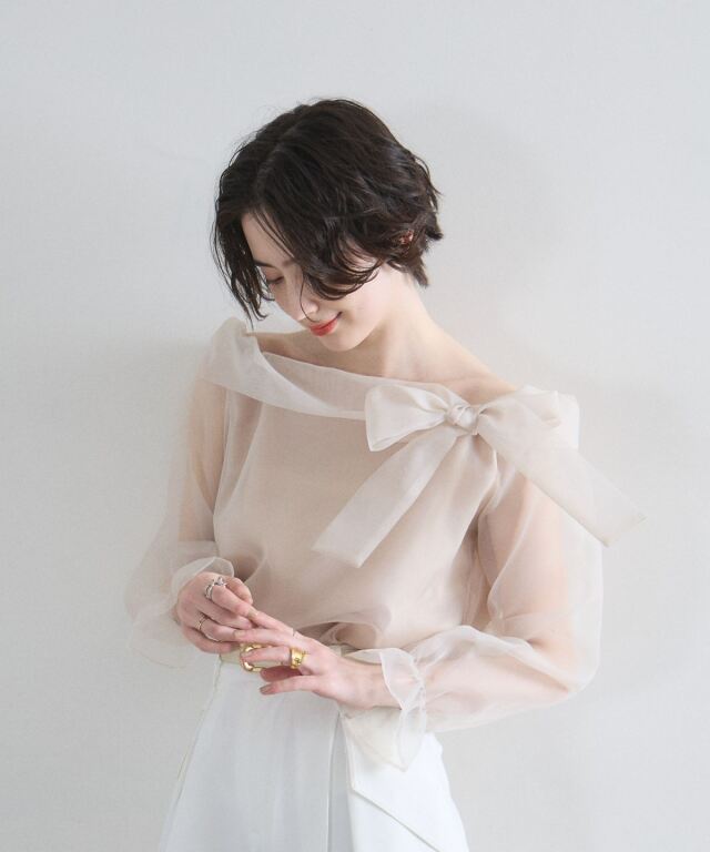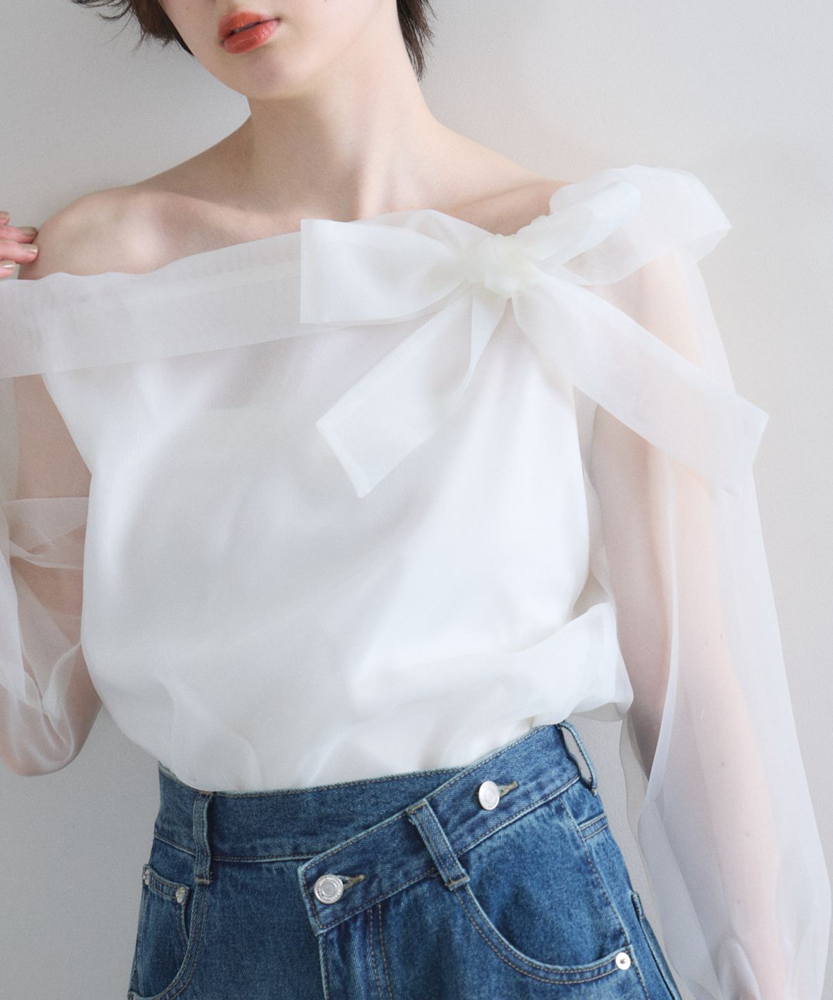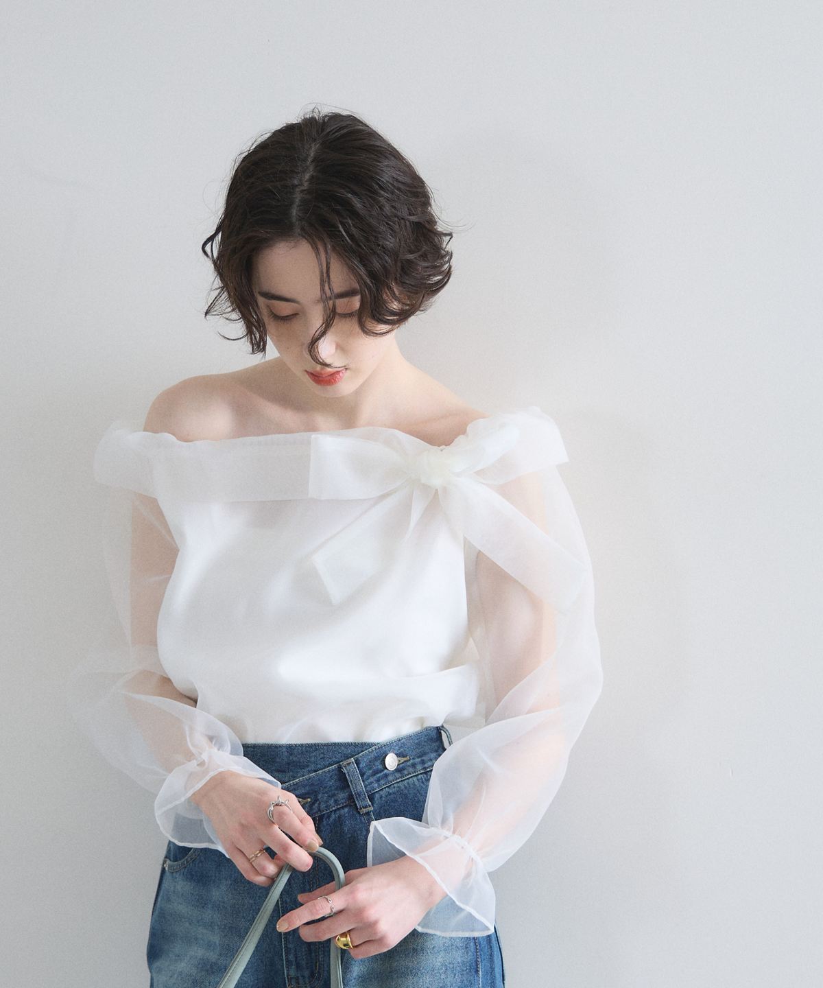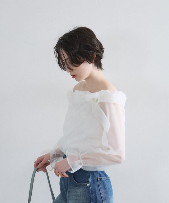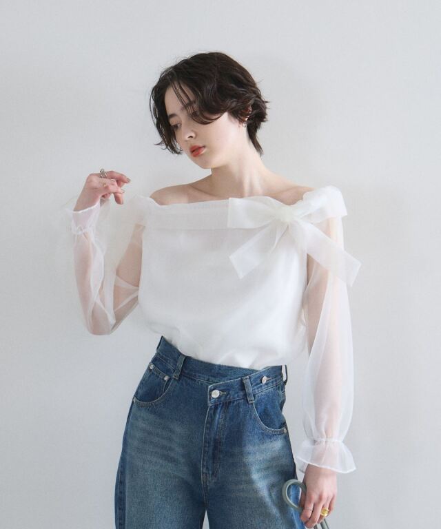 | 商品説明 | : | 大きなリボンが肩先を飾るシフォンオフショルブラウス 柔らかなシアー素材が、動くたびに儚げで美しいニュアンスを放つ一枚。 デコルテを綺麗に見せるオフショルダーのラインと、 肩にあしらわれた大胆なオーガンジーリボンが、特別な日の装いをドラマチックに演出します。 袖口のフリルが手元にまで甘さを添えつつ、デニムと合わせればヘルシーな大人カジュアルに。 軽やかな抜け感と圧倒的な主役級の存在感を兼ね備えた、今季一押しのフェミニンアイテムです。 |