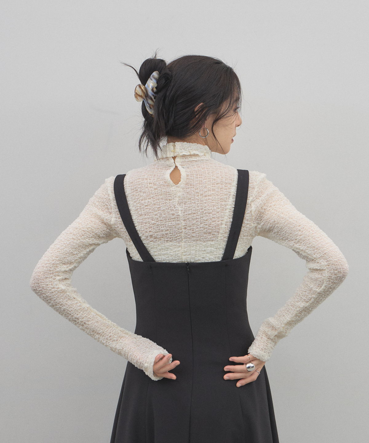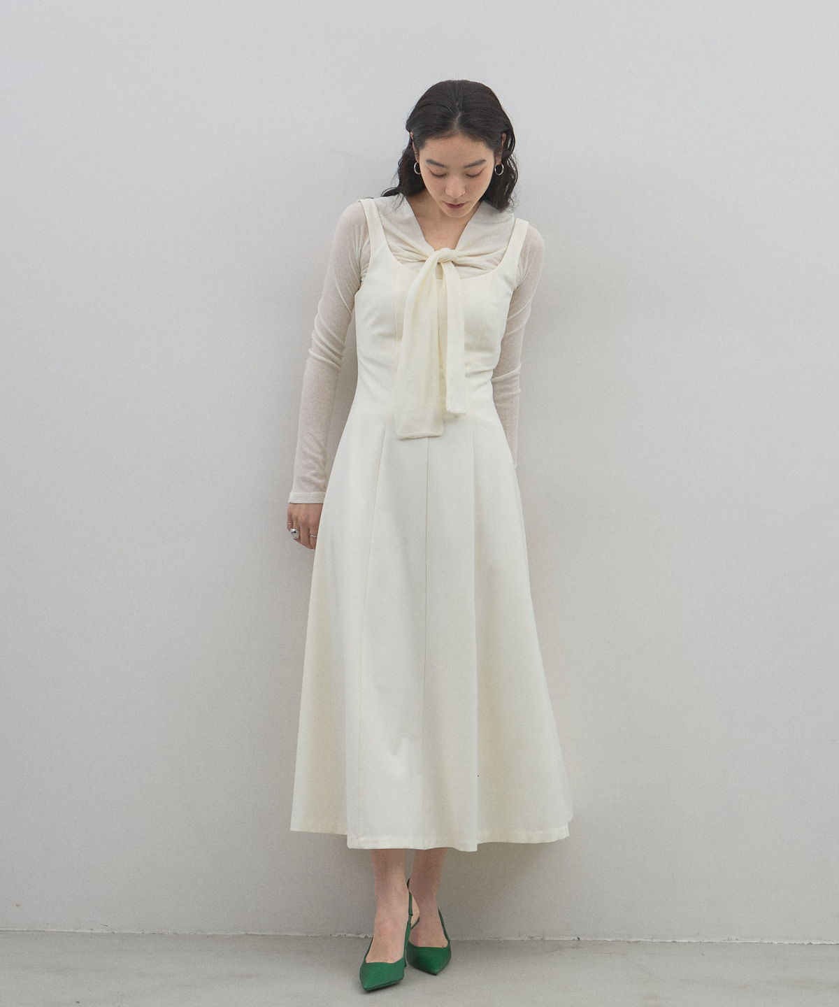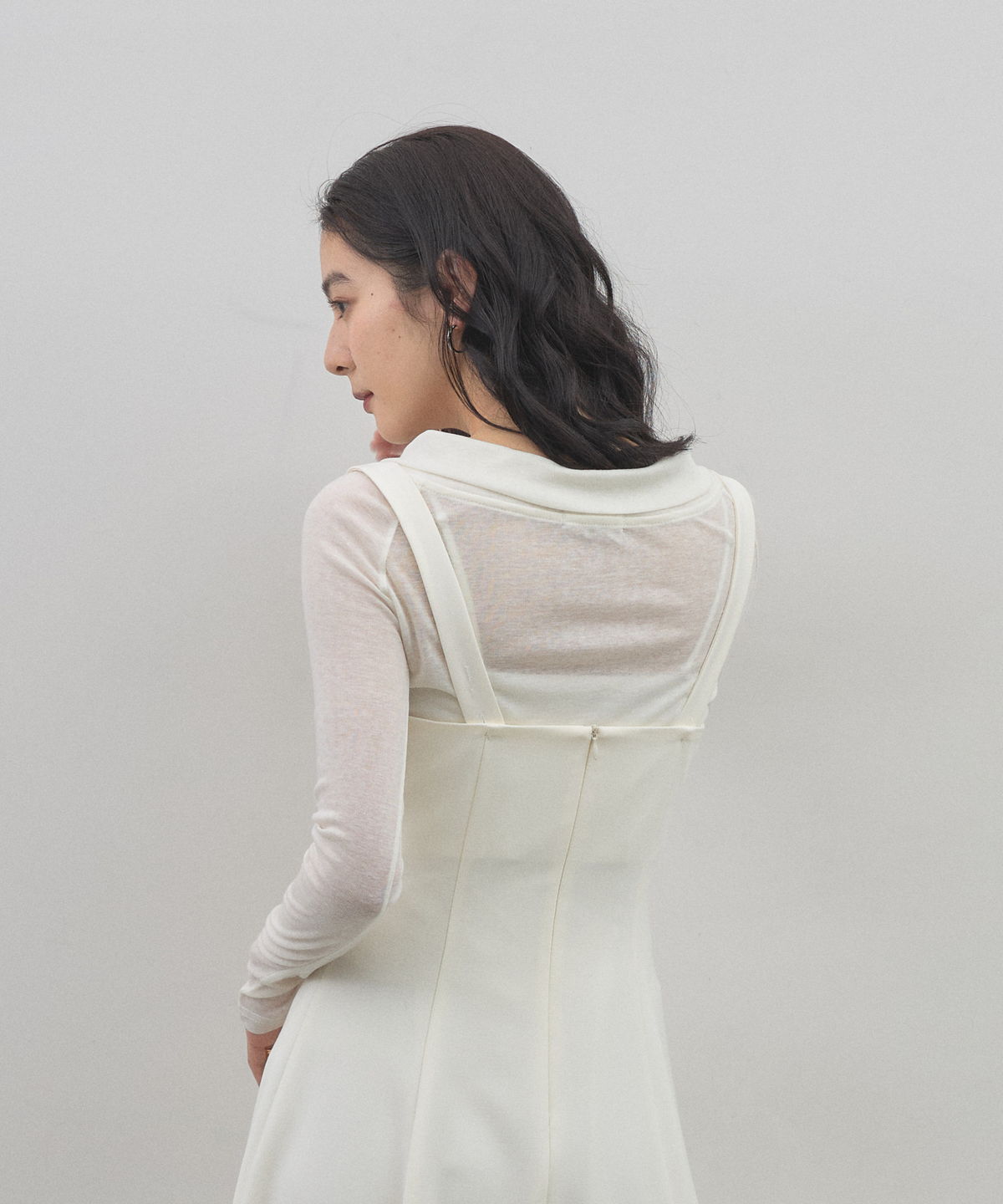 | 商品説明 | : | 曲線美が、都会的なエレガンスをクラスアップさせる。 深めのスクエアネックとウエストから広がる立体的なフレアラインが、 女性らしくも芯のあるシルエットを描き出します。 シアーなハイネックと重ねれば、素材のコントラストが際立つ旬な着こなしに。 オケージョンから日常の特別なシーンまで、纏うだけで自信をくれる主役級の一着です。 |