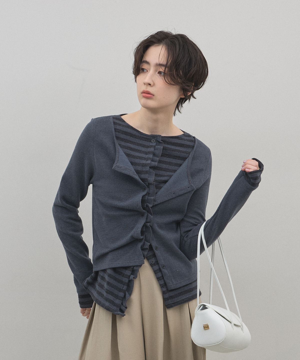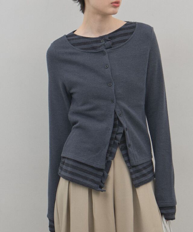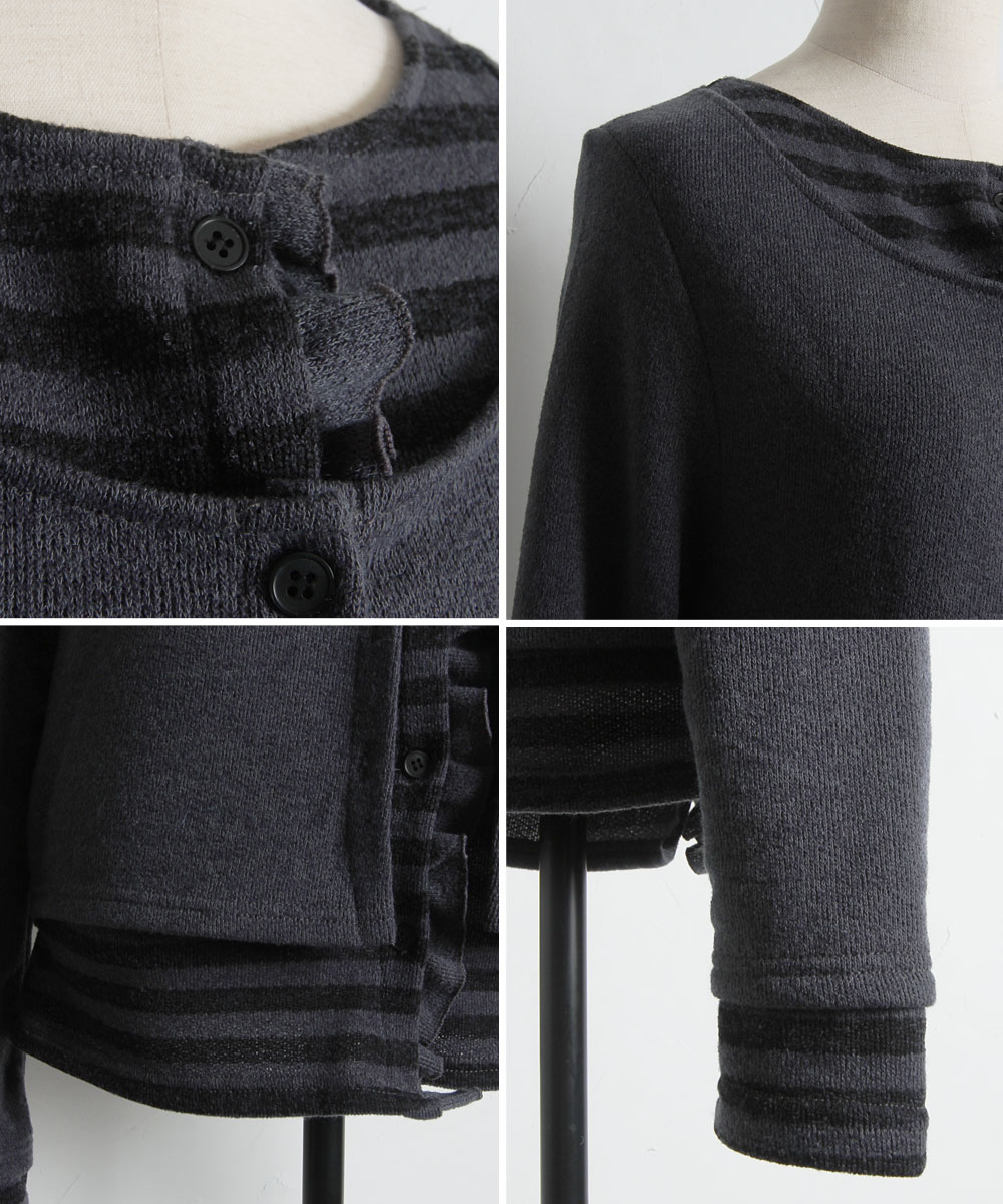 | 商品説明 | : | 1枚で完成する洗練レイヤード。遊び心と上品さを纏う、技ありアンサンブル風ニット。 カーディガンとボーダー柄のインナーを重ねたような、こなれ感たっぷりのフェイクレイヤードニット。 計算された裾のフリルや袖口の覗き方が、単調になりがちなデイリーコーデにリズムと奥行きを与えます。 落ち着いたトーンの配色で甘くなりすぎず、大人の女性にふさわしい「程よい遊び心」を演出。 肌触りの良い柔らかな素材感で、コンパクトなシルエットはフレアスカートやワイドパンツとも相性抜群です。 コーディネートに悩む朝も、これ一着で手抜き感のない、洗練されたスタイルが即座に完成する頼れるアイテムです。 |