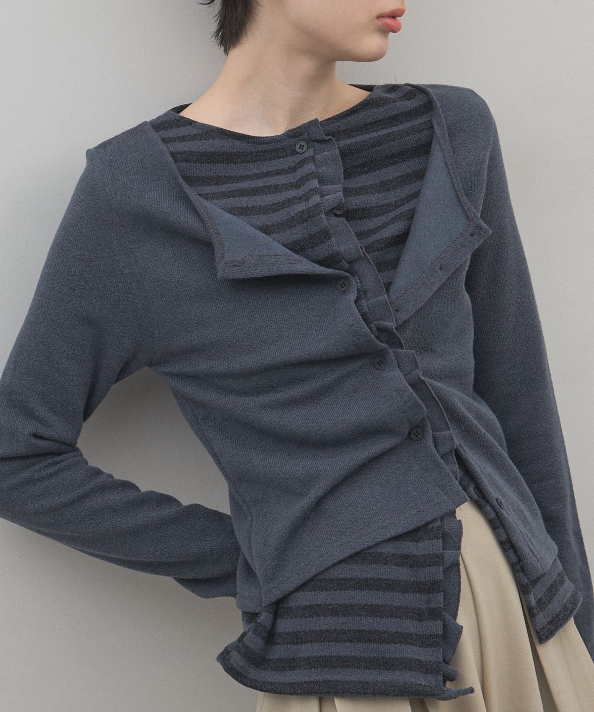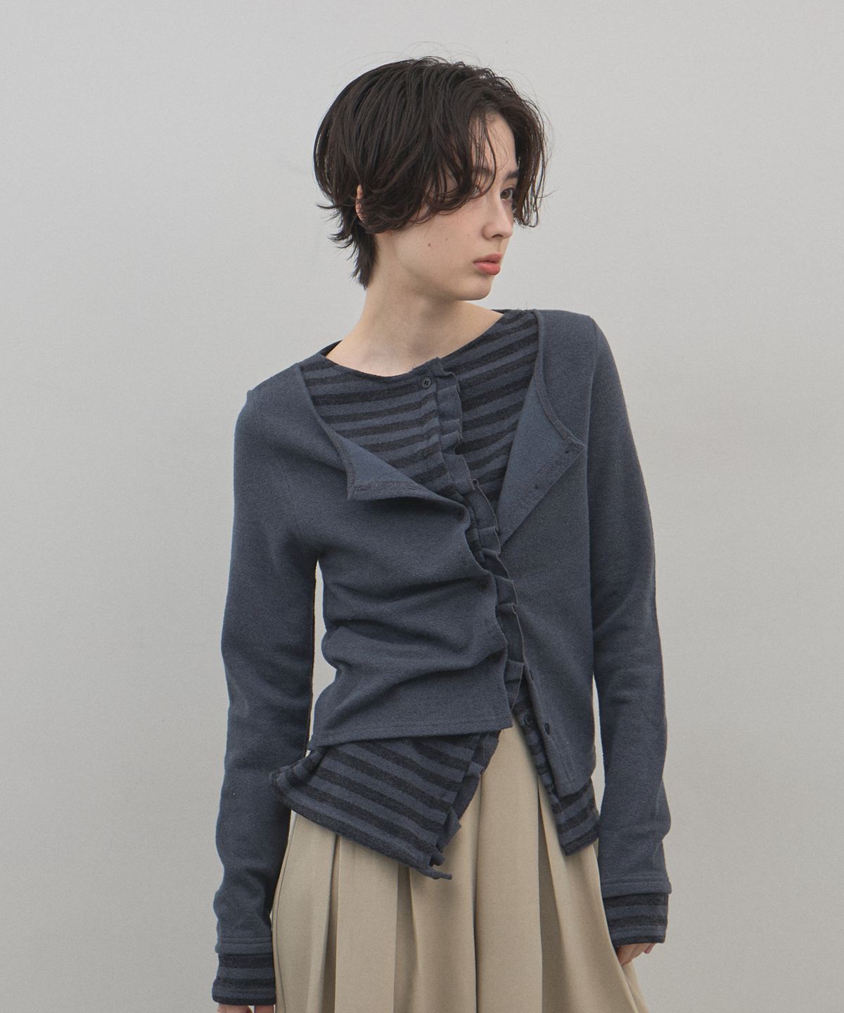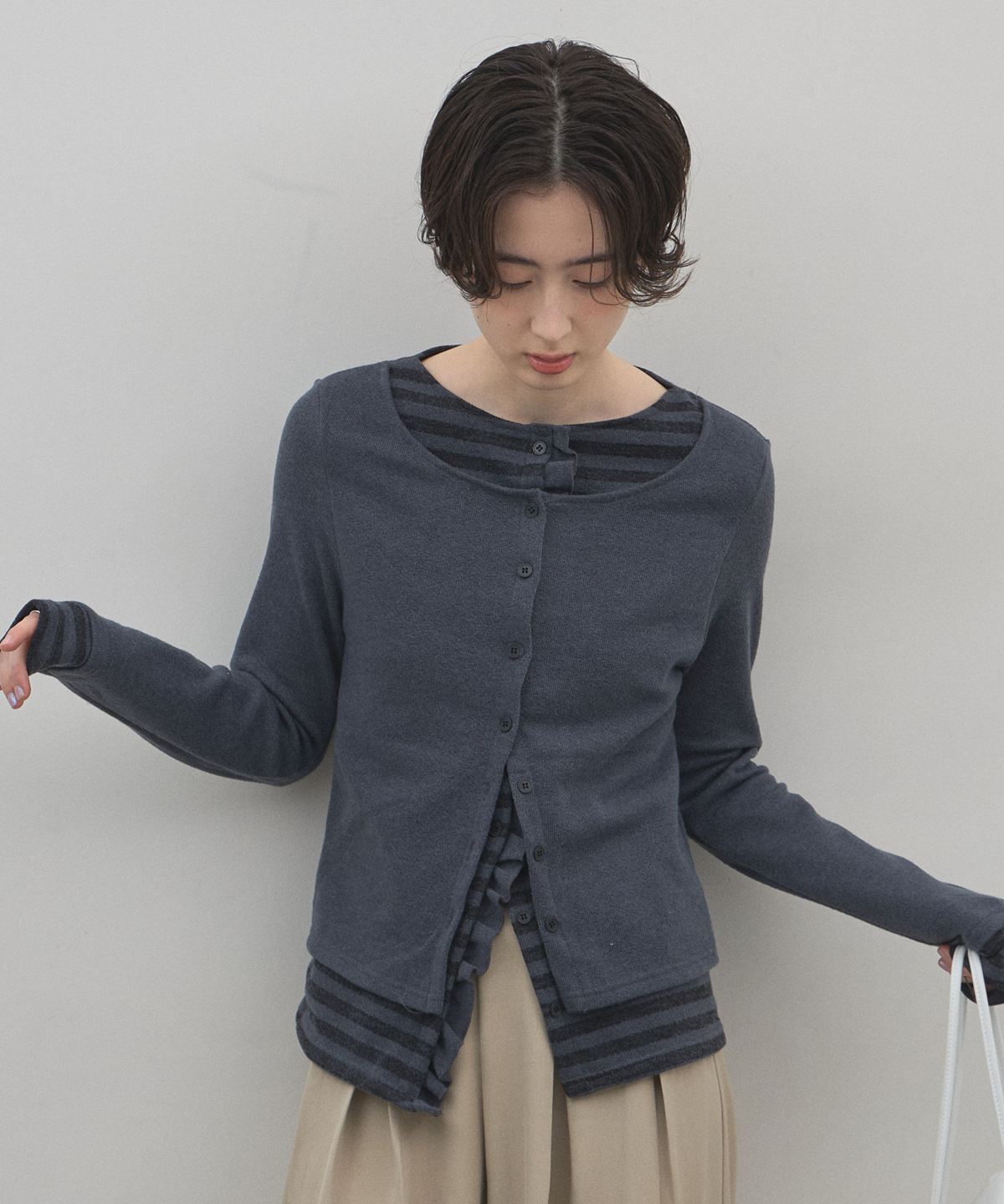 | 商品説明 | : | 1枚で完成する洗練レイヤード。遊び心と上品さを纏う、技ありアンサンブル風ニット。 カーディガンとボーダー柄のインナーを重ねたような、こなれ感たっぷりのフェイクレイヤードニット。 計算された裾のフリルや袖口の覗き方が、単調になりがちなデイリーコーデにリズムと奥行きを与えます。 落ち着いたトーンの配色で甘くなりすぎず、大人の女性にふさわしい「程よい遊び心」を演出。 肌触りの良い柔らかな素材感で、コンパクトなシルエットはフレアスカートやワイドパンツとも相性抜群です。 コーディネートに悩む朝も、これ一着で手抜き感のない、洗練されたスタイルが即座に完成する頼れるアイテムです。 |