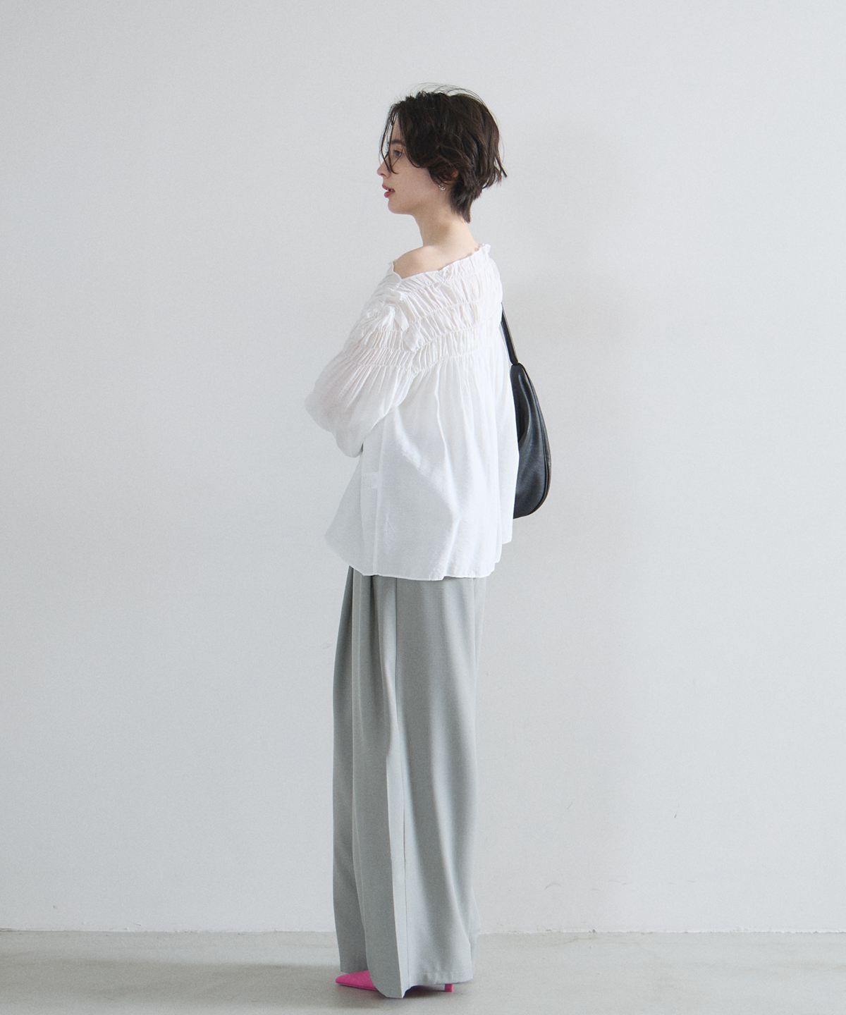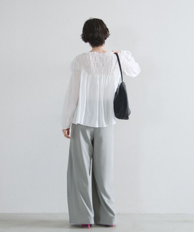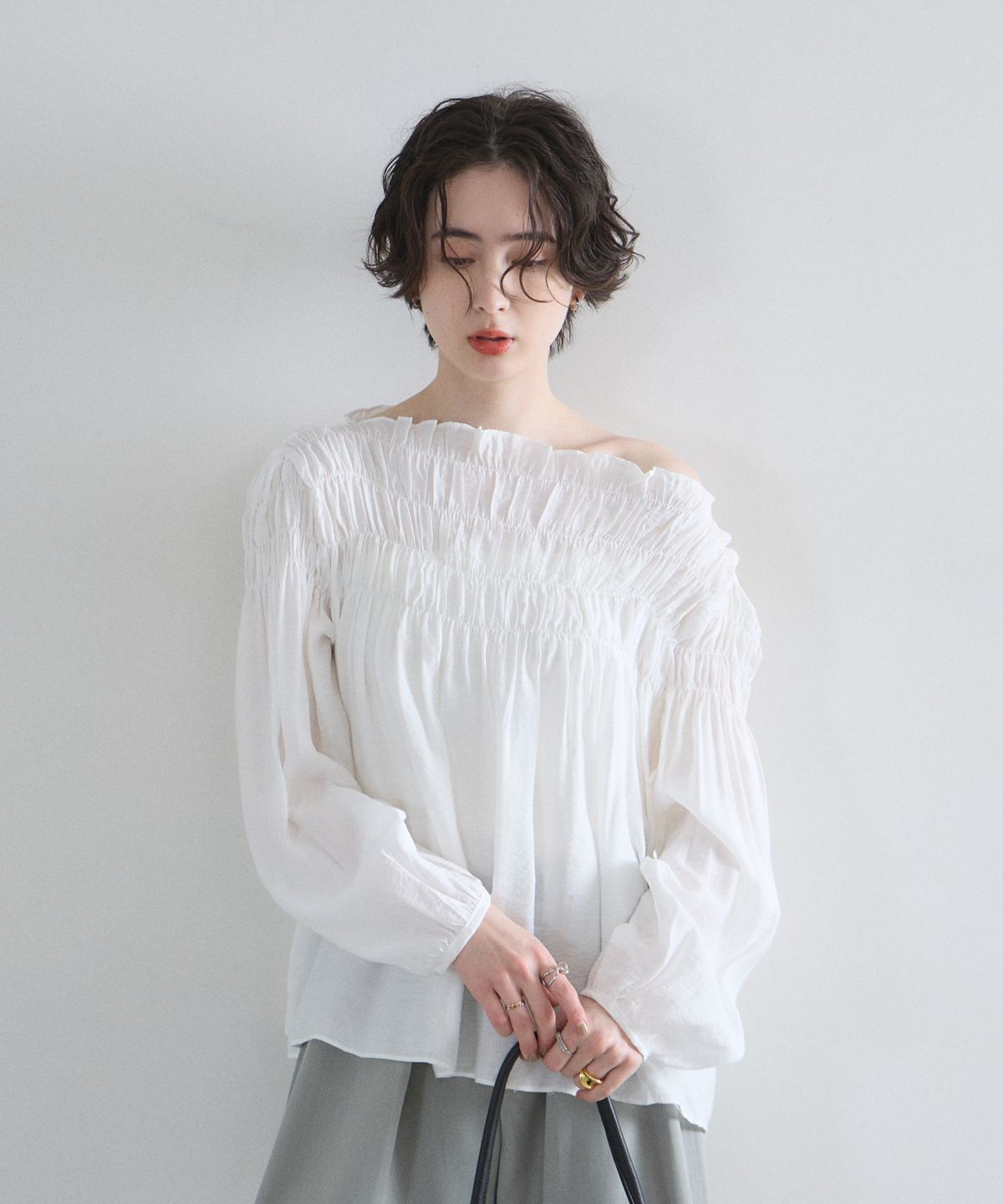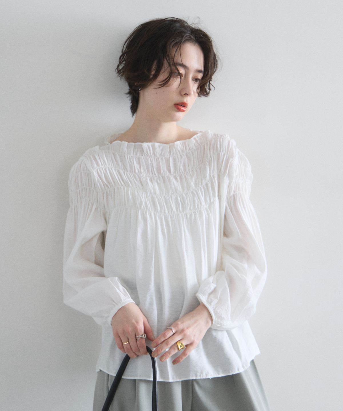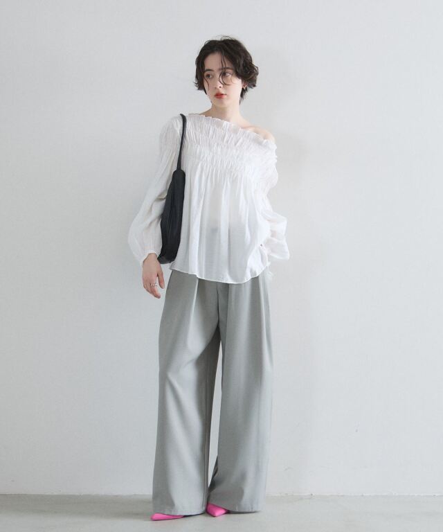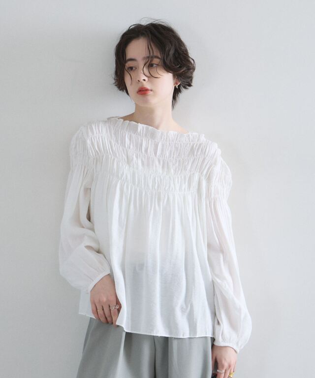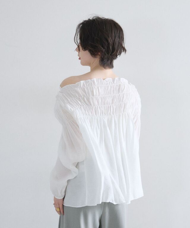 | 商品説明 | : | デコルテを美しく彩る、大人のギャザーブラウス。 繊細なシャーリングが生み出す柔らかなボリューム感が、女性らしさを引き立てる一着。 肩を落としてオフショルダーにすれば、ヘルシーな肌見せスタイルも楽しめます。 軽やかなシアー素材は、ボトムスを選ばず春夏の主役にぴったり。 リラックスした着心地ながら、洗練された都会的なムードを演出します。 |