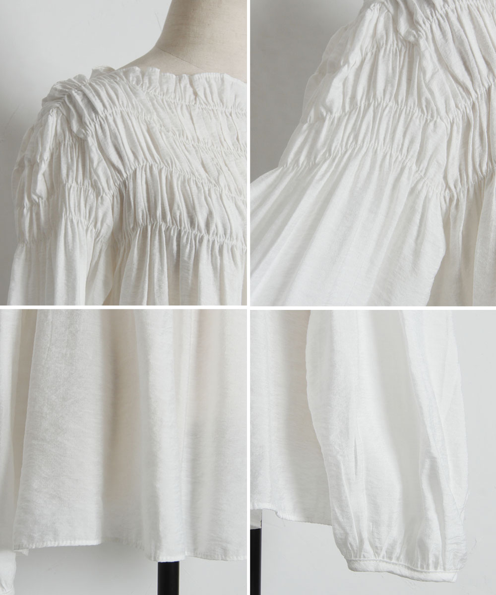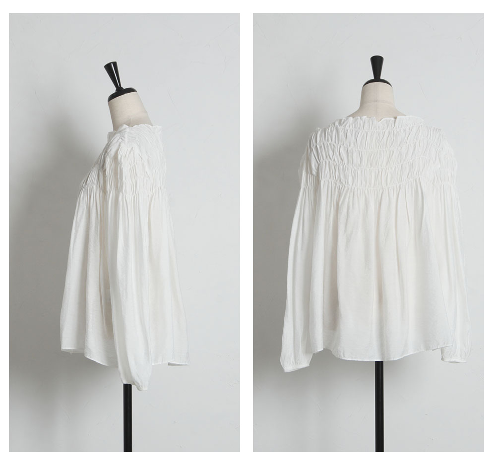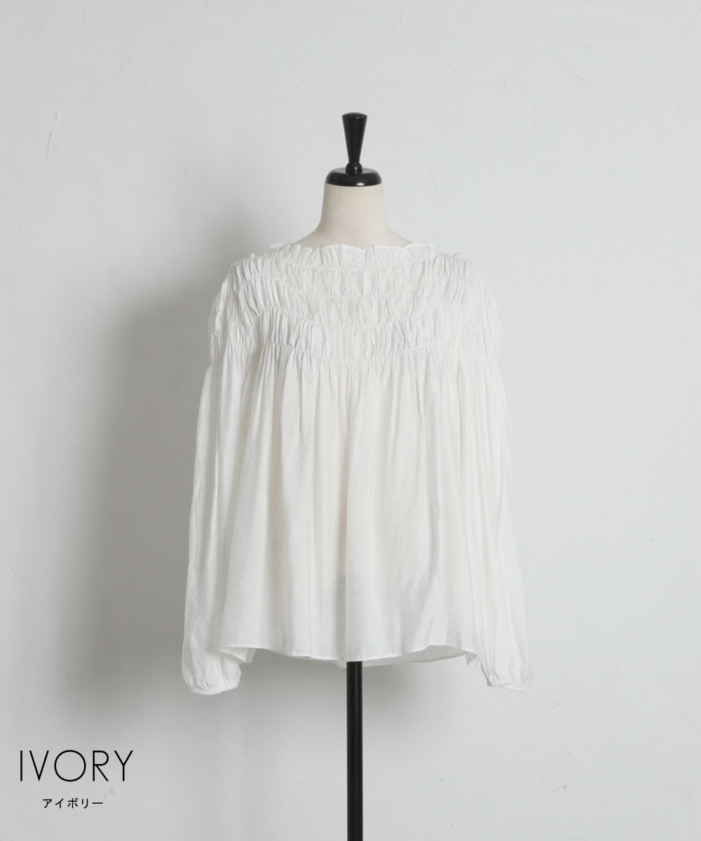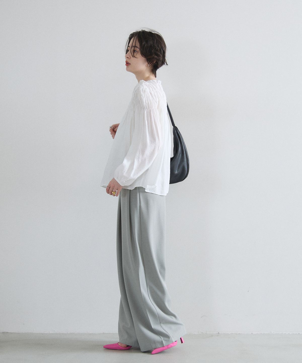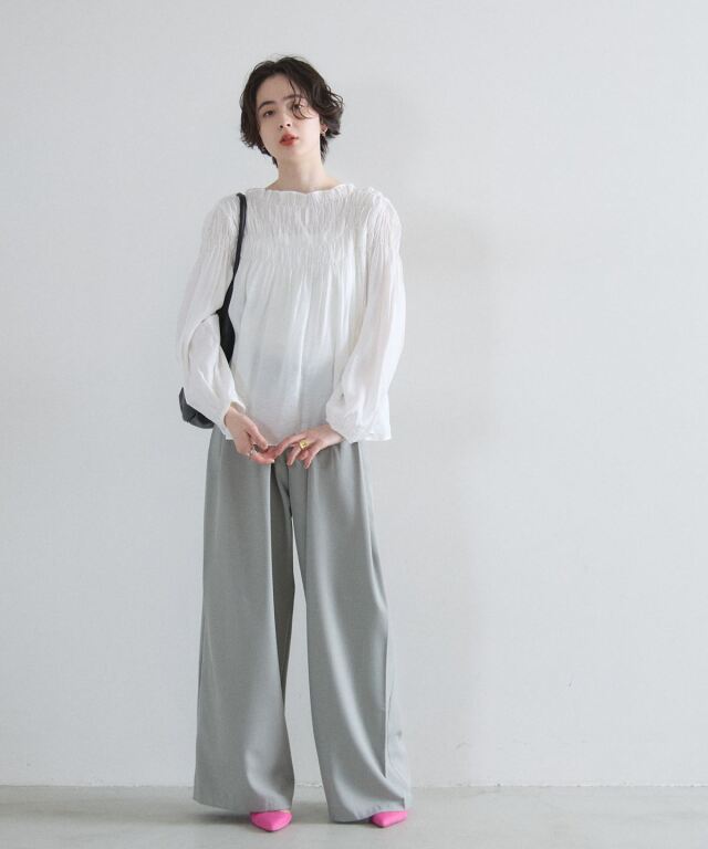 | 商品説明 | : | デコルテを美しく彩る、大人のギャザーブラウス。 繊細なシャーリングが生み出す柔らかなボリューム感が、女性らしさを引き立てる一着。 肩を落としてオフショルダーにすれば、ヘルシーな肌見せスタイルも楽しめます。 軽やかなシアー素材は、ボトムスを選ばず春夏の主役にぴったり。 リラックスした着心地ながら、洗練された都会的なムードを演出します。 |