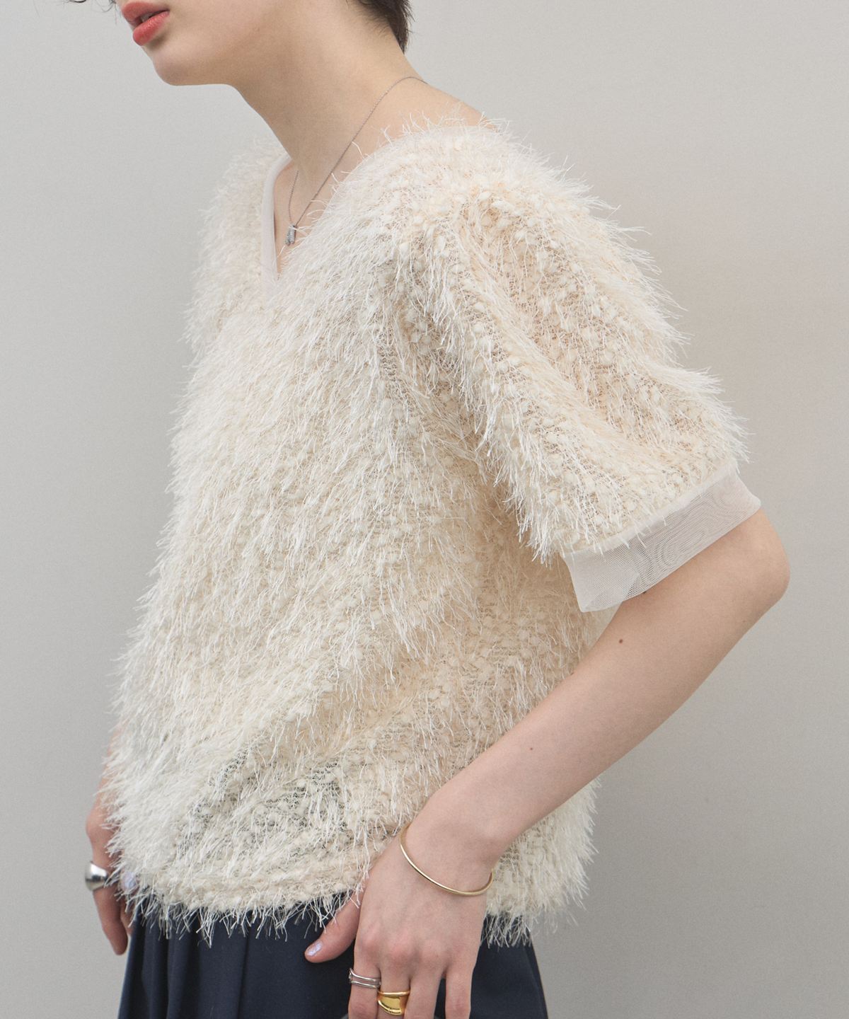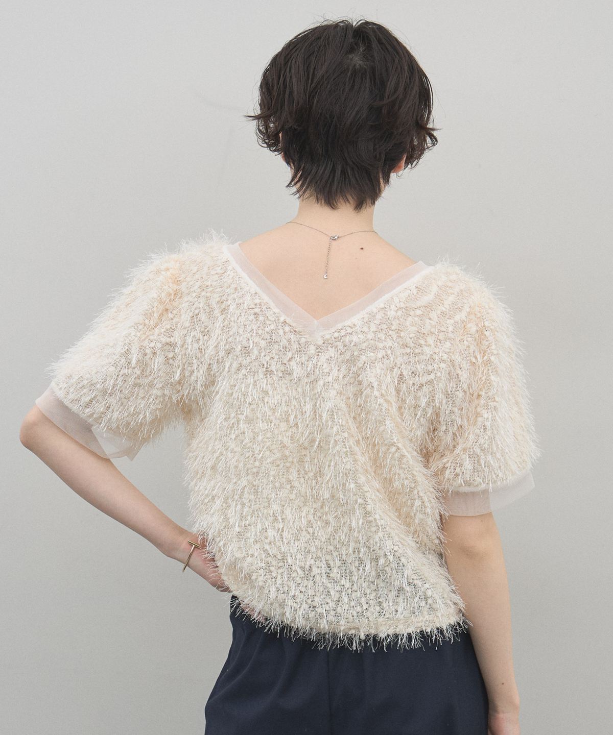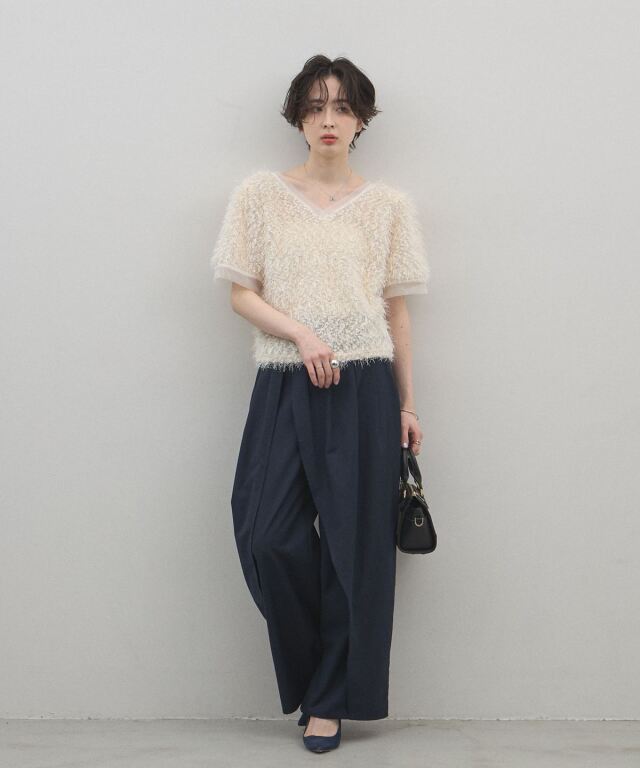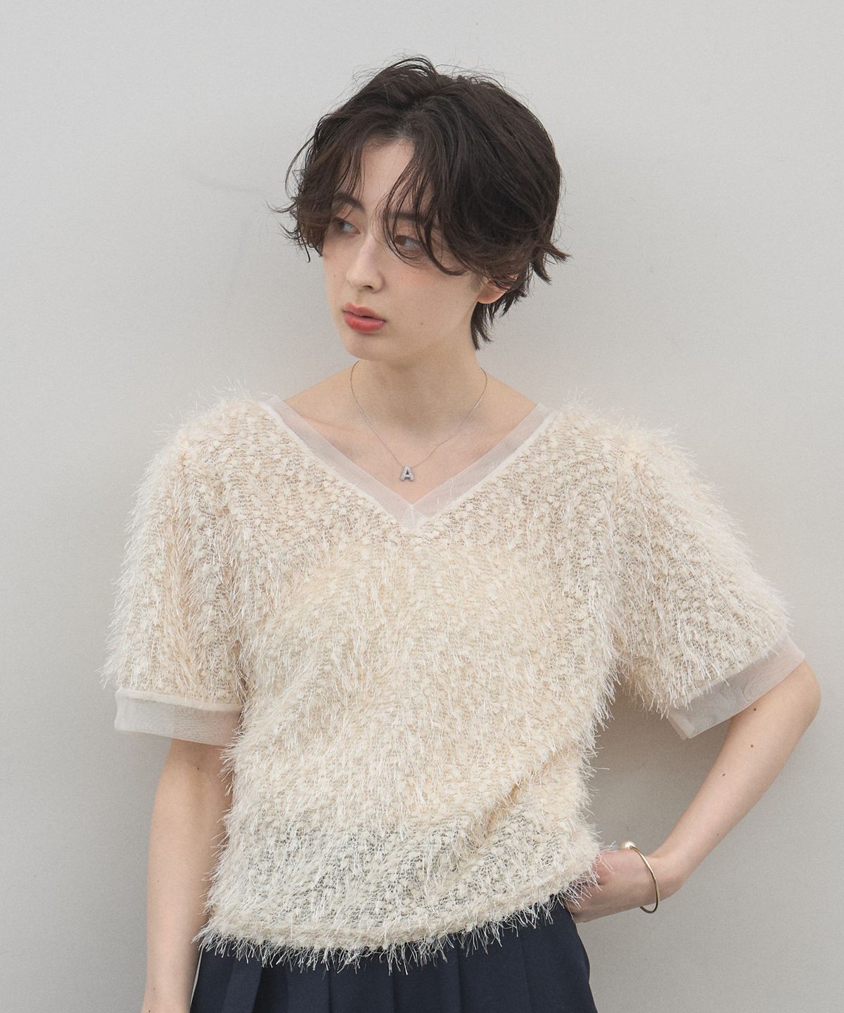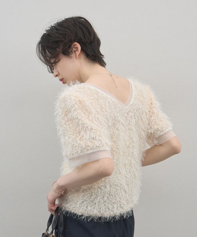 | 商品説明 | : | 光を纏う、繊細なフェザーの煌めき。チュールとニットが織りなす、大人の華やぎトップス。 柔らかなフェザーニットの質感と、襟元のチュール使いが絶妙な抜け感を演出する、フェミニンなVネックトップスです。 光を反射して上品に輝く素材感は、顔周りをパッと明るく見せ、纏うだけでドラマチックな印象に。 広めに開いたVラインがデコルテを美しく引き立て、甘さの中に洗練された大人の色香を漂わせます。 コンパクトな着丈と程よいフィット感で、ボリュームのあるスカートからきれいめなスラックスまで、どんなボトムスとも好相性。 デイリーのデニムスタイルに合わせれば、一気にクラス感のある装いへと格上げしてくれます。 特別な日のディナーやパーティーシーンにも映える、まさに「着るジュエリー」のような贅沢な一着です。 |
