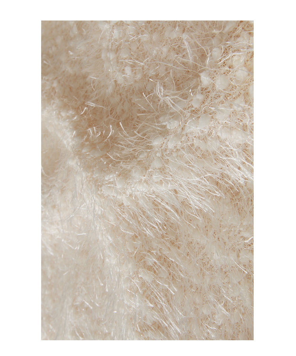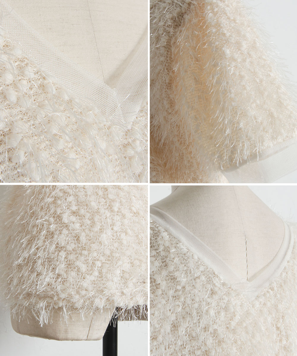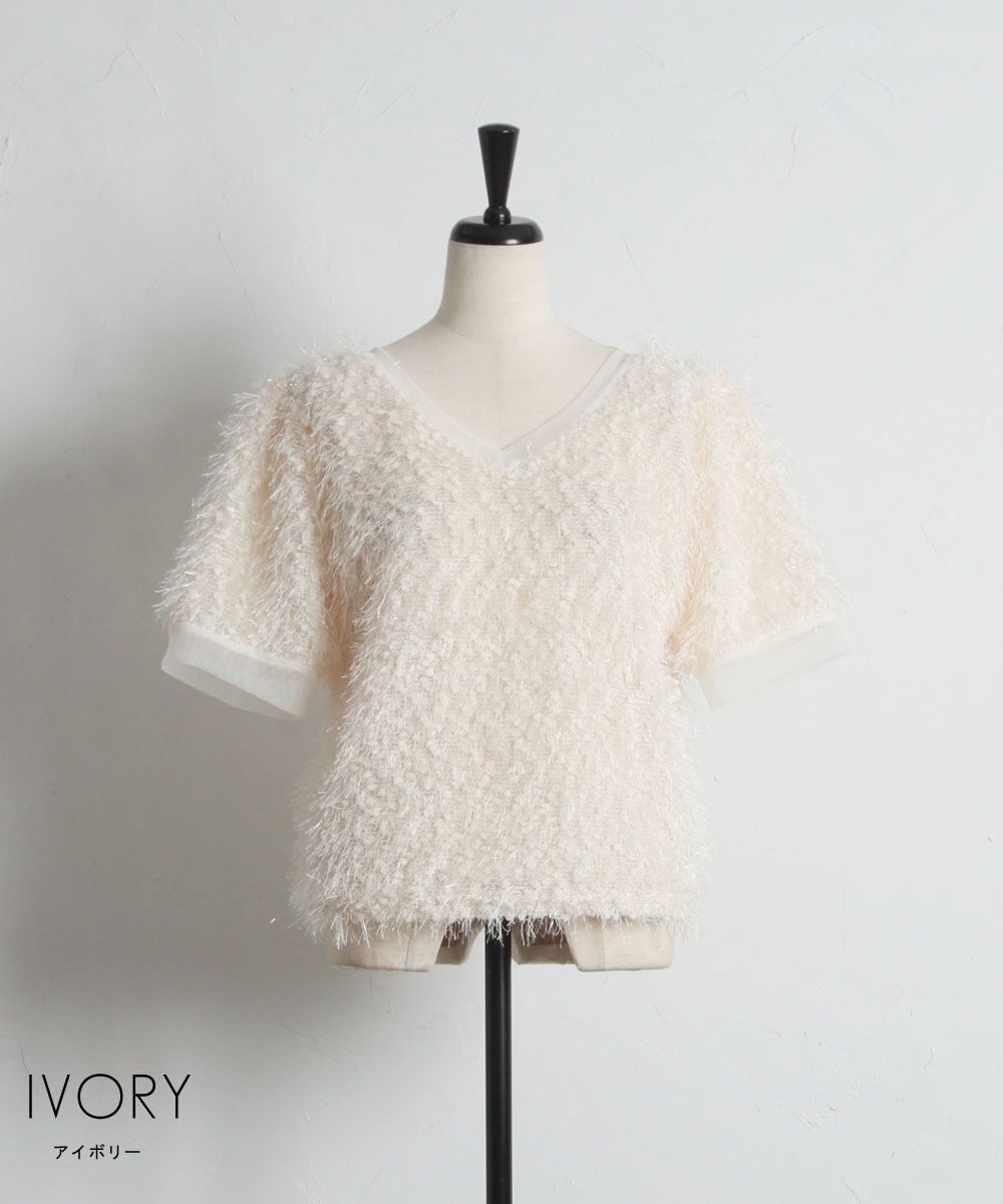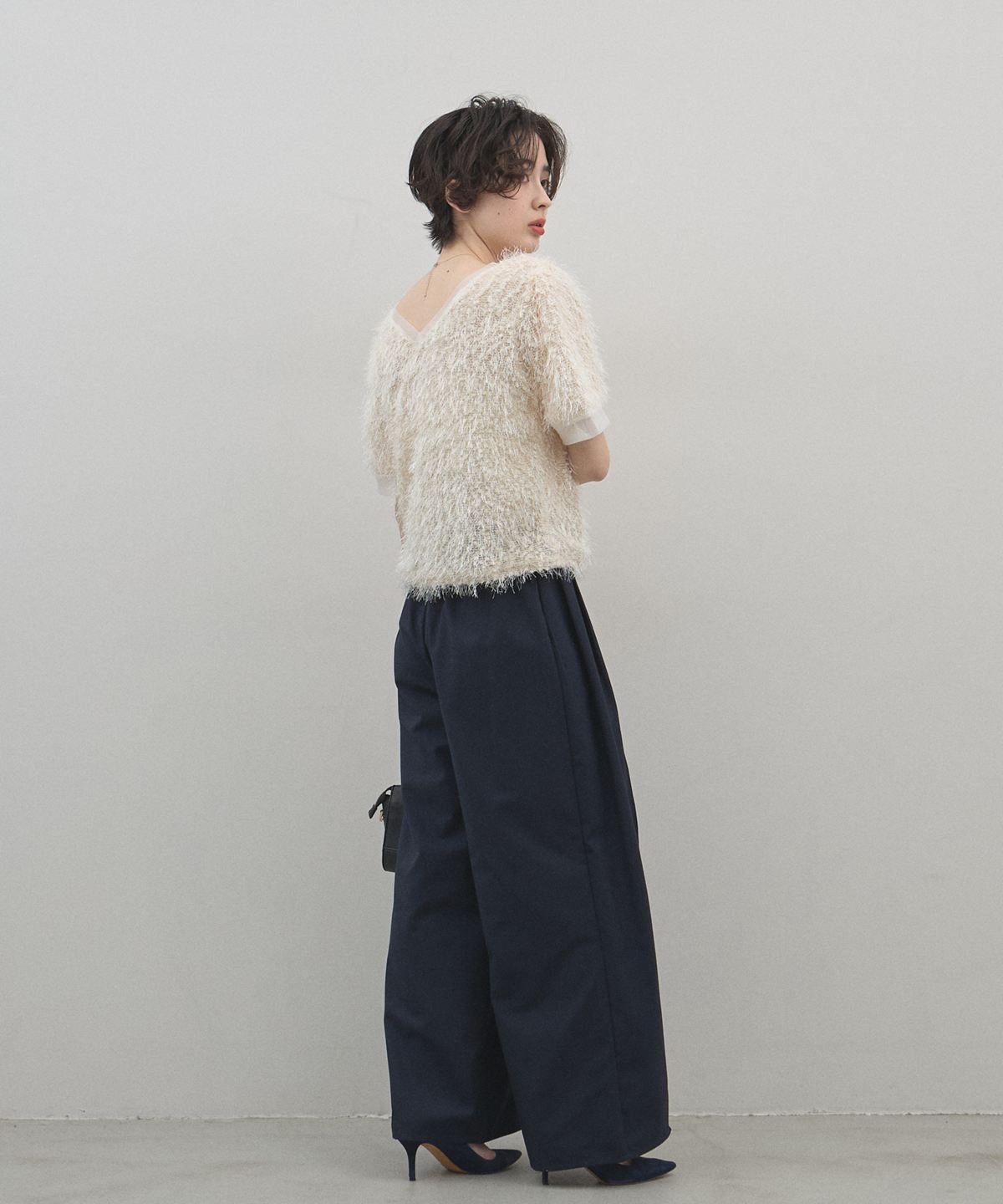 | 商品説明 | : | 光を纏う、繊細なフェザーの煌めき。チュールとニットが織りなす、大人の華やぎトップス。 柔らかなフェザーニットの質感と、襟元のチュール使いが絶妙な抜け感を演出する、フェミニンなVネックトップスです。 光を反射して上品に輝く素材感は、顔周りをパッと明るく見せ、纏うだけでドラマチックな印象に。 広めに開いたVラインがデコルテを美しく引き立て、甘さの中に洗練された大人の色香を漂わせます。 コンパクトな着丈と程よいフィット感で、ボリュームのあるスカートからきれいめなスラックスまで、どんなボトムスとも好相性。 デイリーのデニムスタイルに合わせれば、一気にクラス感のある装いへと格上げしてくれます。 特別な日のディナーやパーティーシーンにも映える、まさに「着るジュエリー」のような贅沢な一着です。 |