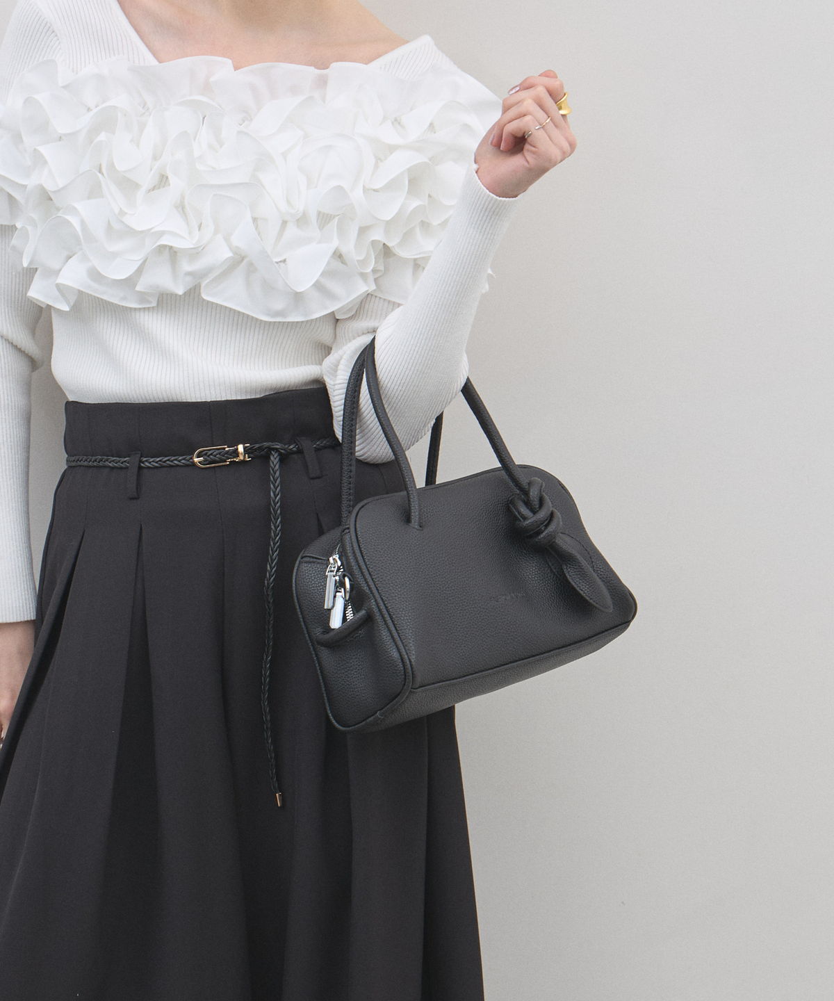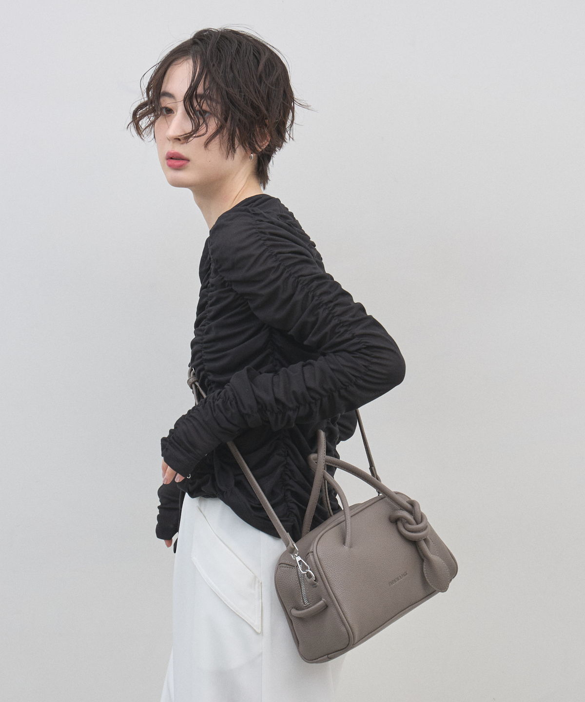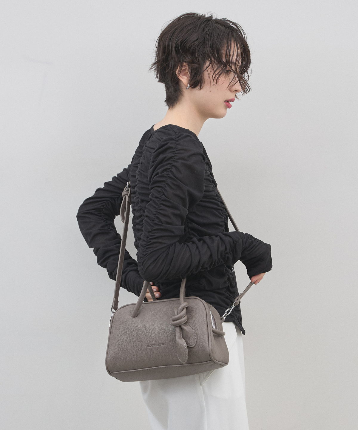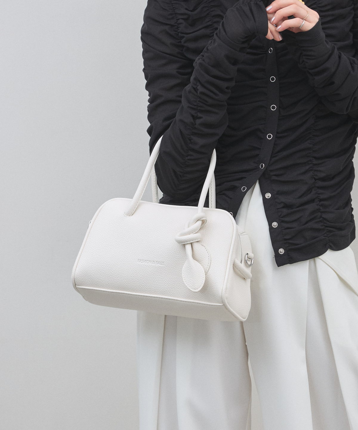 | 商品説明 | : | ミニマルな形に、遊び心を結んで。 装いをクラスアップする、大人のミニボストン。 柔らかなシボ感のある素材と、端正なボストンシルエットが調和した、洗練のミニバッグ。 持ち手部分にあしらわれた大胆なノット(結び目)デザインが、 シンプルなルックスに現代的なエッセンスと程よい抜け感をプラスします。 コンパクトなサイズ感ながら、広めのマチで見た目以上の収納力を備えており、 デイリーからお出かけまで幅広く活躍します。モードなトップスと合わせれば、 パッと目を惹くトレンド感が生まれ、洗練された大人のスタイルが完成します。 |