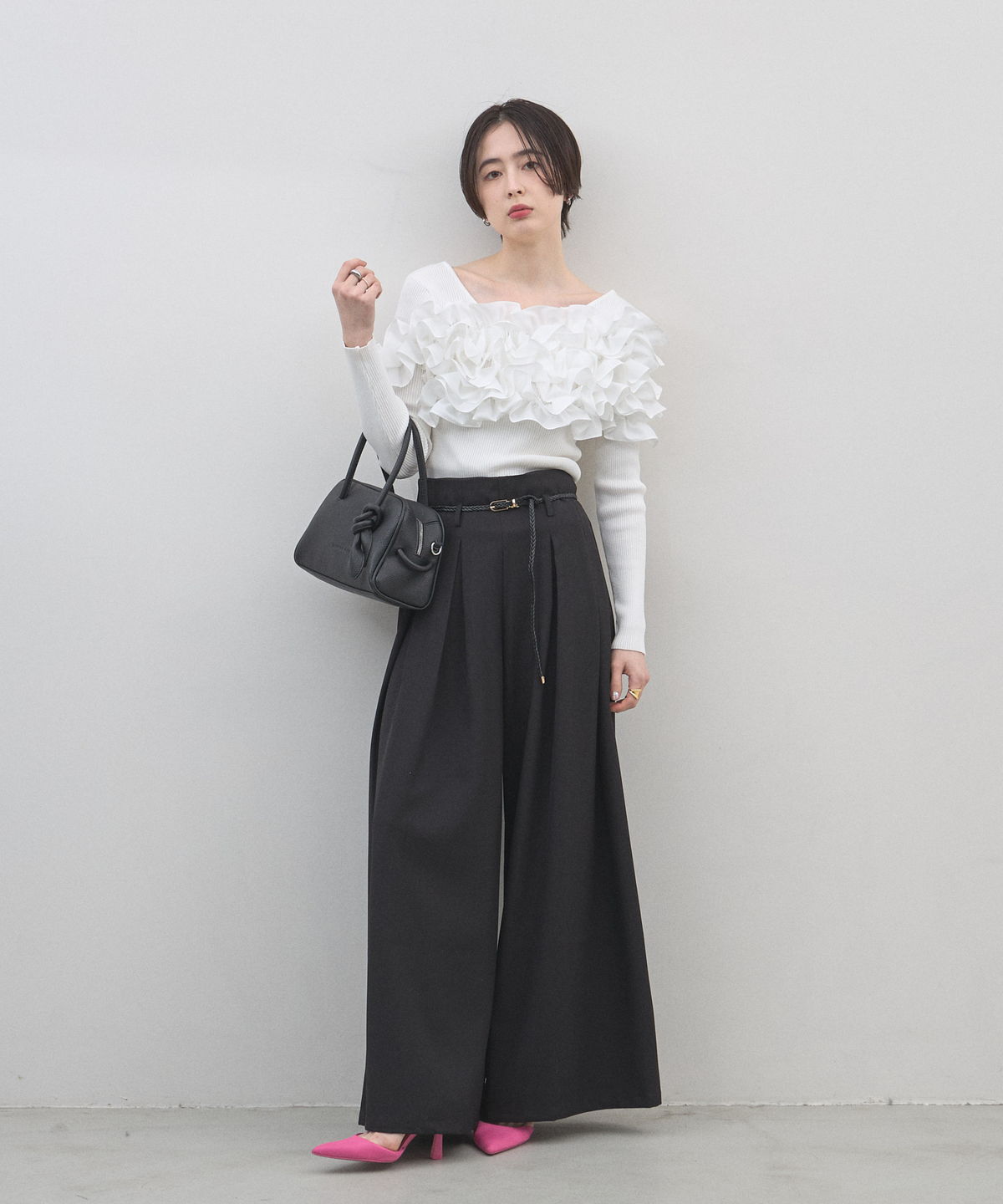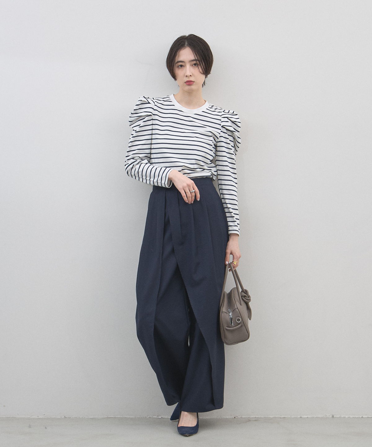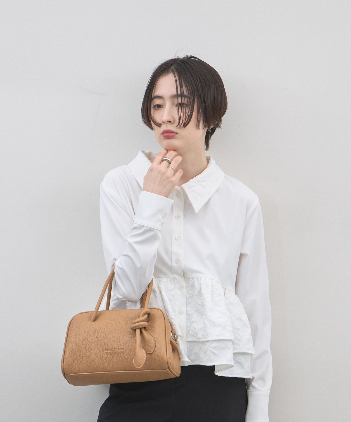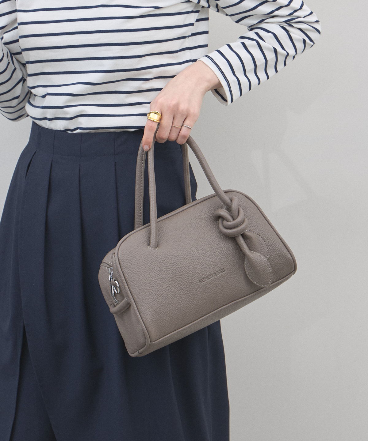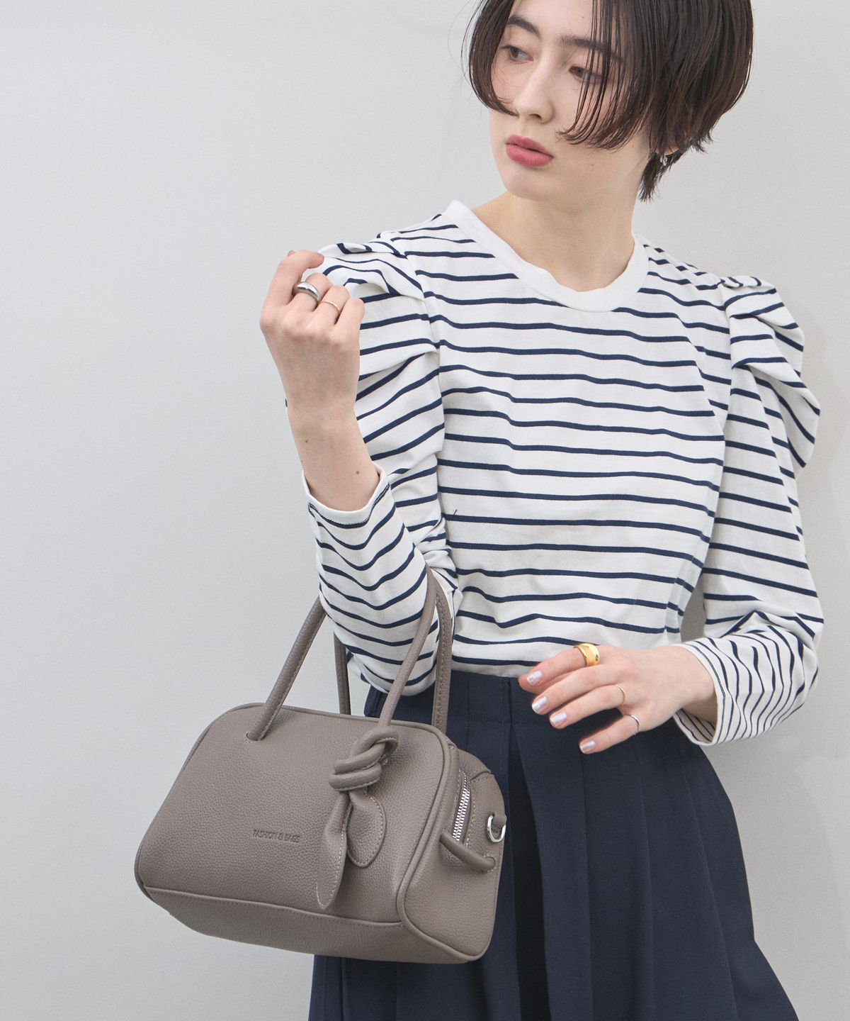 | 商品説明 | : | ミニマルな形に、遊び心を結んで。 装いをクラスアップする、大人のミニボストン。 柔らかなシボ感のある素材と、端正なボストンシルエットが調和した、洗練のミニバッグ。 持ち手部分にあしらわれた大胆なノット(結び目)デザインが、 シンプルなルックスに現代的なエッセンスと程よい抜け感をプラスします。 コンパクトなサイズ感ながら、広めのマチで見た目以上の収納力を備えており、 デイリーからお出かけまで幅広く活躍します。モードなトップスと合わせれば、 パッと目を惹くトレンド感が生まれ、洗練された大人のスタイルが完成します。 |