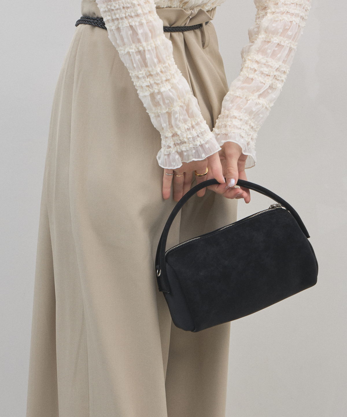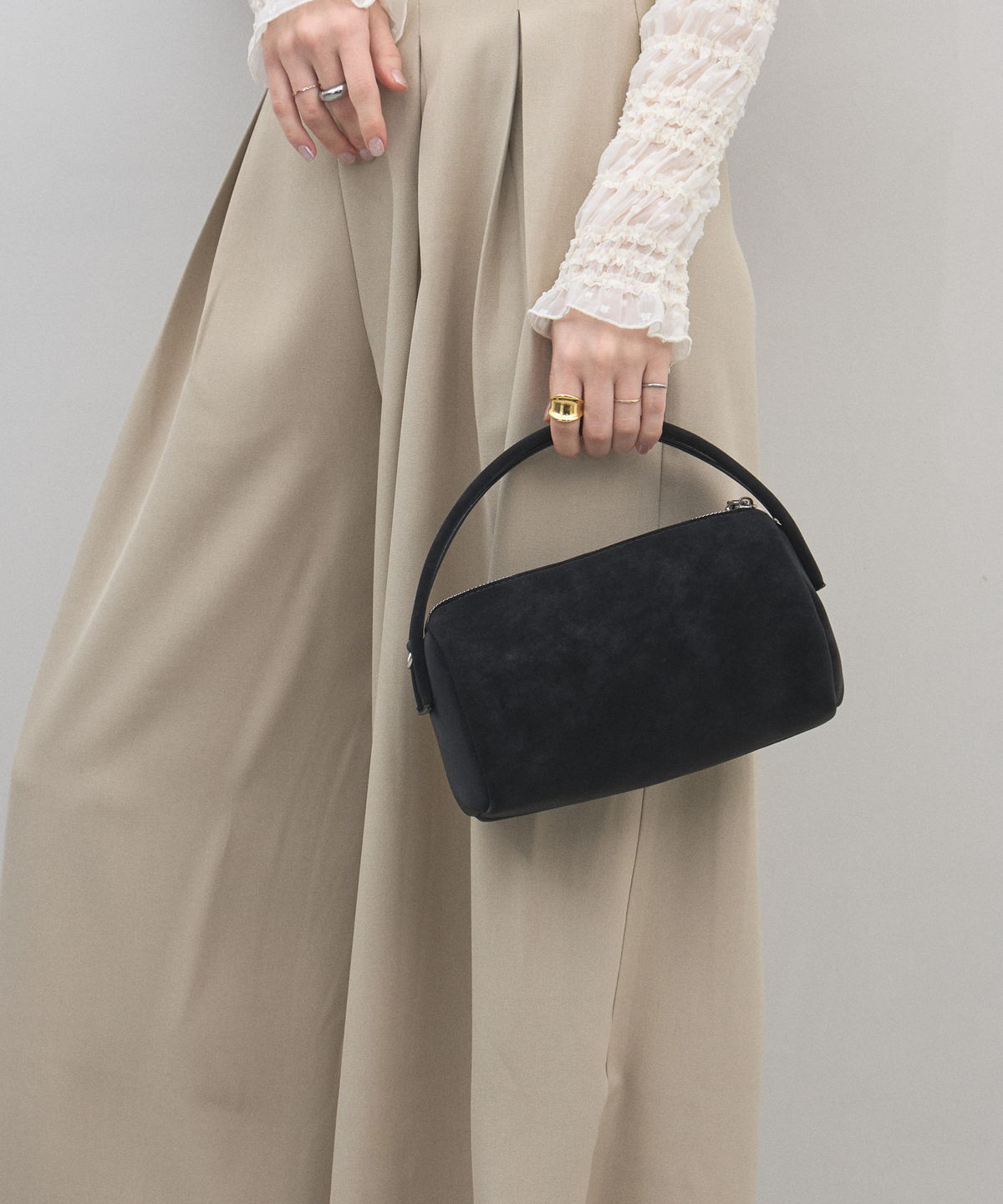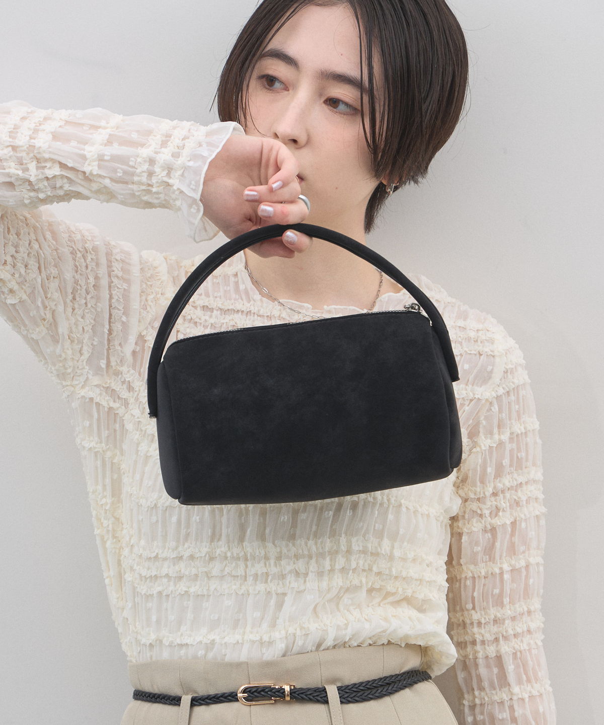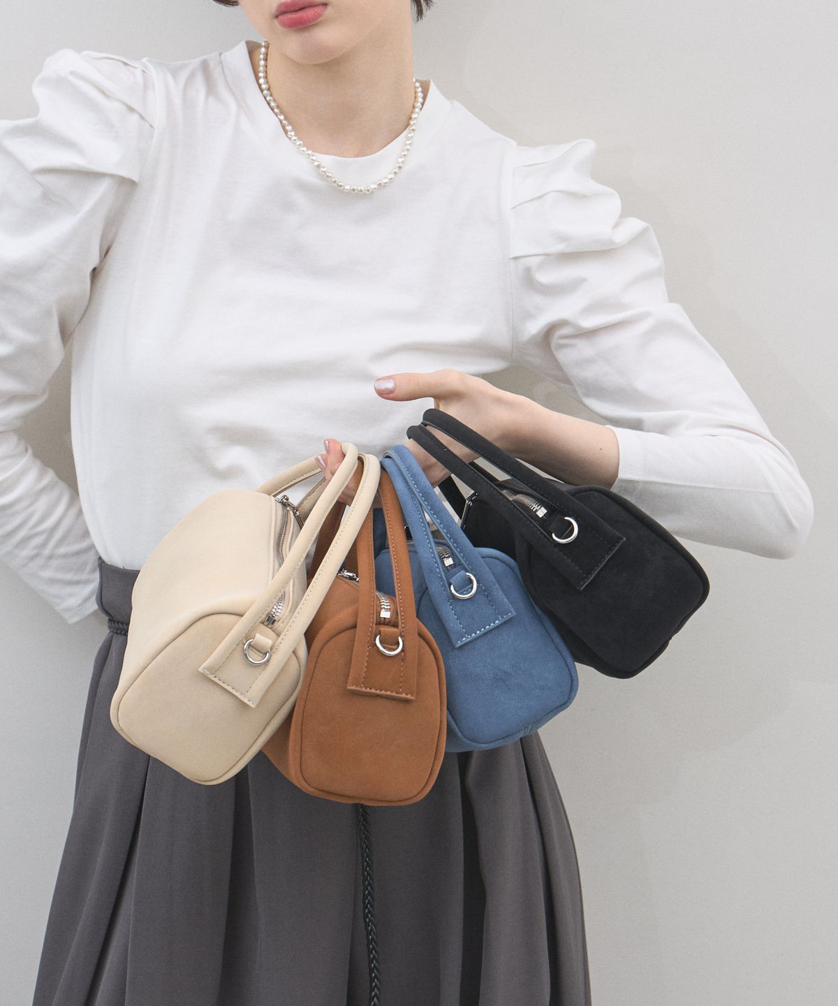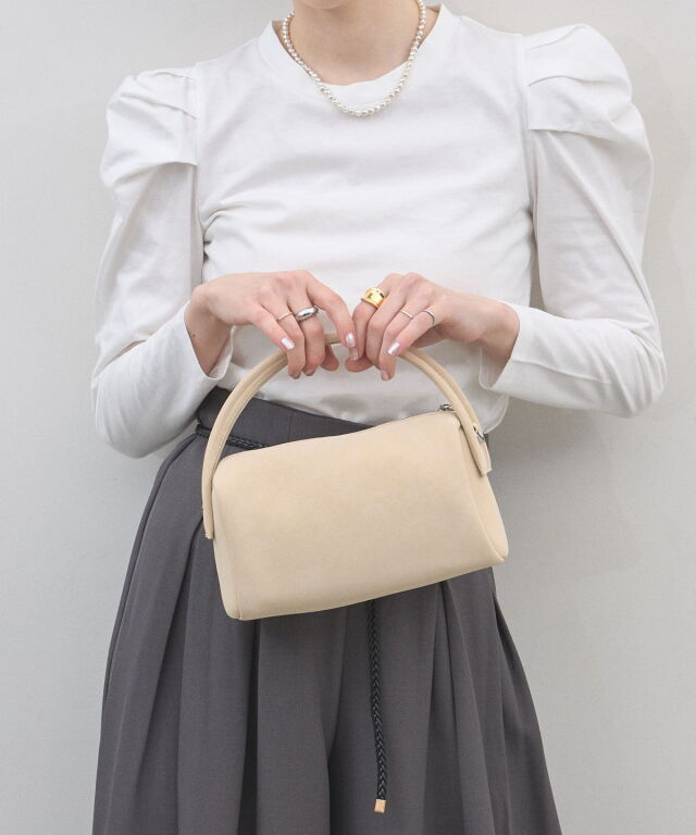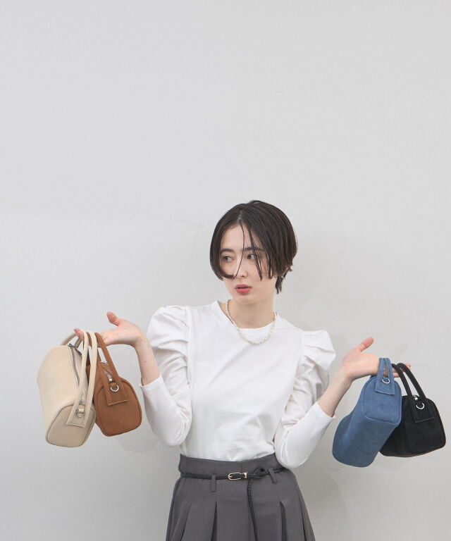 | 商品説明 | : | 季節を愛でる質感を、日常に。優しく手元に馴染む、 スエード調ミニボストンバッグ。 思わず触れたくなるような、きめ細やかで柔らかなスエードタッチの素材を使用したミニバッグ。 端正な長方形のボストン型に、丸みのあるハンドルを組み合わせることで、モードな気品と大人の可愛らしさを両立させました。 落ち着いたトーンのベージュやブルー、シックなブラックなど、 どんなコーディネートにも溶け込みつつ、素材のコントラストで奥行きを与えてくれるカラーバリエーションも魅力。 シンプルなTシャツやスラックスと合わせるだけで、スタイリングに季節感と上質なニュアンスをプラスしてくれます。 コンパクトな見た目ながら、しっかりとしたマチで必需品をスマートに収納できる、デイリーの頼れるパートナーです。 |