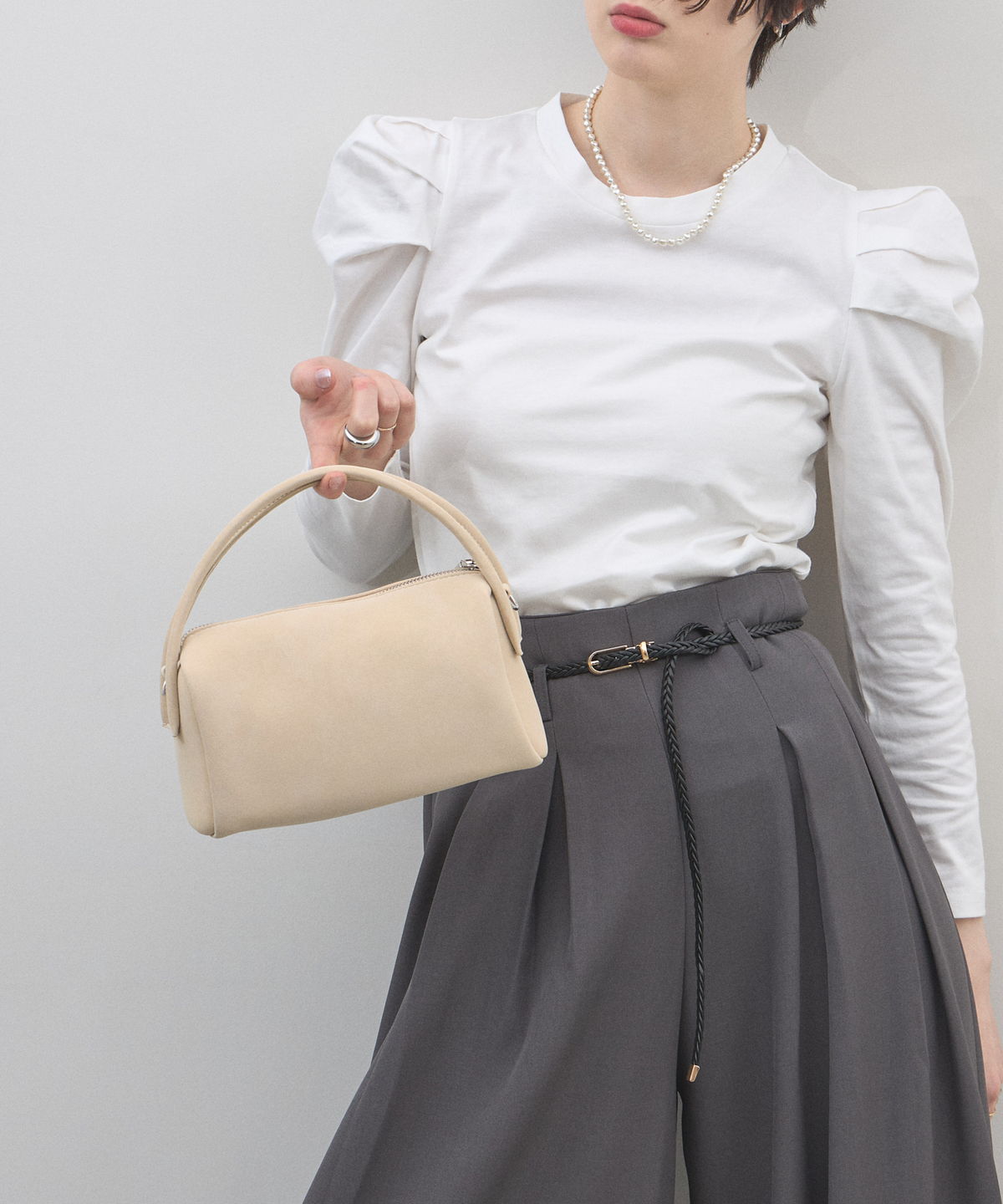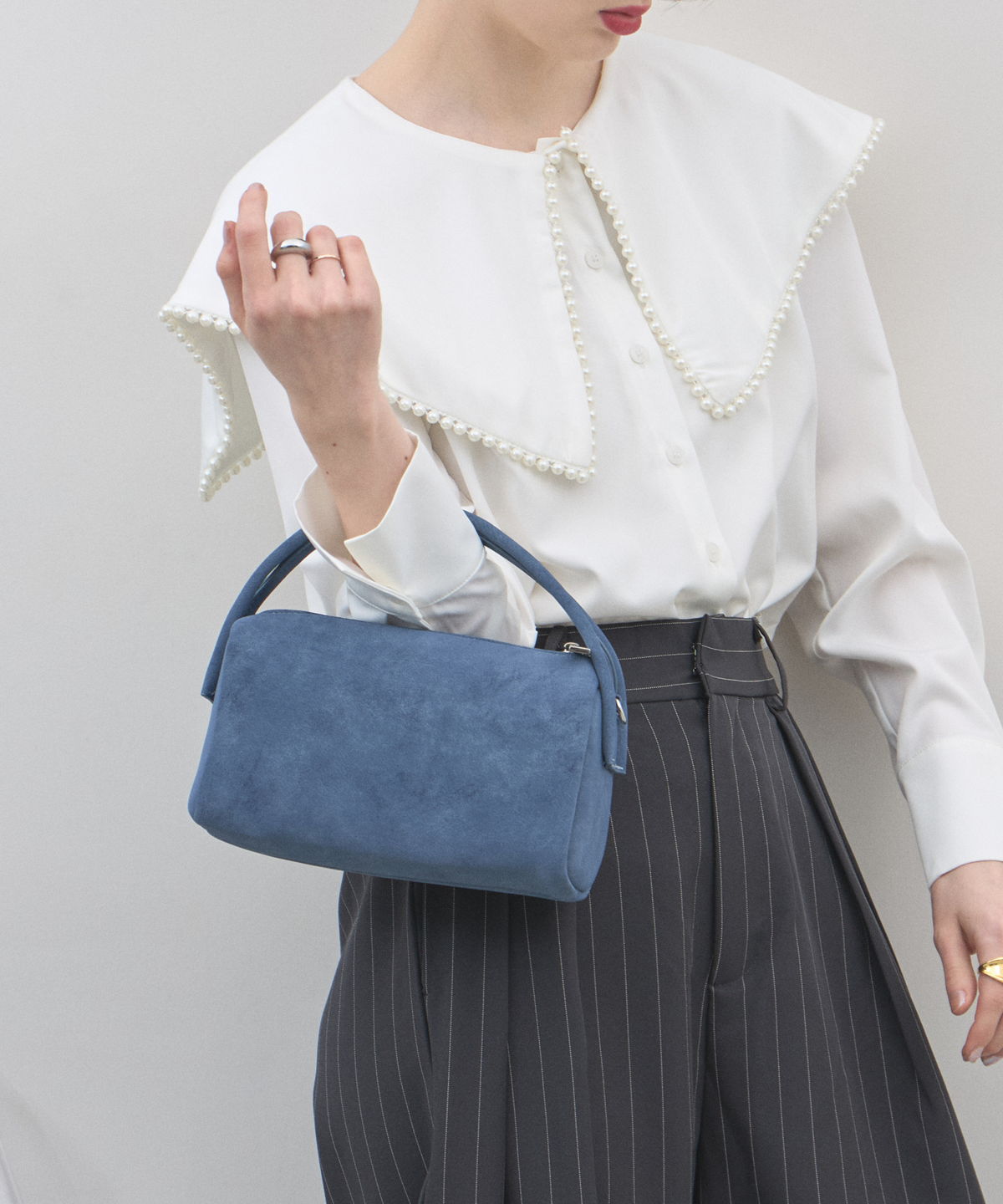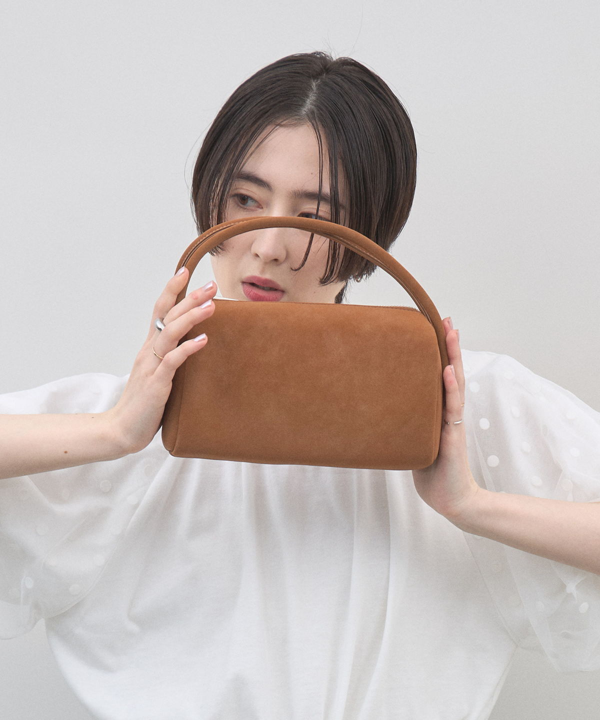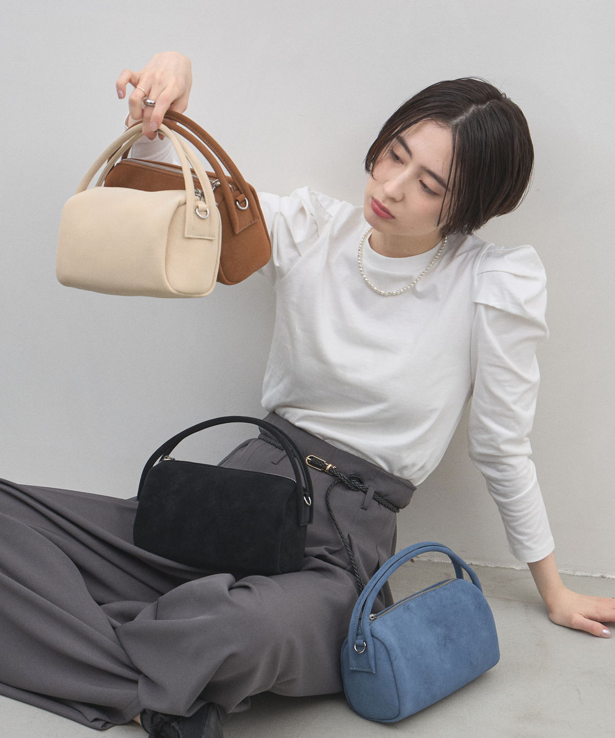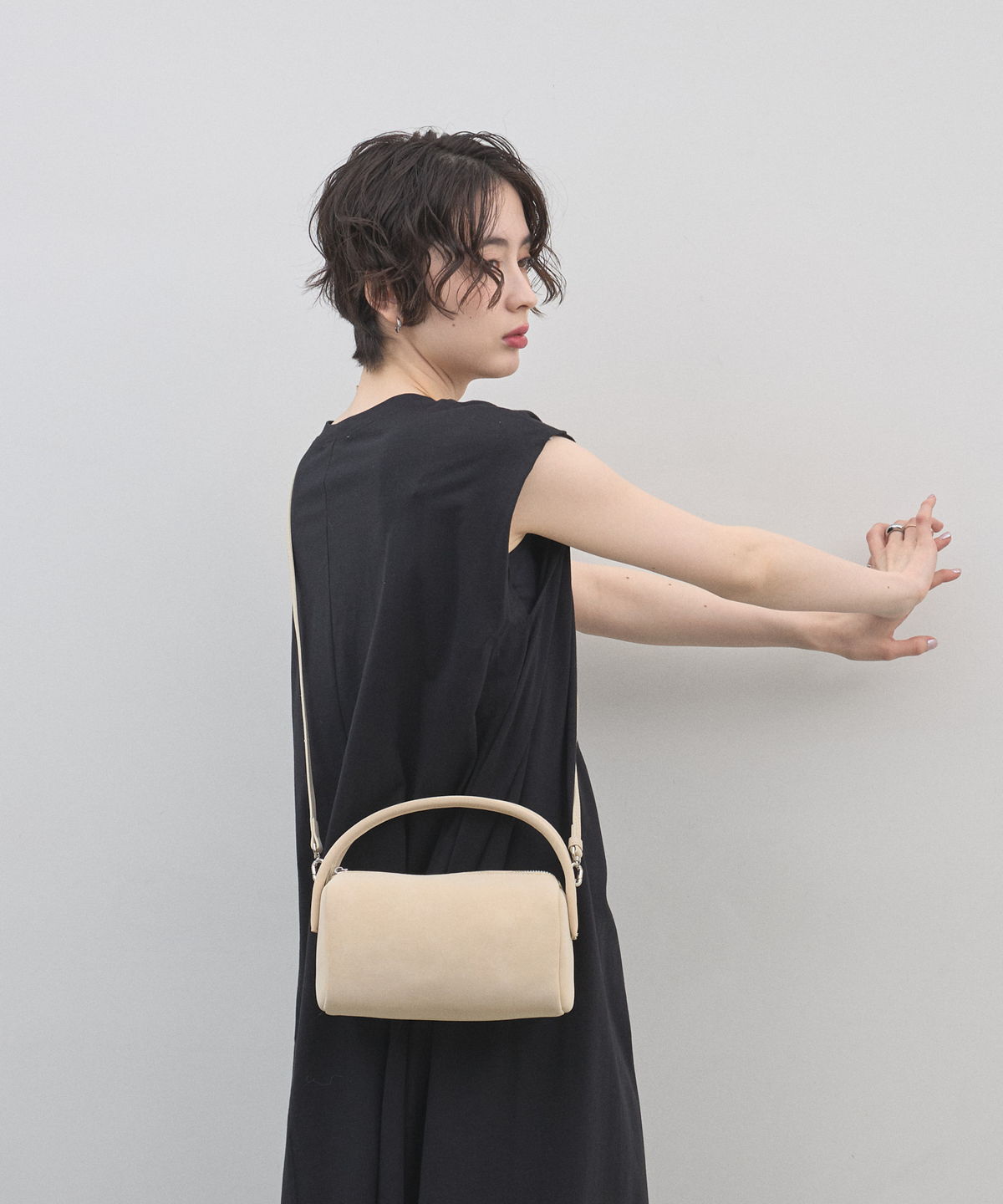 | 商品説明 | : | 季節を愛でる質感を、日常に。優しく手元に馴染む、 スエード調ミニボストンバッグ。 思わず触れたくなるような、きめ細やかで柔らかなスエードタッチの素材を使用したミニバッグ。 端正な長方形のボストン型に、丸みのあるハンドルを組み合わせることで、モードな気品と大人の可愛らしさを両立させました。 落ち着いたトーンのベージュやブルー、シックなブラックなど、 どんなコーディネートにも溶け込みつつ、素材のコントラストで奥行きを与えてくれるカラーバリエーションも魅力。 シンプルなTシャツやスラックスと合わせるだけで、スタイリングに季節感と上質なニュアンスをプラスしてくれます。 コンパクトな見た目ながら、しっかりとしたマチで必需品をスマートに収納できる、デイリーの頼れるパートナーです。 |