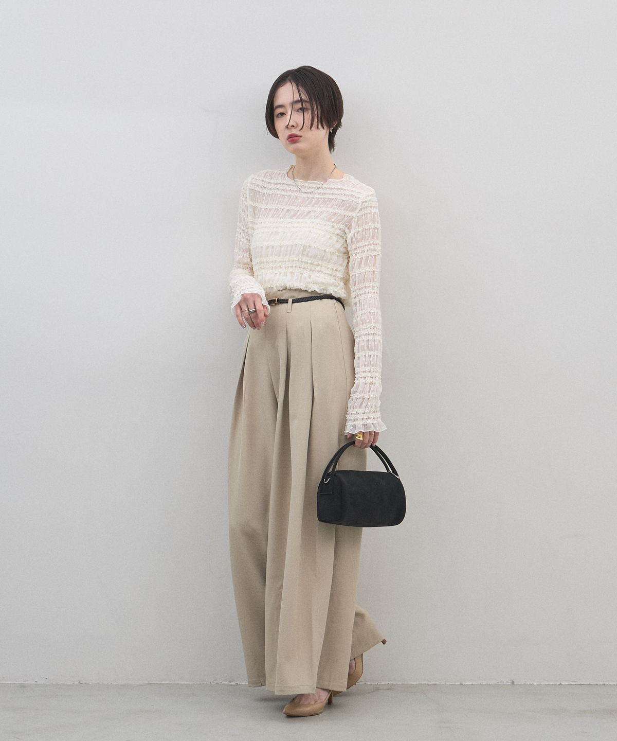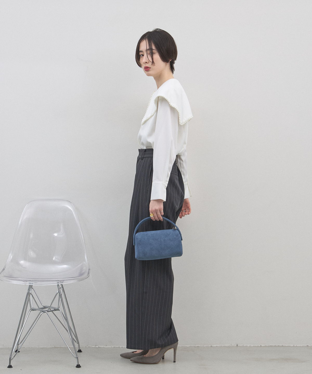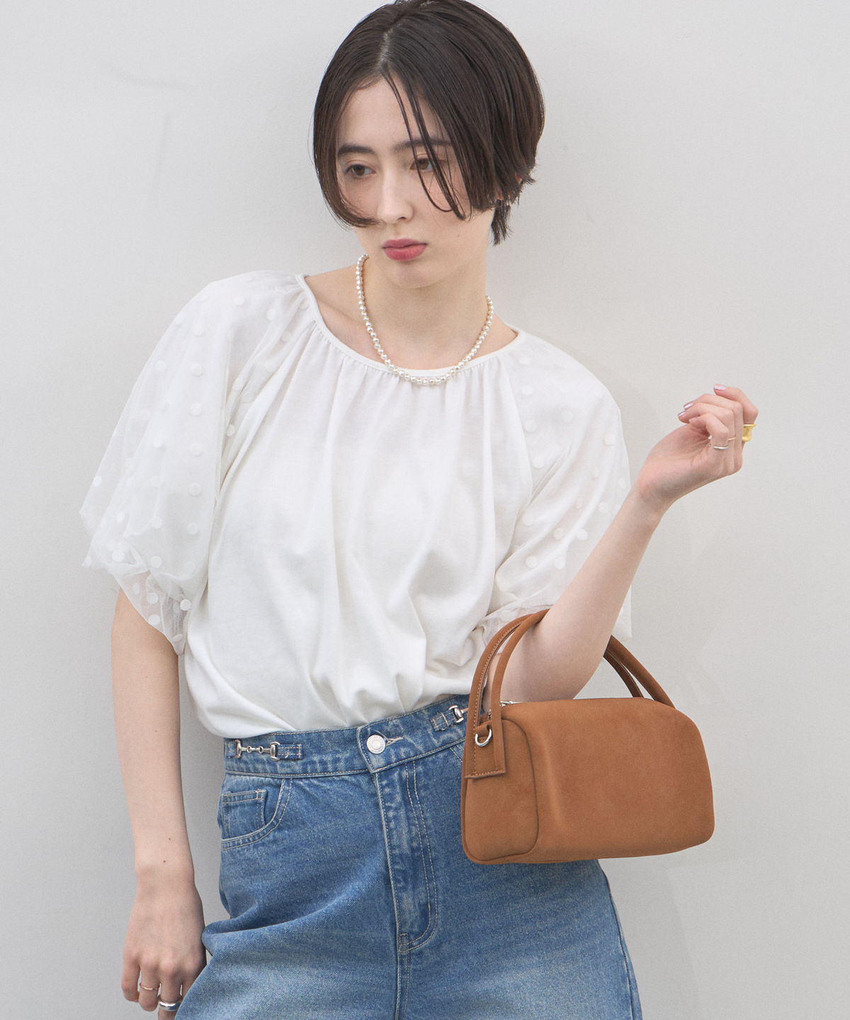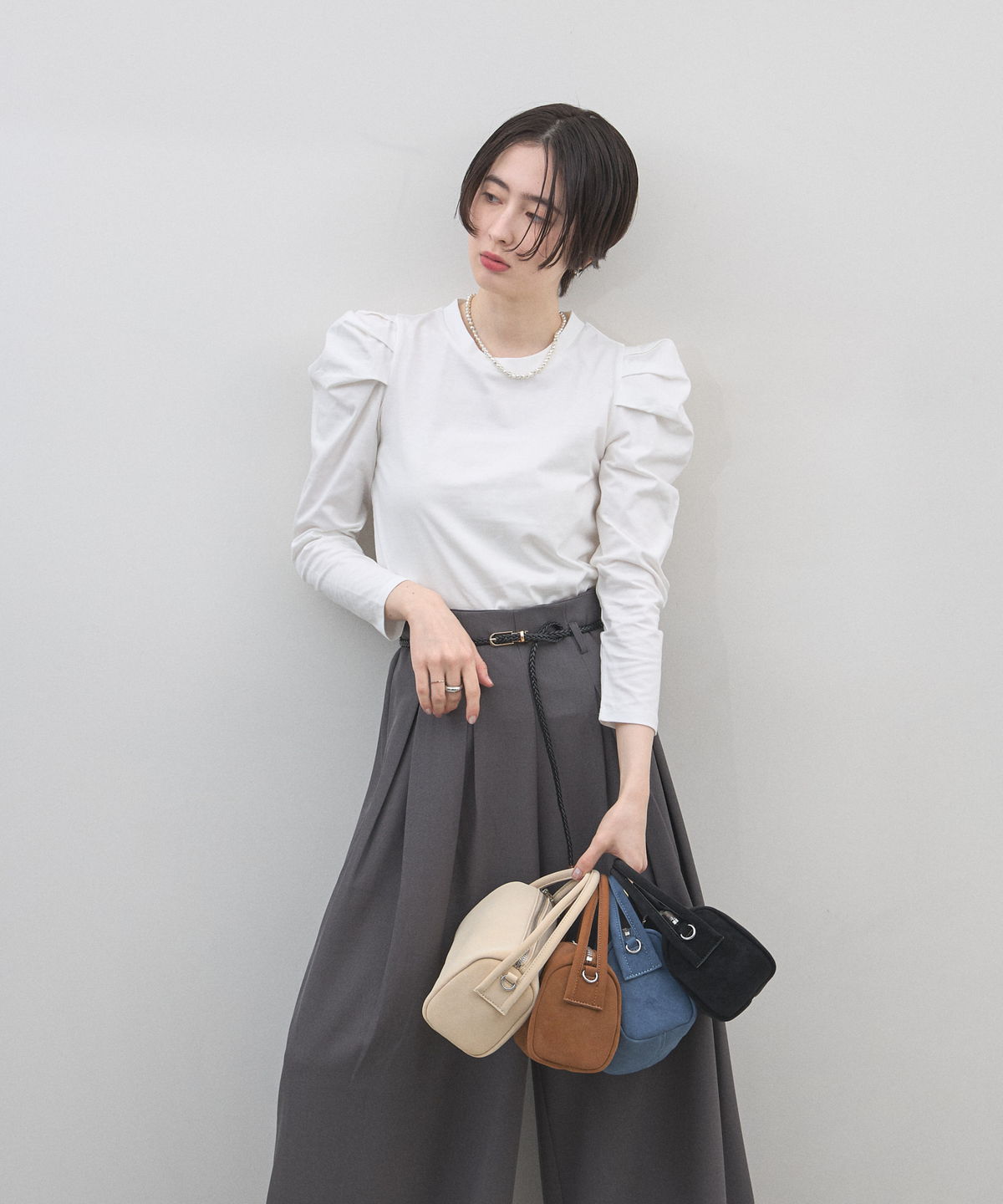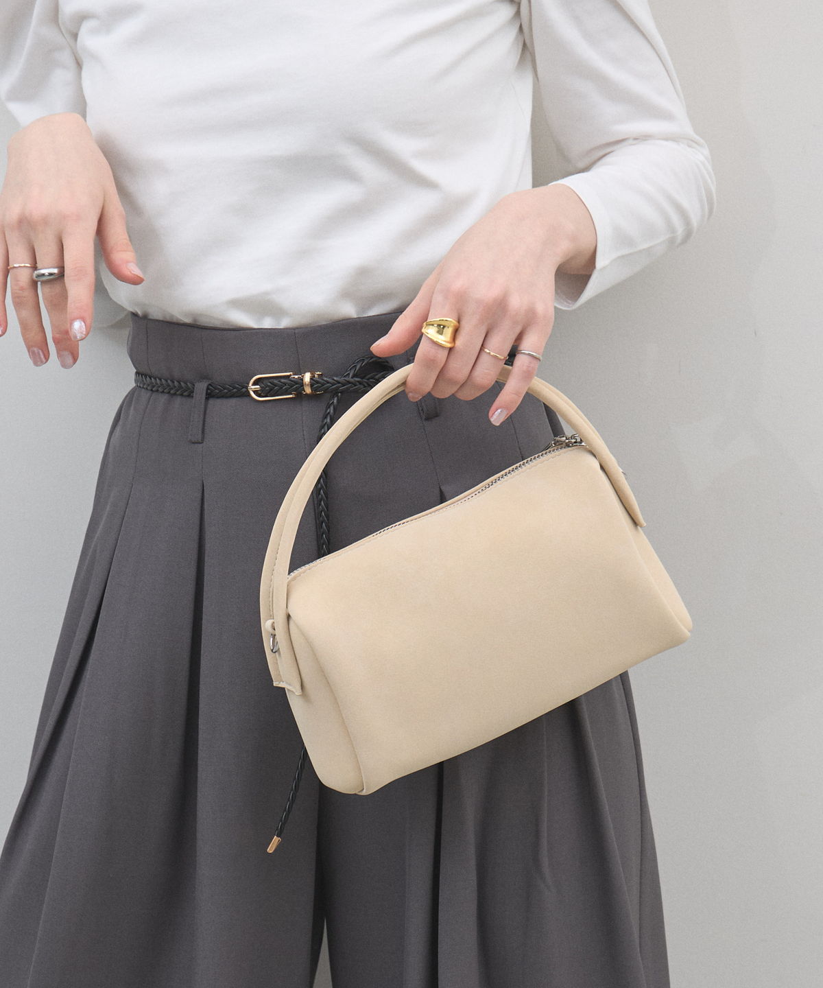 | 商品説明 | : | 季節を愛でる質感を、日常に。優しく手元に馴染む、 スエード調ミニボストンバッグ。 思わず触れたくなるような、きめ細やかで柔らかなスエードタッチの素材を使用したミニバッグ。 端正な長方形のボストン型に、丸みのあるハンドルを組み合わせることで、モードな気品と大人の可愛らしさを両立させました。 落ち着いたトーンのベージュやブルー、シックなブラックなど、 どんなコーディネートにも溶け込みつつ、素材のコントラストで奥行きを与えてくれるカラーバリエーションも魅力。 シンプルなTシャツやスラックスと合わせるだけで、スタイリングに季節感と上質なニュアンスをプラスしてくれます。 コンパクトな見た目ながら、しっかりとしたマチで必需品をスマートに収納できる、デイリーの頼れるパートナーです。 |