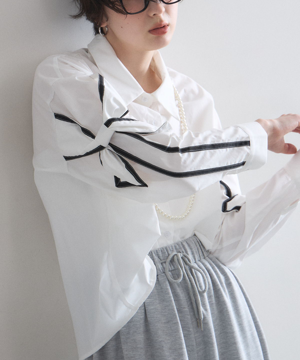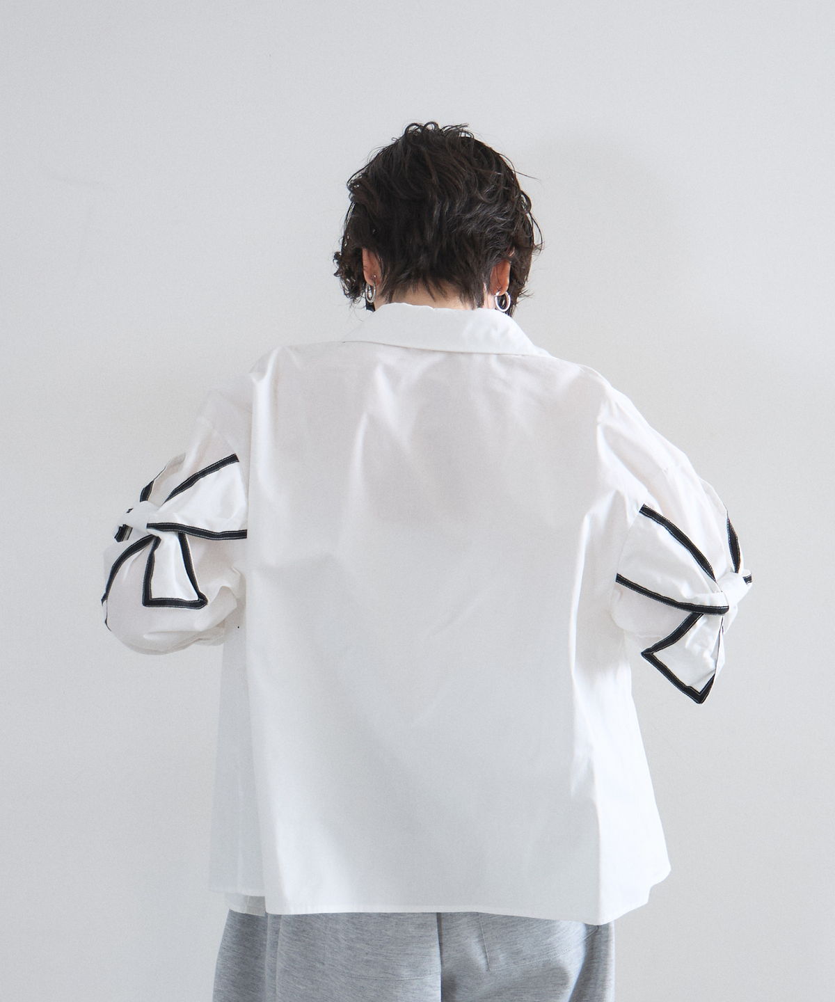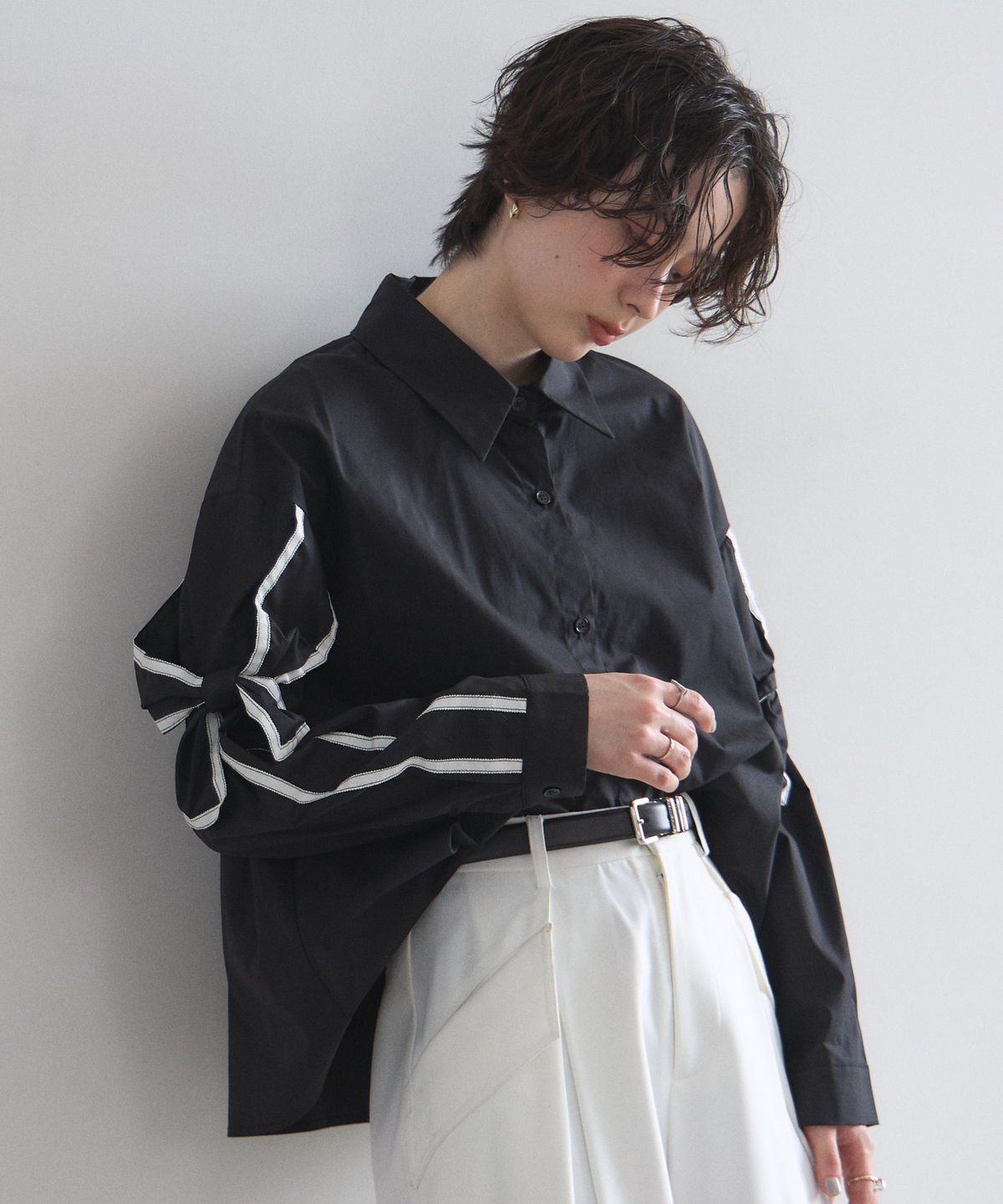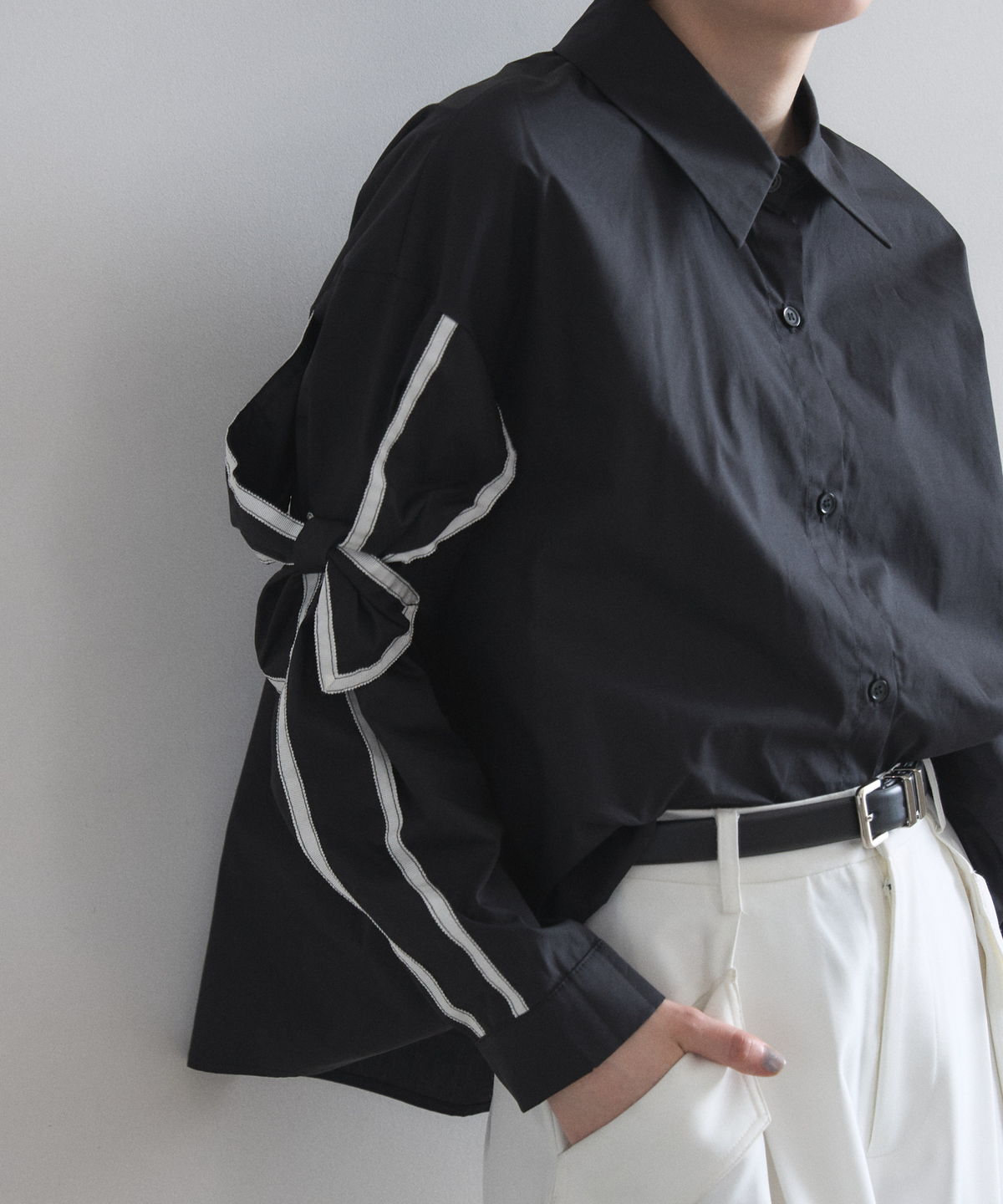 | 商品説明 | : | 袖のリボンデザインが目を惹く、大人可愛い主役級ブラウス。 袖にあしらわれた大胆なバイカラーのリボンモチーフが、1枚で華やかな印象を与えてくれるブラウスです。 ゆったりとしたワイドシルエットで抜け感を出しつつ、クリーンなシャツ襟が上品さをキープ。 モノトーン配色なので甘くなりすぎず、パンツにもスカートにも合わせやすい一着です。 |